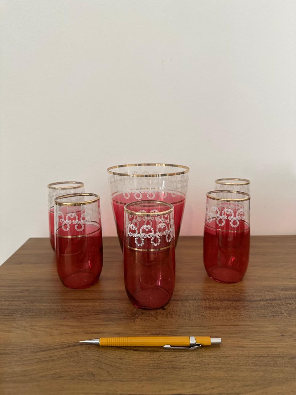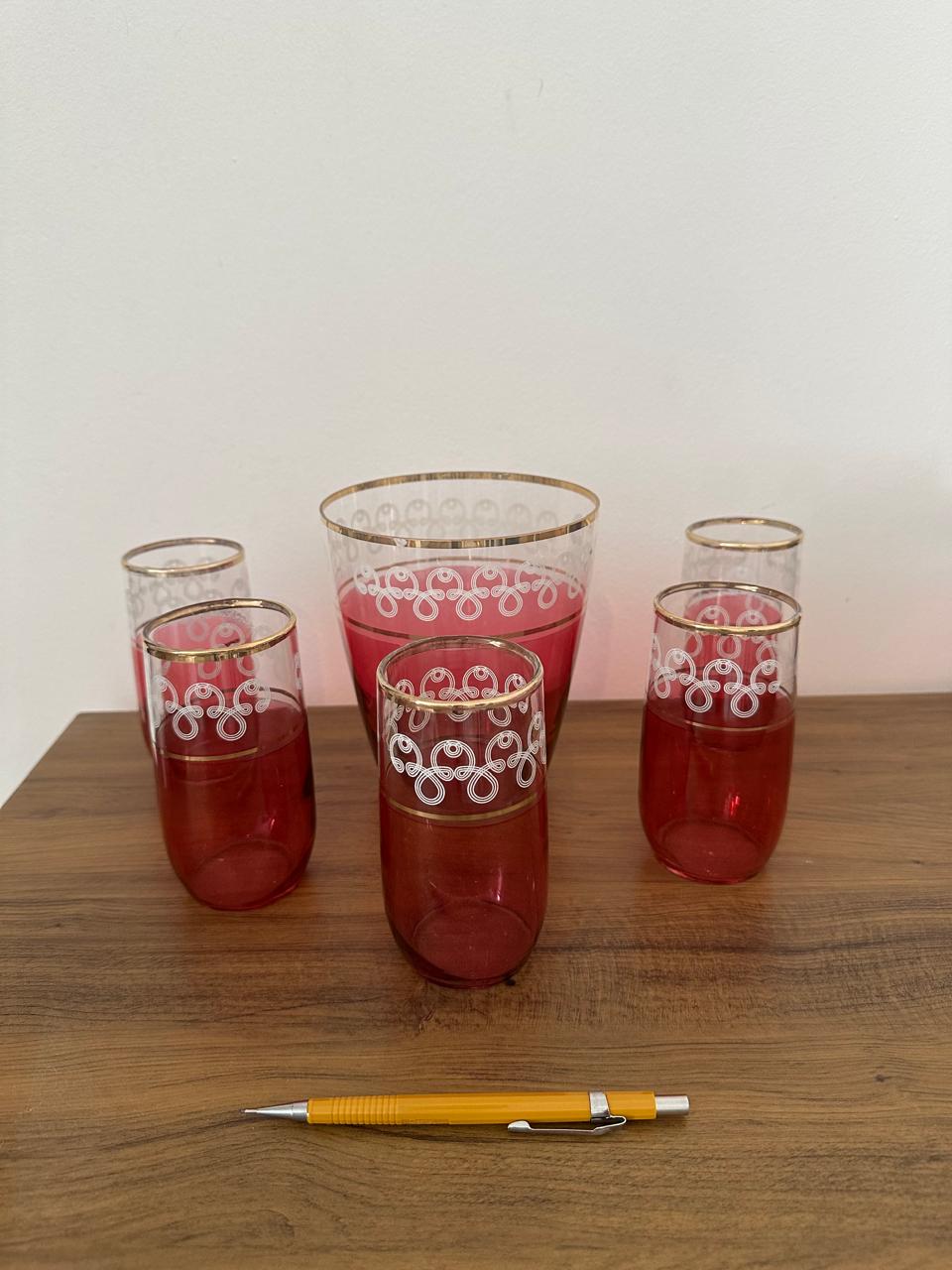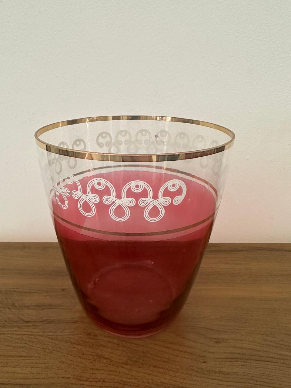 CONJUNTO ANTIGO DE 5 COPOS E BALDE – VIDRO – PEÇAS ANOS 1960 – COR ROSÉ + DETALHES BRANCO E DOURADO – O BALDE TEM UM LEVE NICADO, QUE NÃO DESMERECE A PEÇA — I018.101