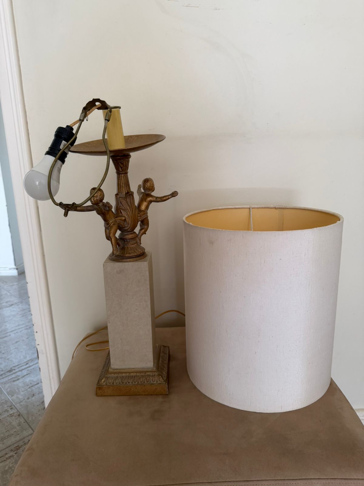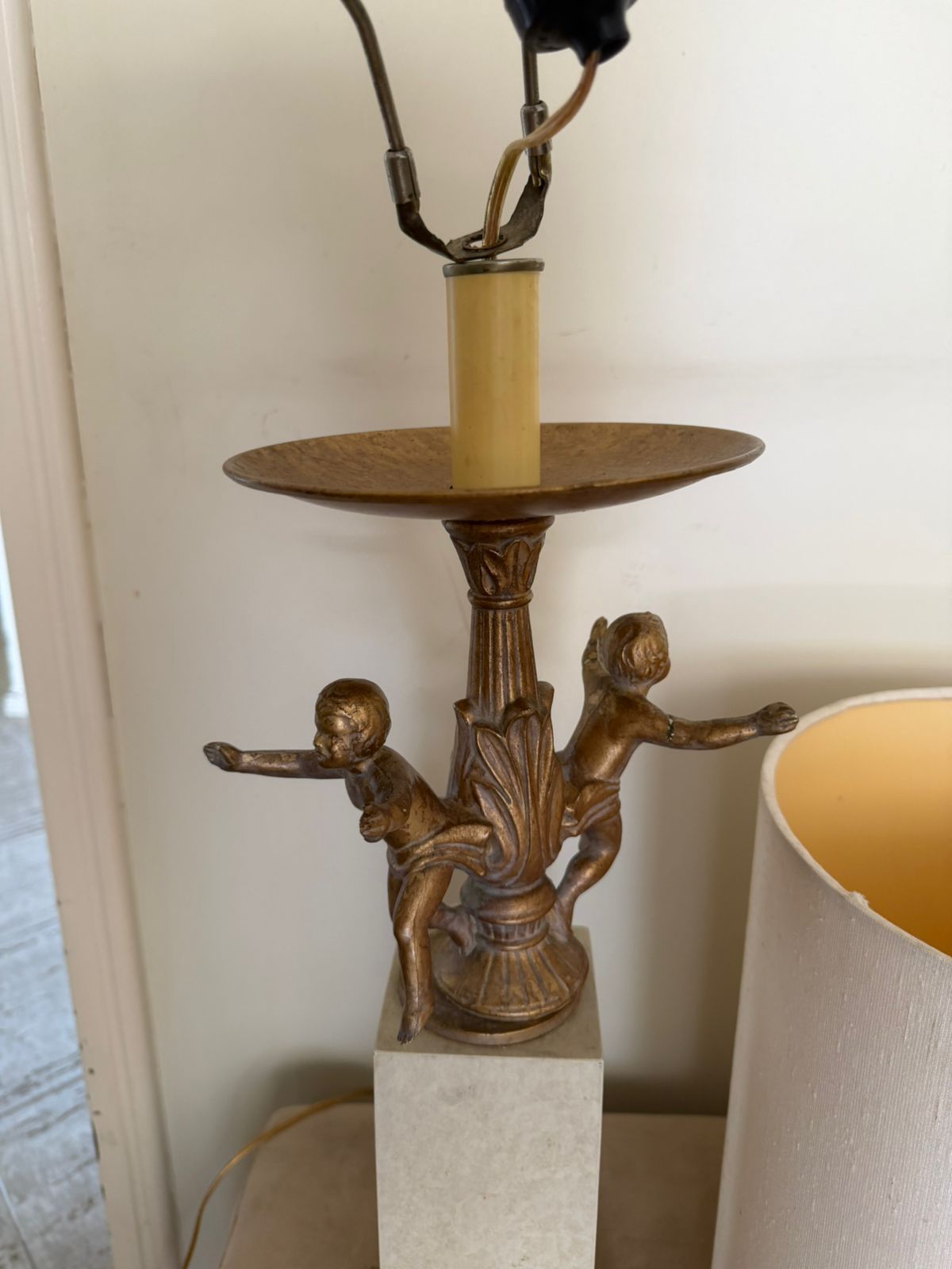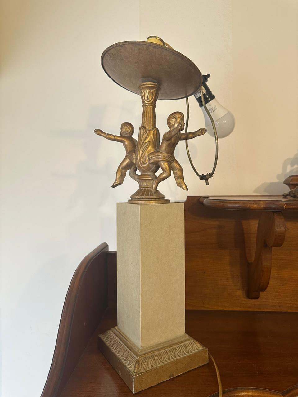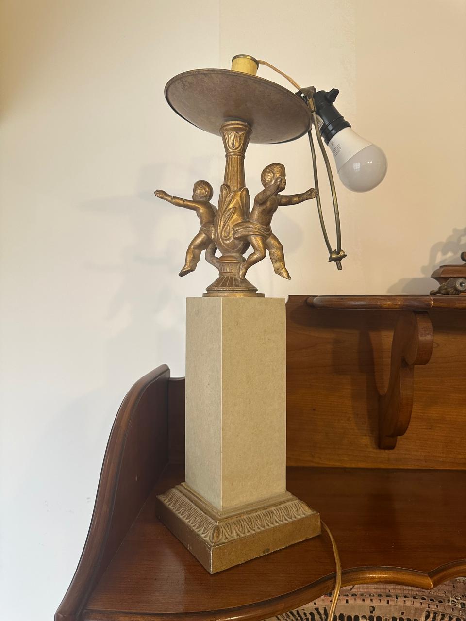 A estrutura é uma mistura de resina com pintura dourada na base e próximo à cúpula, onde está a escultra com as duas crianças e a haste torneada