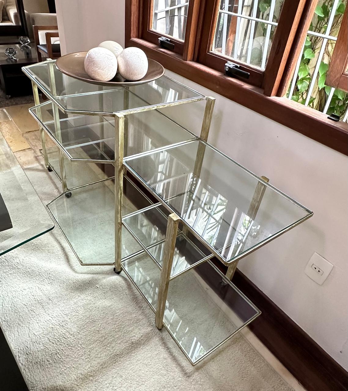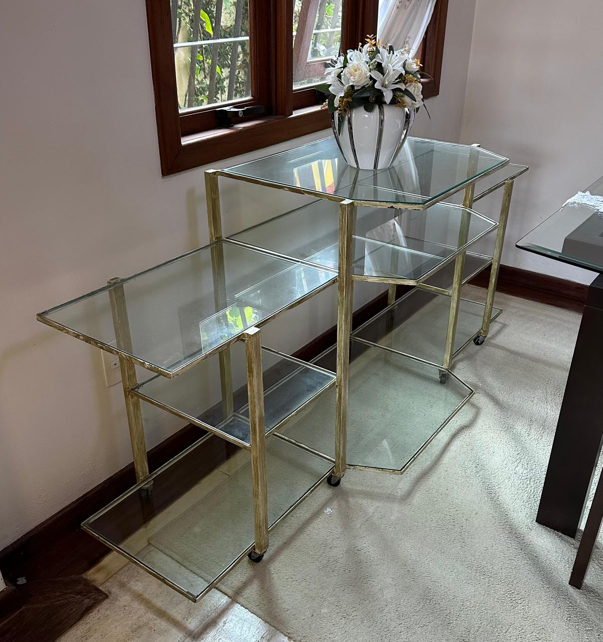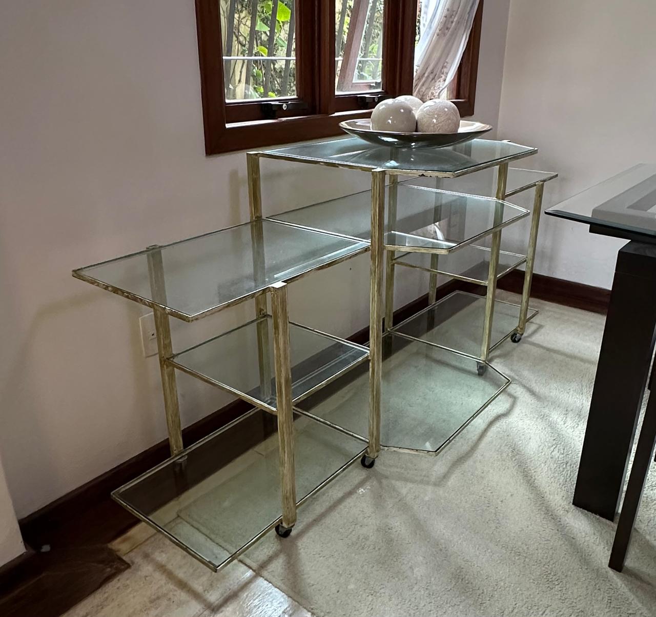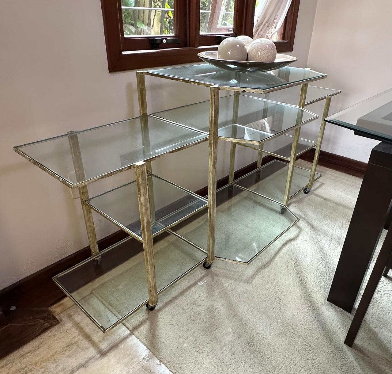 APARADOR FERRO – PINTURA QUE SE PARECE COM PÁTINA EM DOURADO ENVELHECIDO – RODÍZIO – TAMPOS DE VIDRO – UMA ÓTIMA IDEIA PARA EXPOSITOR DE LOJA OU ATELIÊ — D064.04