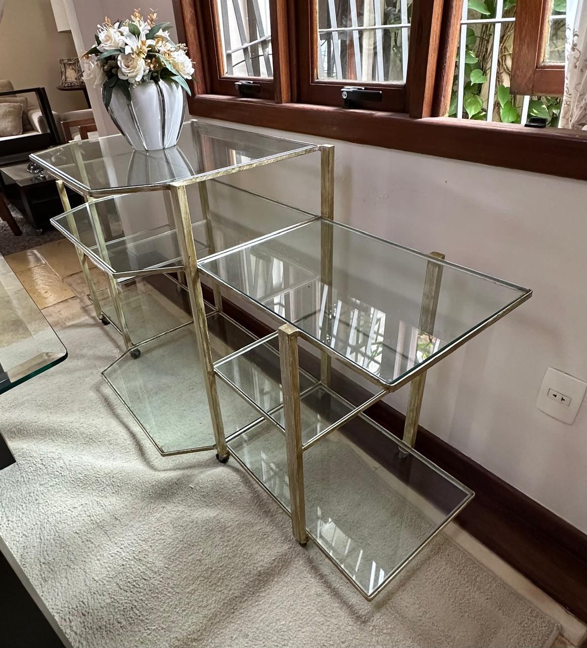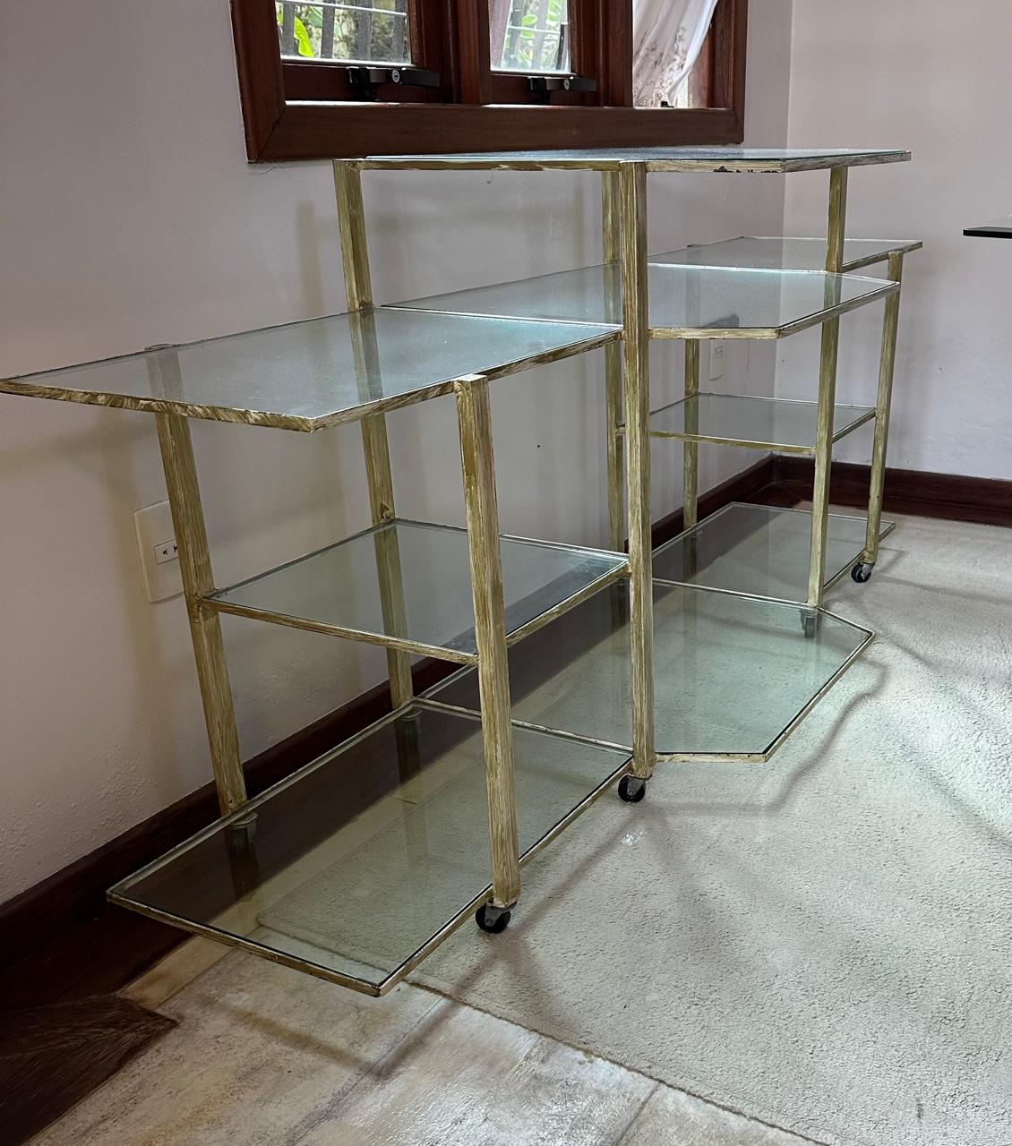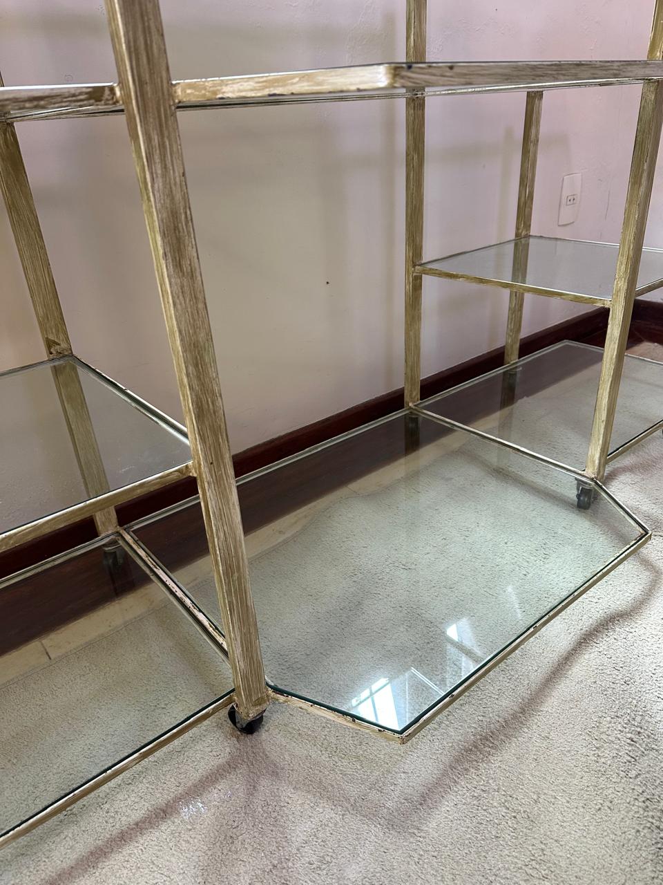 APARADOR FERRO – PINTURA QUE SE PARECE COM PÁTINA EM DOURADO ENVELHECIDO – RODÍZIO – TAMPOS DE VIDRO – UMA ÓTIMA IDEIA PARA EXPOSITOR DE LOJA OU ATELIÊ — D064.04