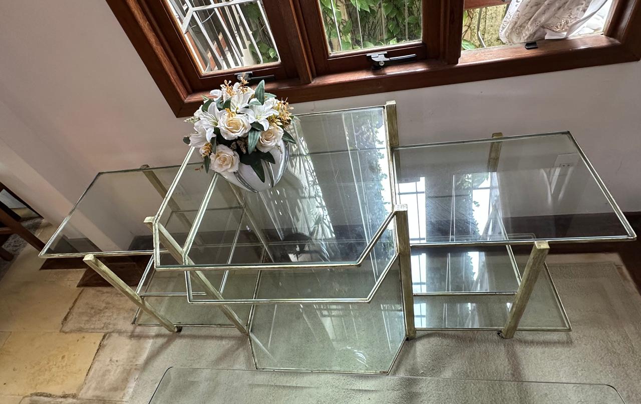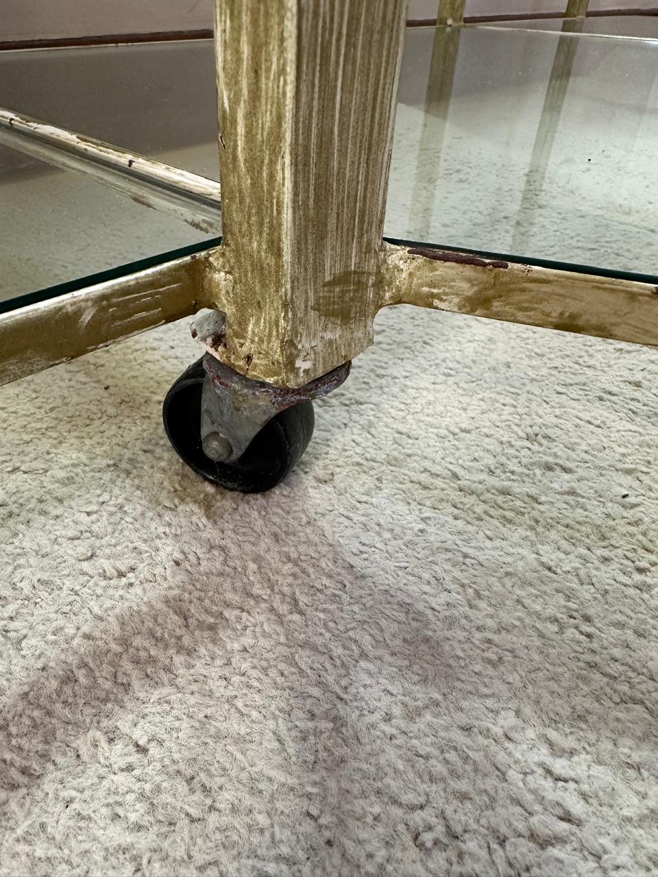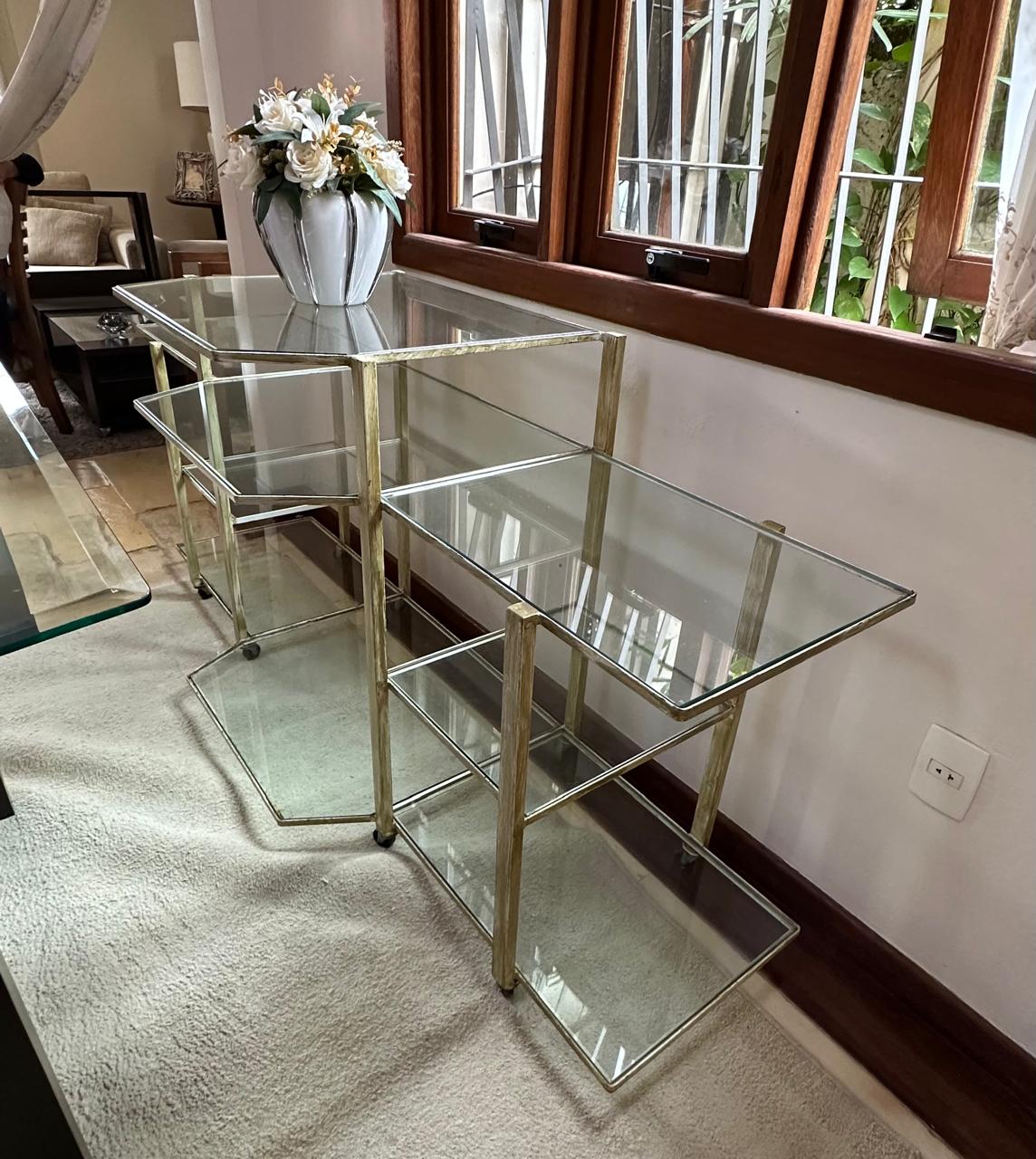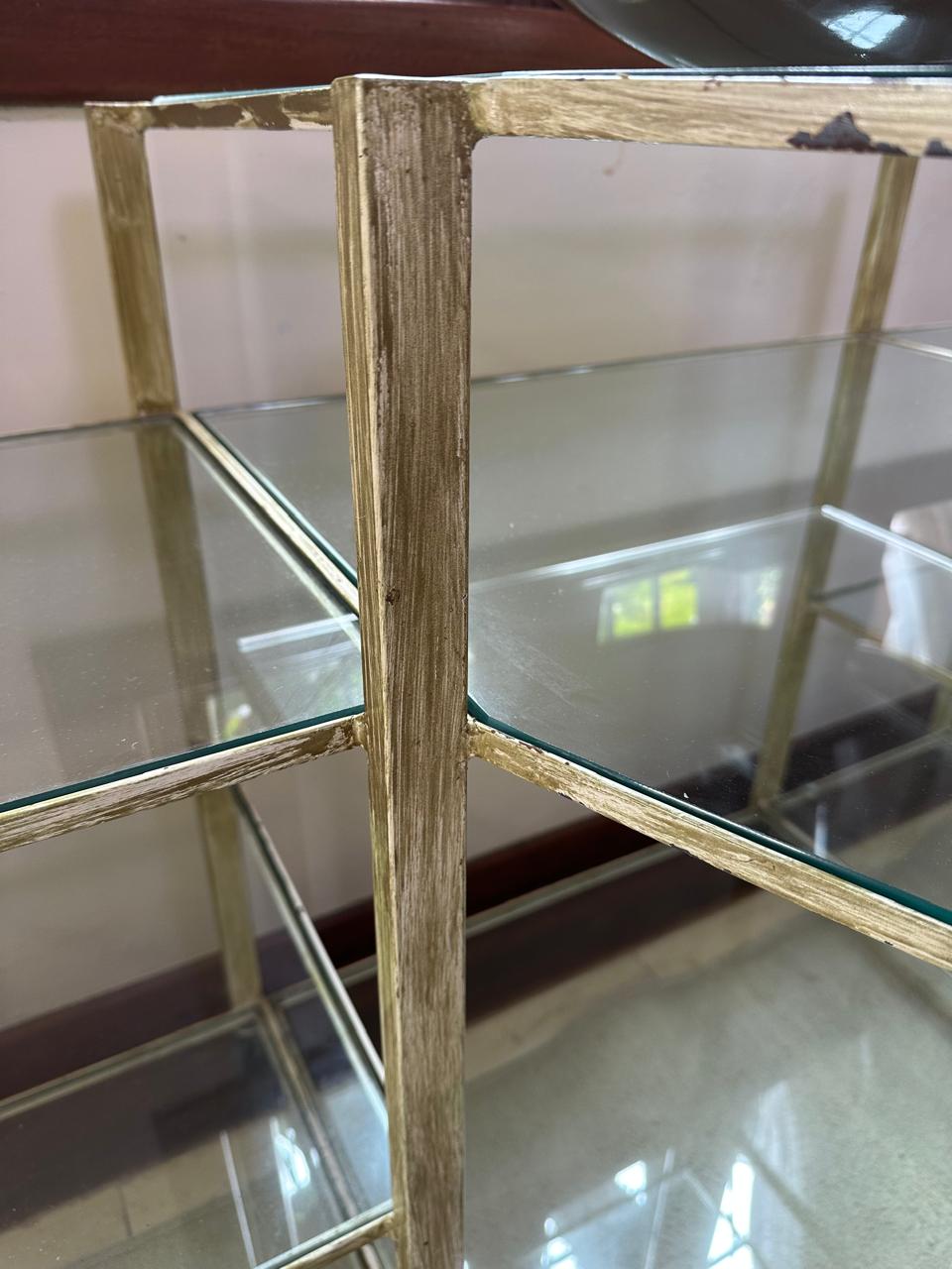 APARADOR FERRO – PINTURA QUE SE PARECE COM PÁTINA EM DOURADO ENVELHECIDO – RODÍZIO – TAMPOS DE VIDRO – UMA ÓTIMA IDEIA PARA EXPOSITOR DE LOJA OU ATELIÊ — D064.04