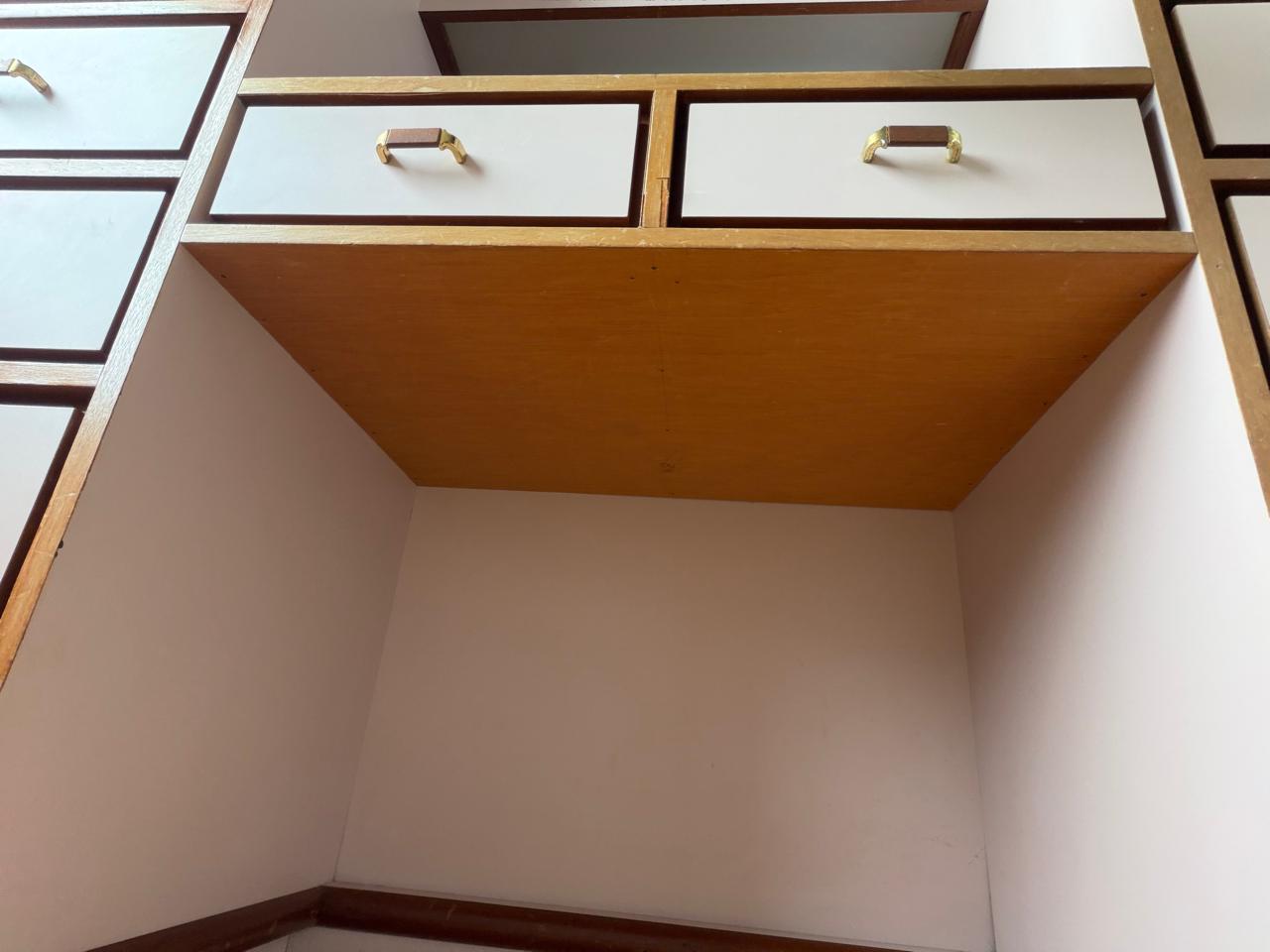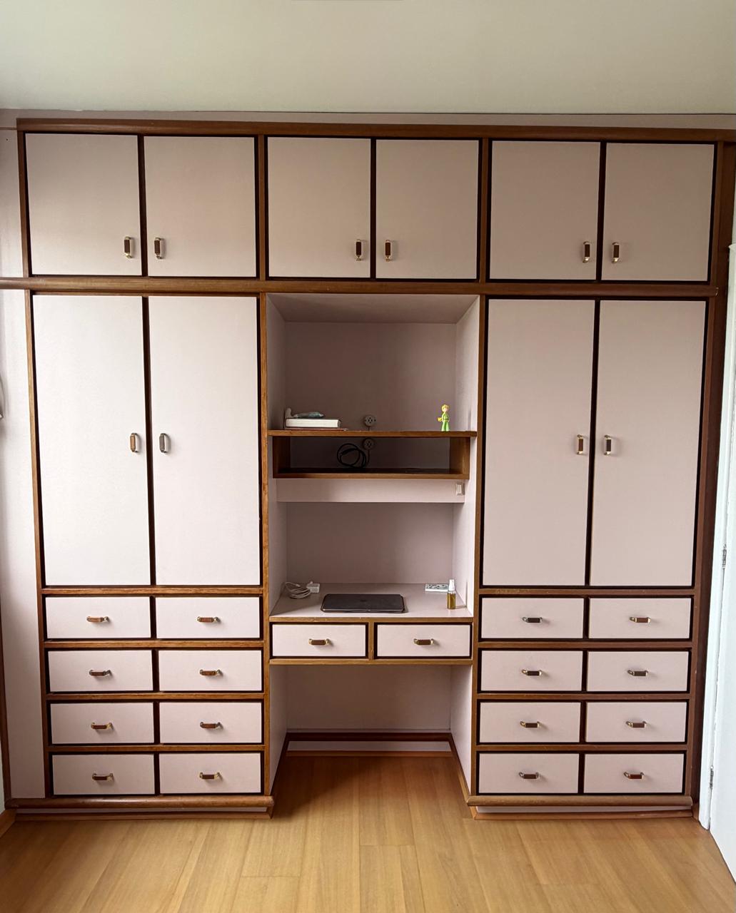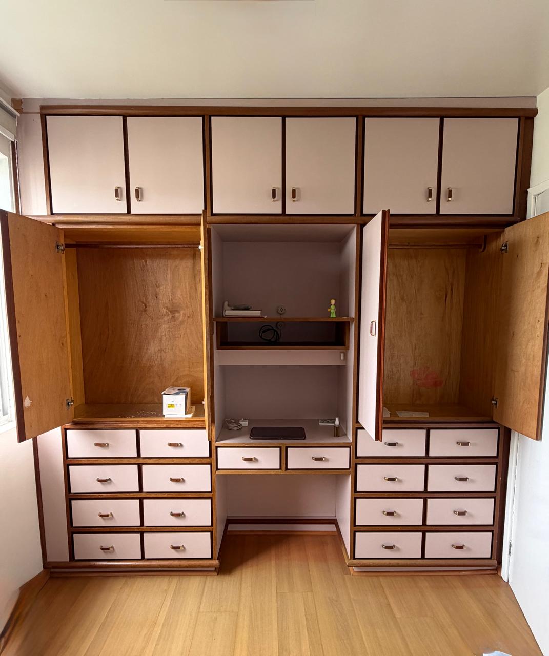 ARMÁRIO ANOS 1980 – MADEIRA + LÂMINA MADEIRA + LÂMINA ROSA CHÁ + PORTAS + GAVETAS + MALEIRO + ESCRIVANINHA + NICHO PARA TV — C094.03