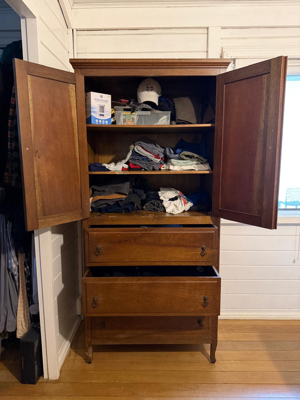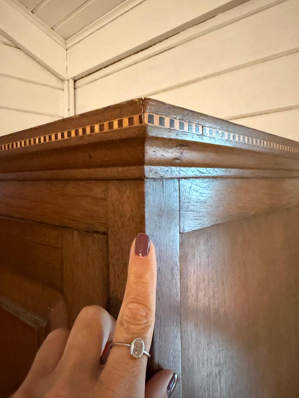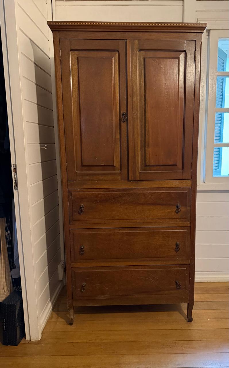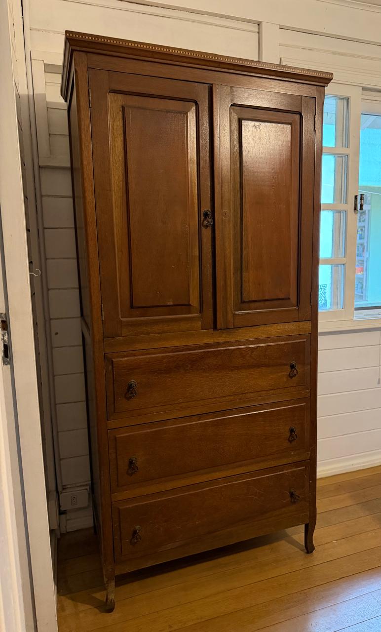 ARMÁRIO ROUPEIRO ANTIGO – MADEIRA MACIÇA – MARCHETARIA NO DETALHE – GAVETAS E PORTAS — A134.25
