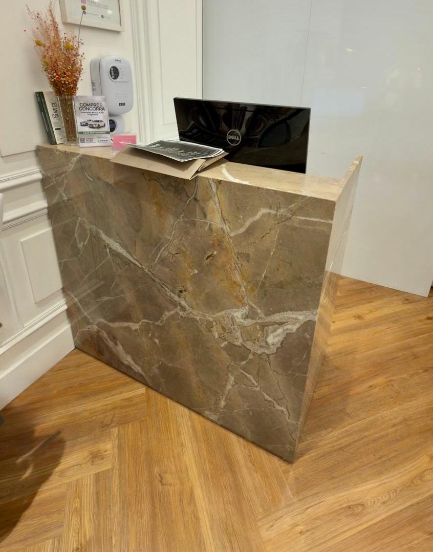 BALCÃO CAIXA EM L – MDF NA PARTE INTERNA COM GAVETAS, BANCADA E NICHOS – PEDRA ITALIANA — F060.109