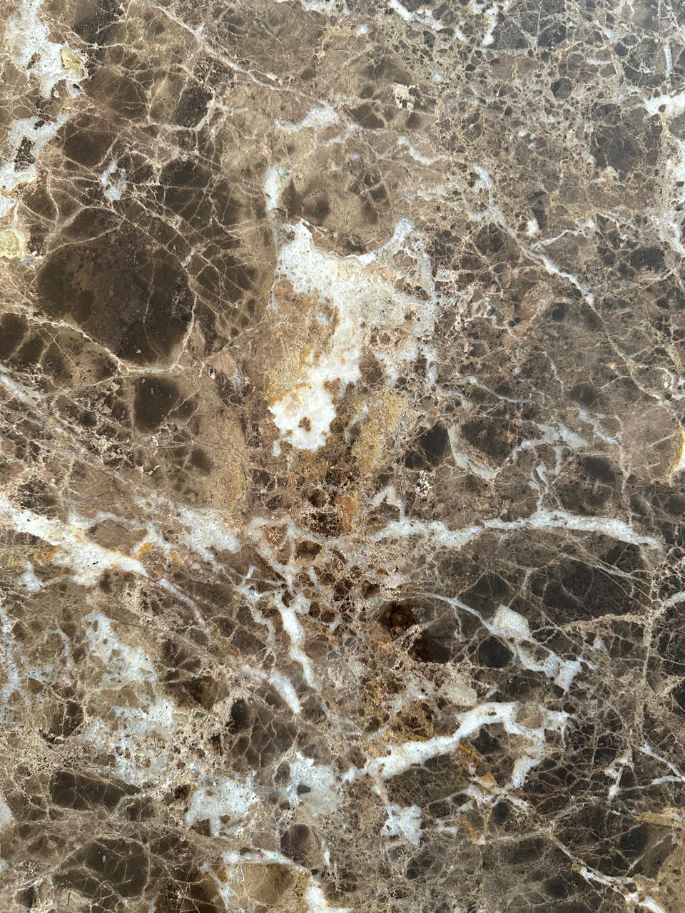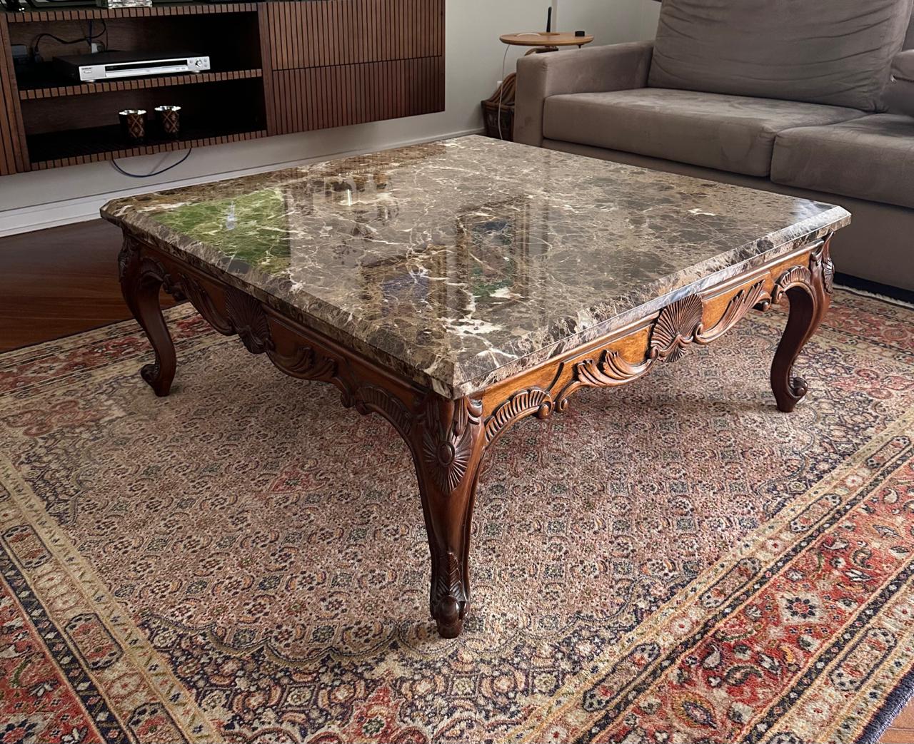 CLÁSSICA MESA DE CENTRO – PEDRA NOBRE – MÁRMORE EMPERADOR – ORIGINAL DA ESPANHA – BASE MADEIRA MACIÇA TORNEADA E ENTALHADA — R003.402