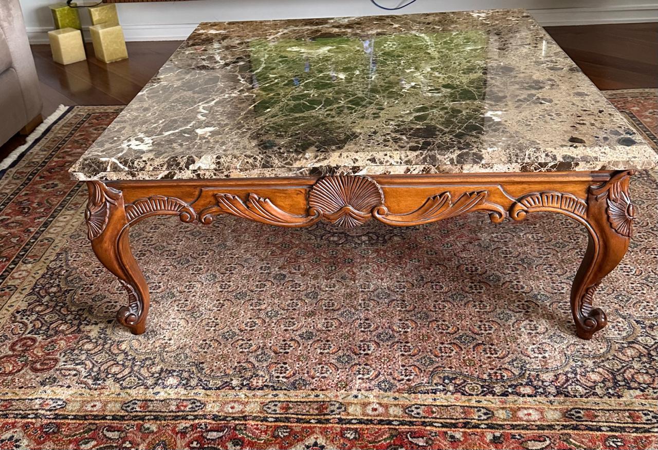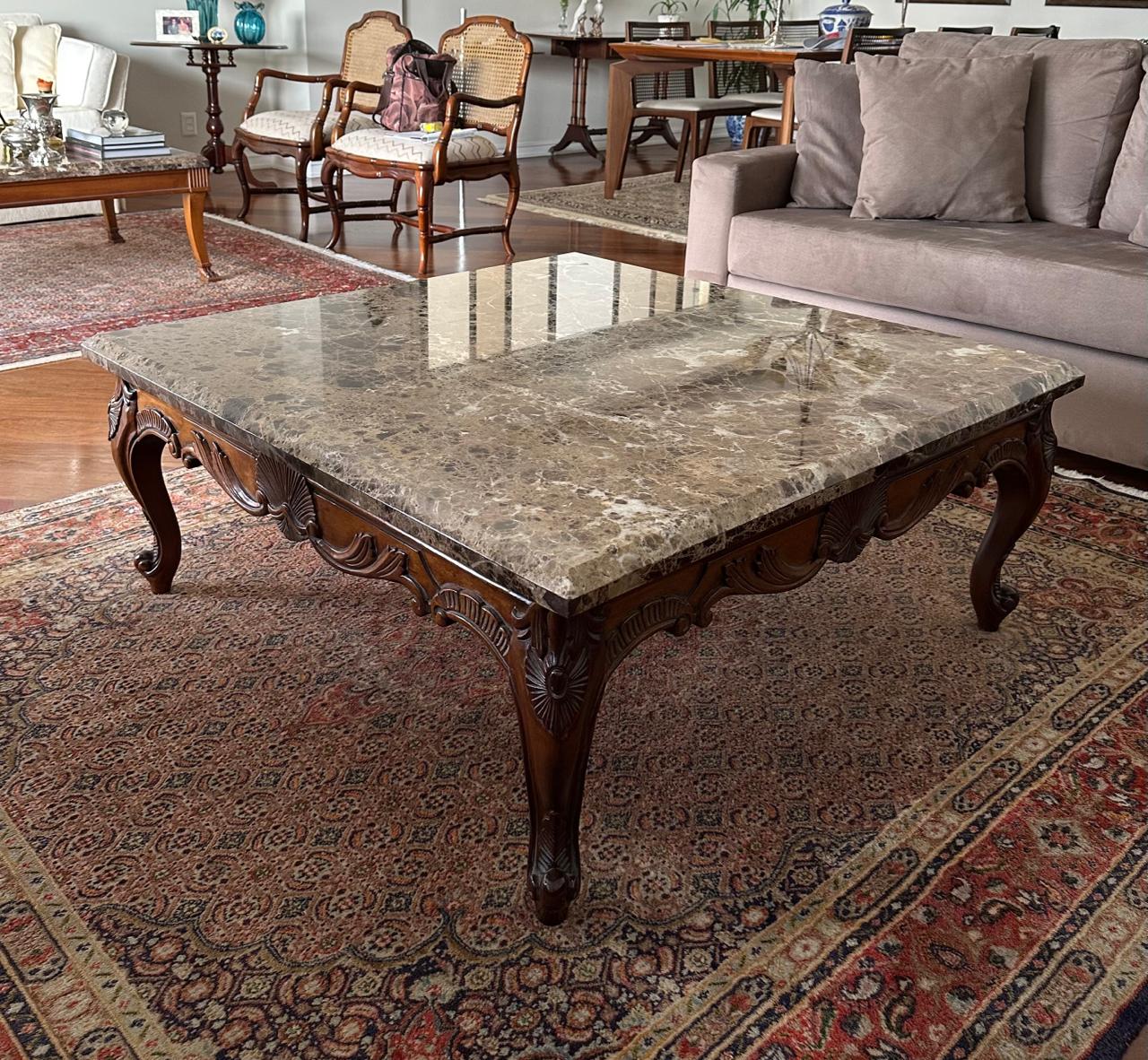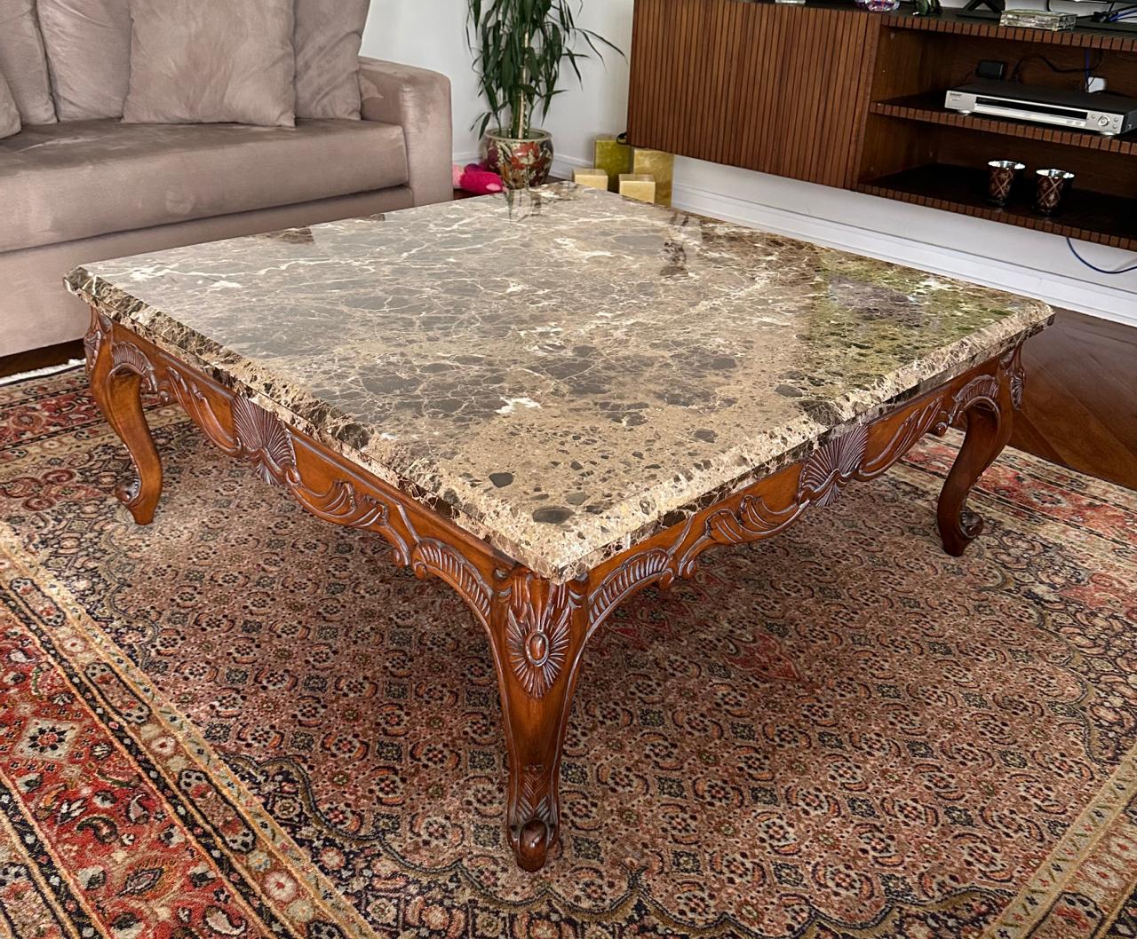 CLÁSSICA MESA DE CENTRO – PEDRA NOBRE – MÁRMORE “EMPERADOR”- ORIGINAL DA ESPANHA – BASE MADEIRA MACIÇA TORNEADA E ENTALHADA — R003.402
