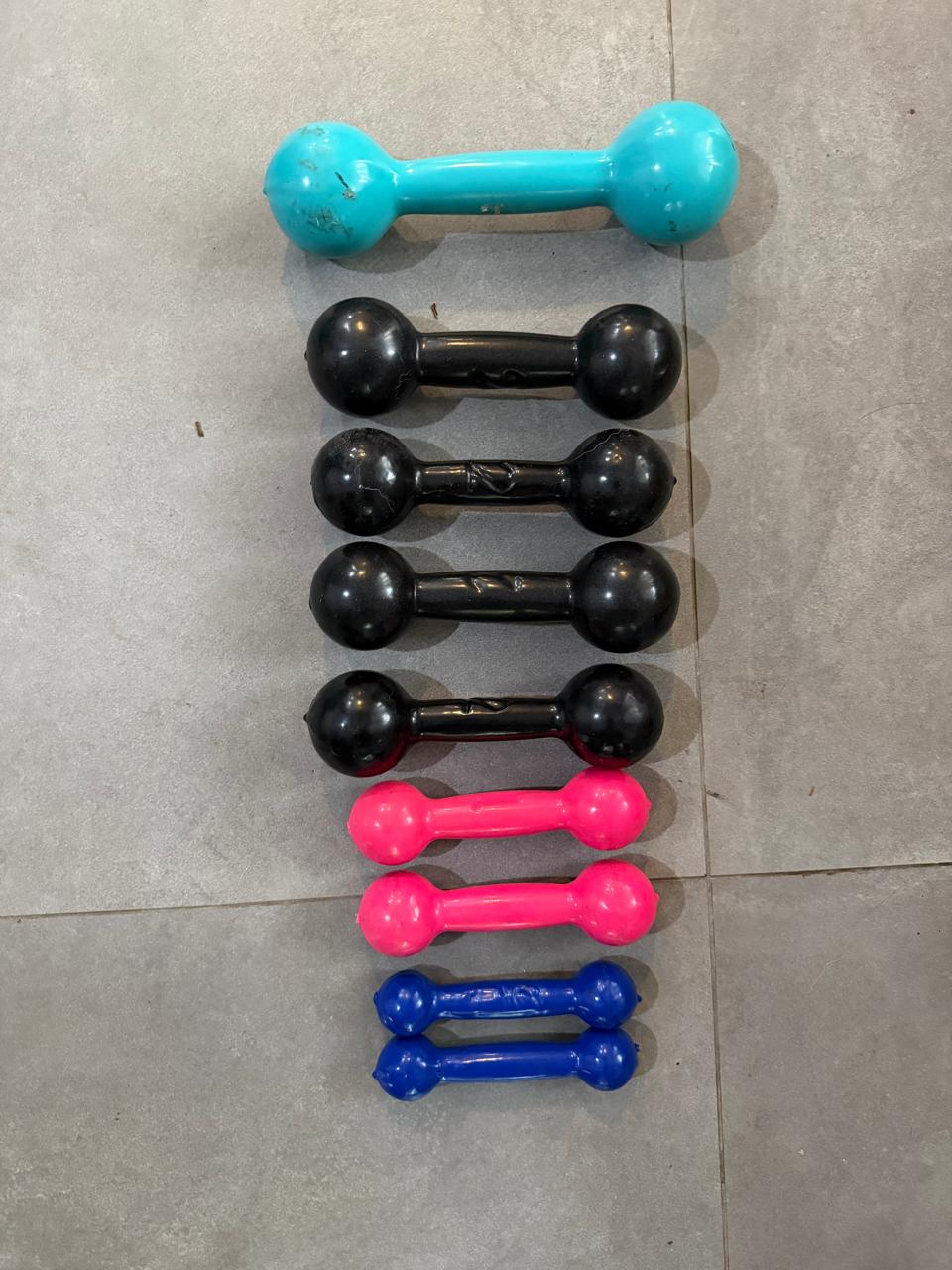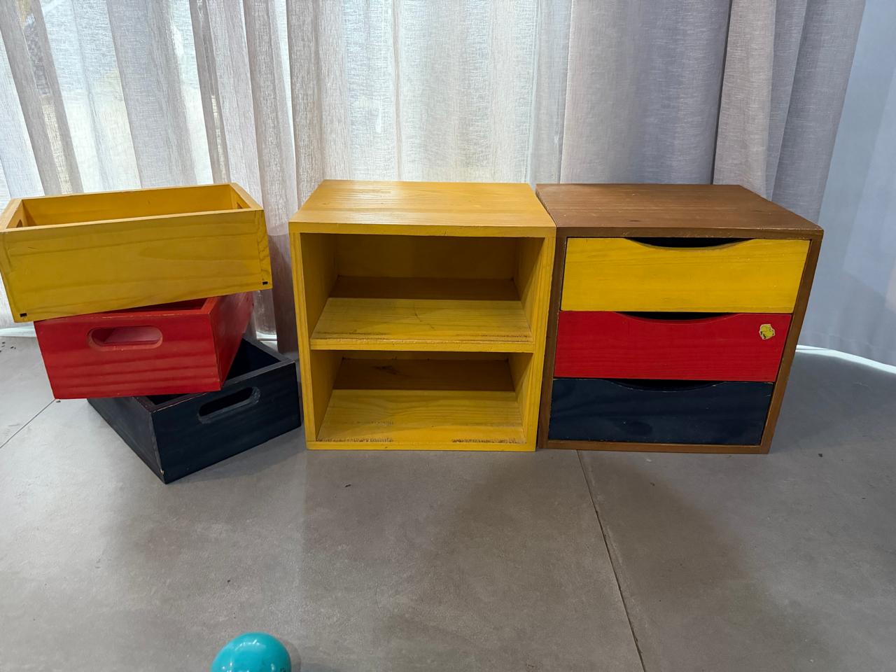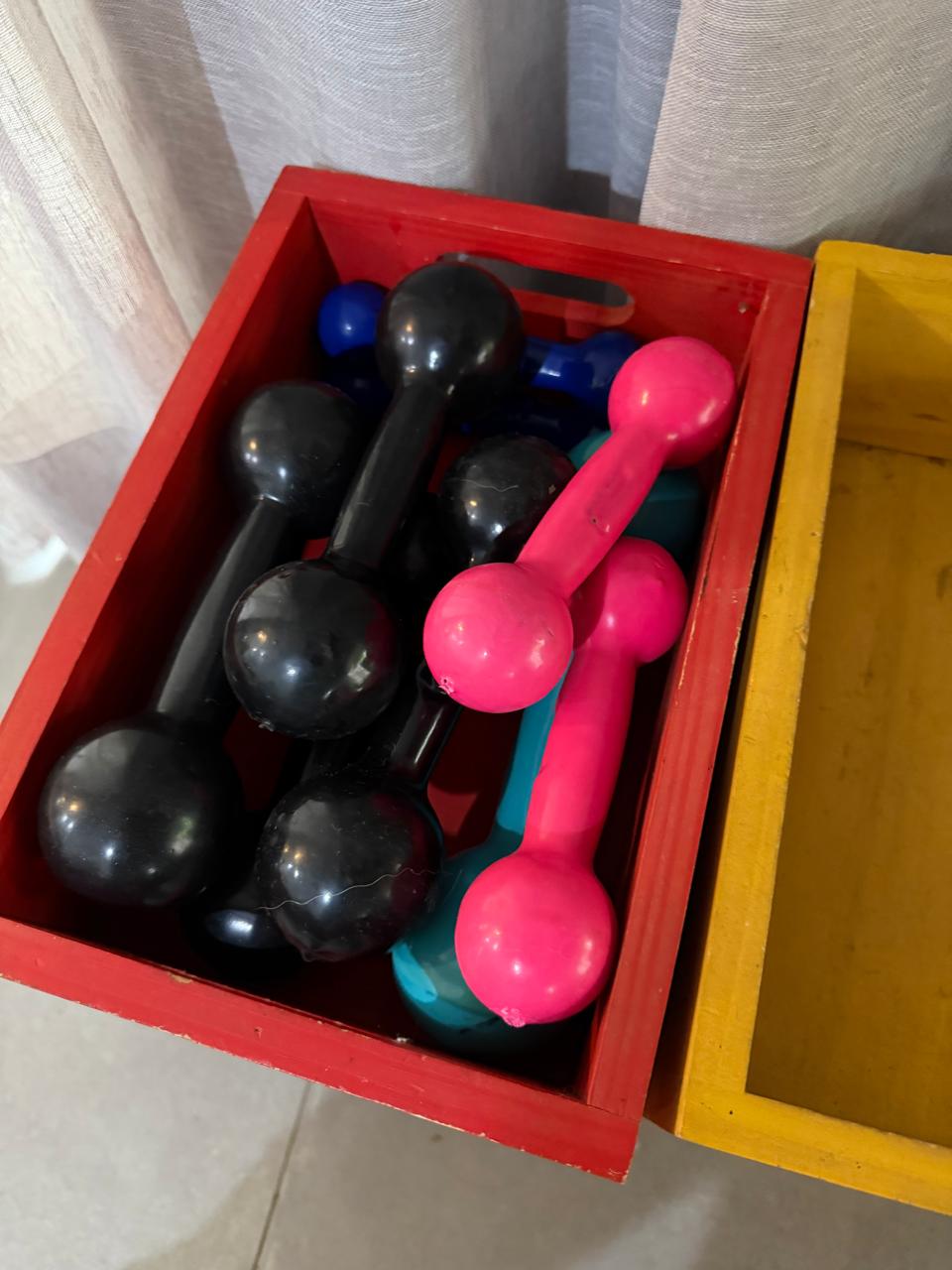 COMBO COLORIDO ! 3 MINI CAIXOTES + 1 MINI GAVETEIRO + 1 MINI ESTANTE – MADEIRA PINUS PINTADO + 9 HALTERES EMBORRACHADOS — A134.36