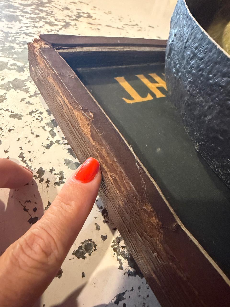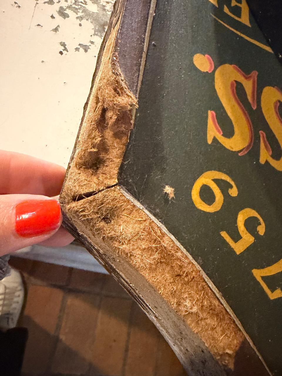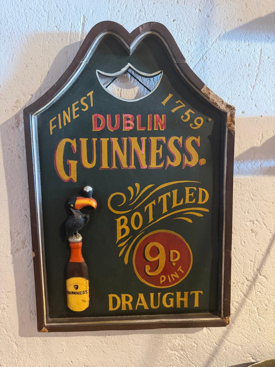 A peça em aglomerado – Guiness – está com pontos descascando, detalhe na foto