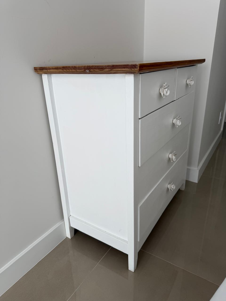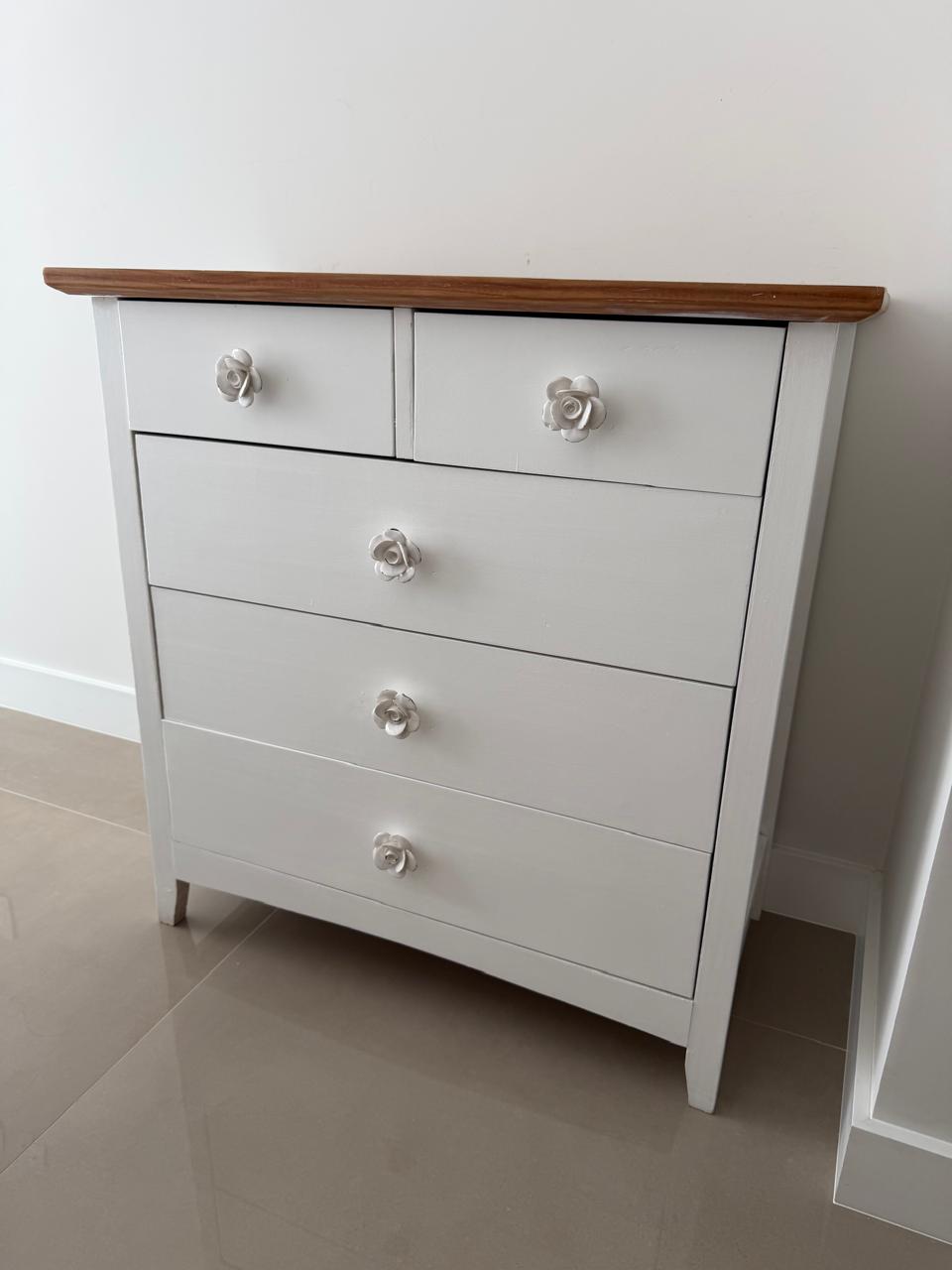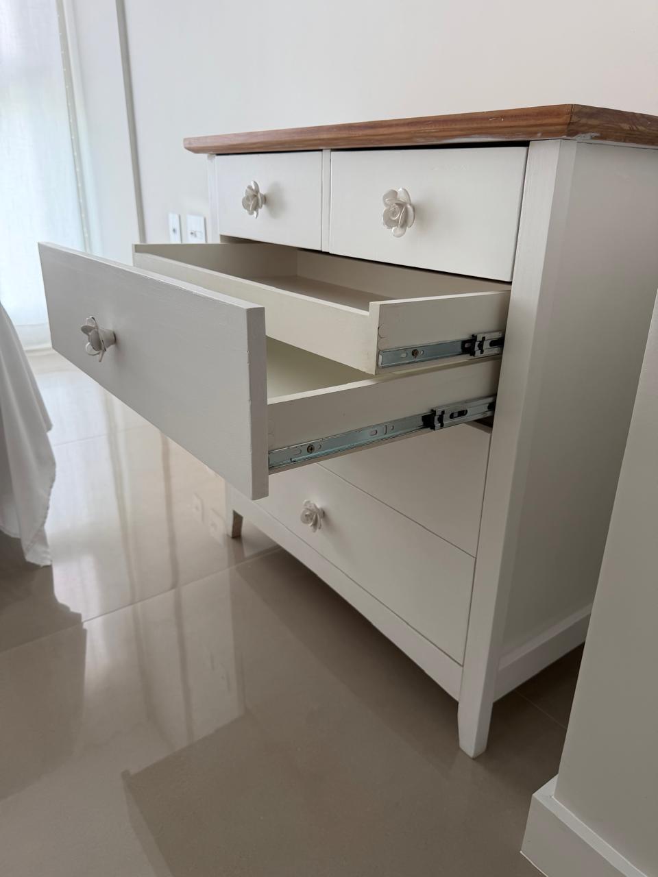 CÔMODA MADEIRA MACIÇA + PINTURA BRANCA + TAMPO NATURAL + PUXADORES CERÂMICA ESMALTADA — B050.14