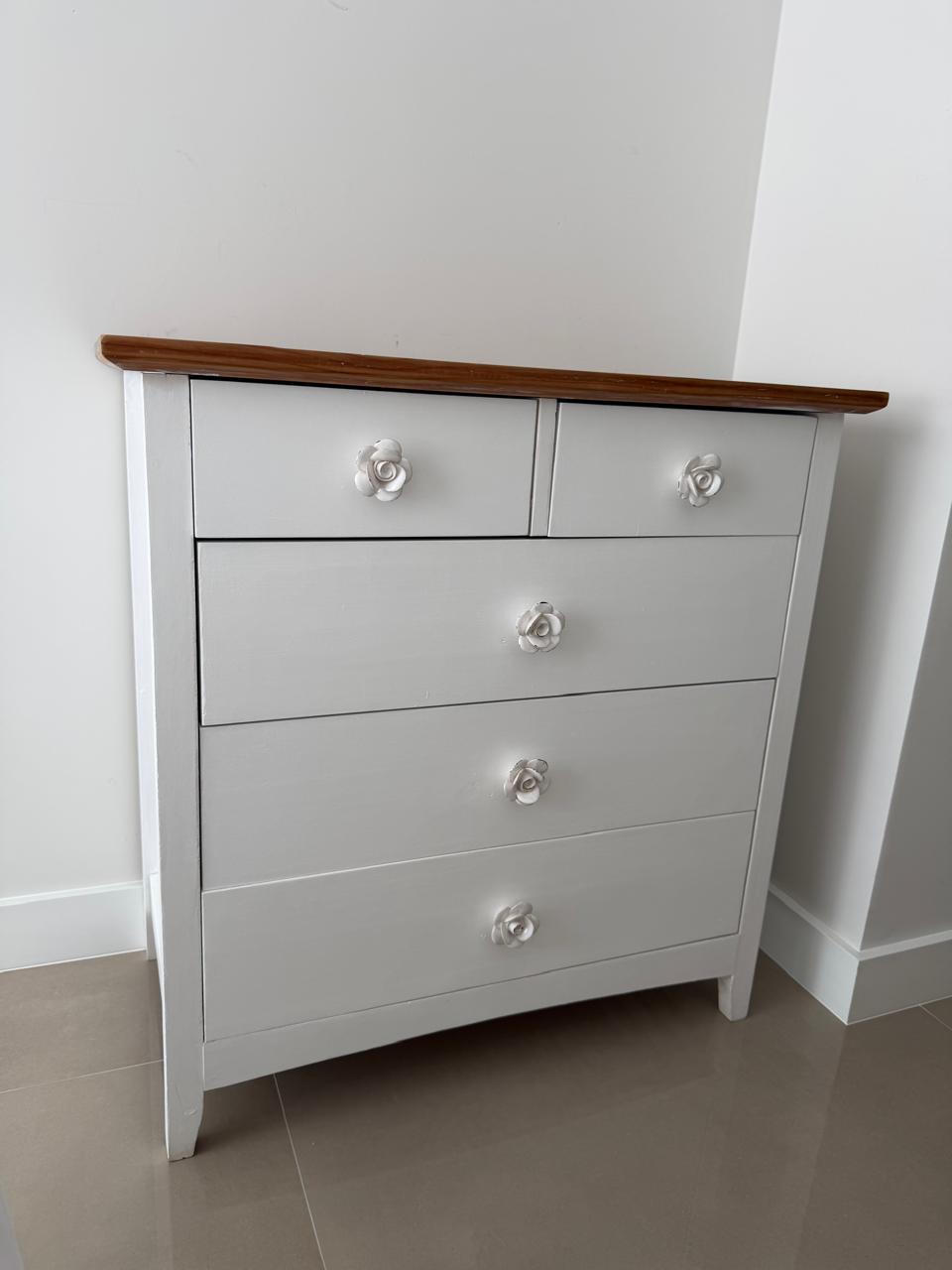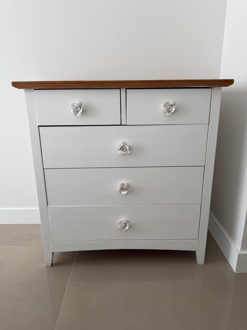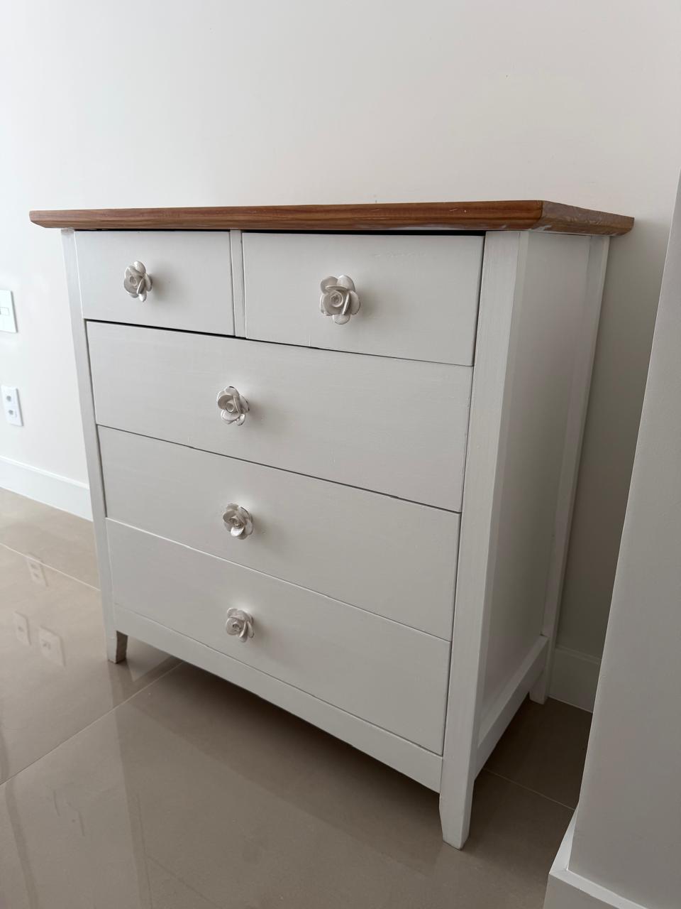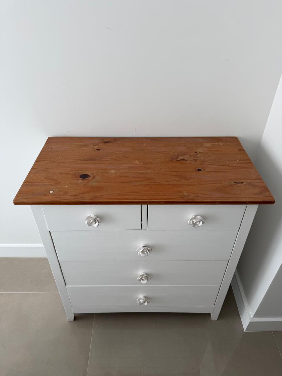 CÔMODA MADEIRA MACIÇA + PINTURA BRANCA + TAMPO NATURAL + PUXADORES CERÂMICA ESMALTADA — B050.14