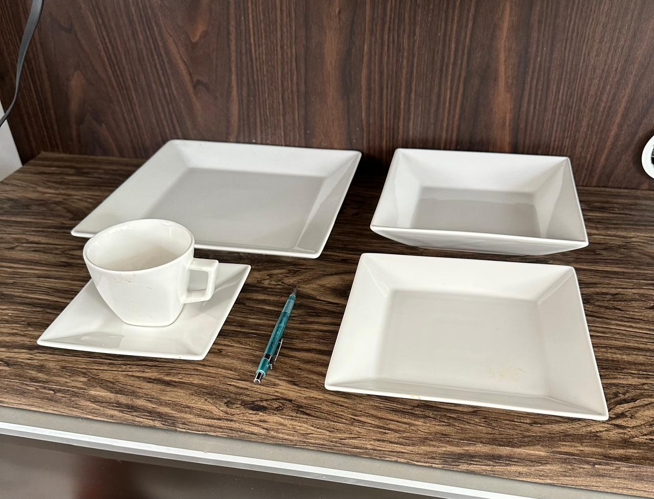 CONJUNTO CLÁSSICO DOS ANOS 1990 — PRATOS QUADRADOS BRANCOS — TOTAL DE 28 PEÇAS — CERÂMICA OXFORD