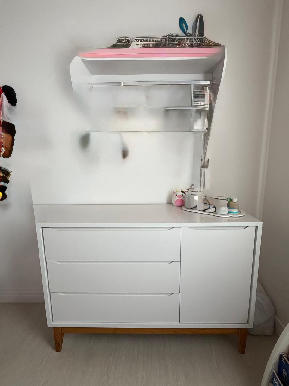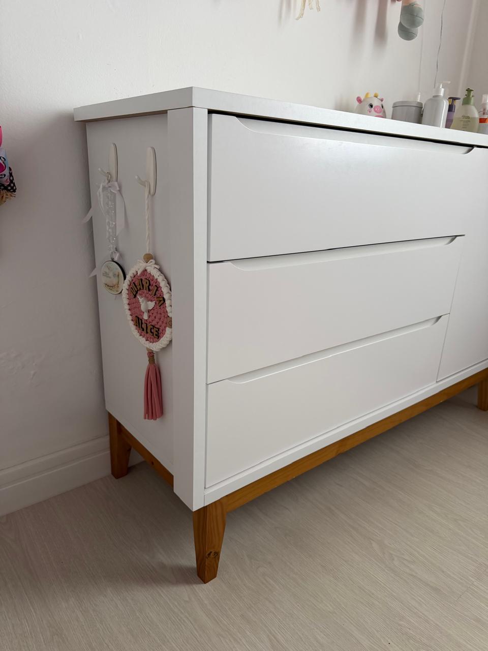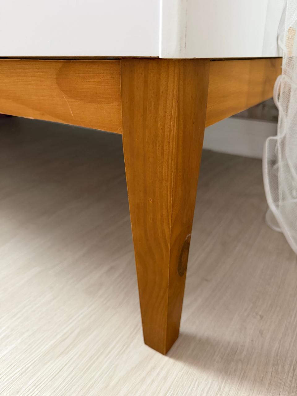 CONJUNTO COMPLETO DE QUARTO DE BEBÊ – 3 PEÇAS: BERÇO + CÔMODA + ARMÁRIO – LACA BRANCA + MADEIRA TOM CARAMELO – CHAMOSO ! — R089.18