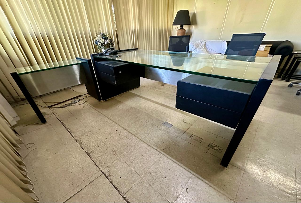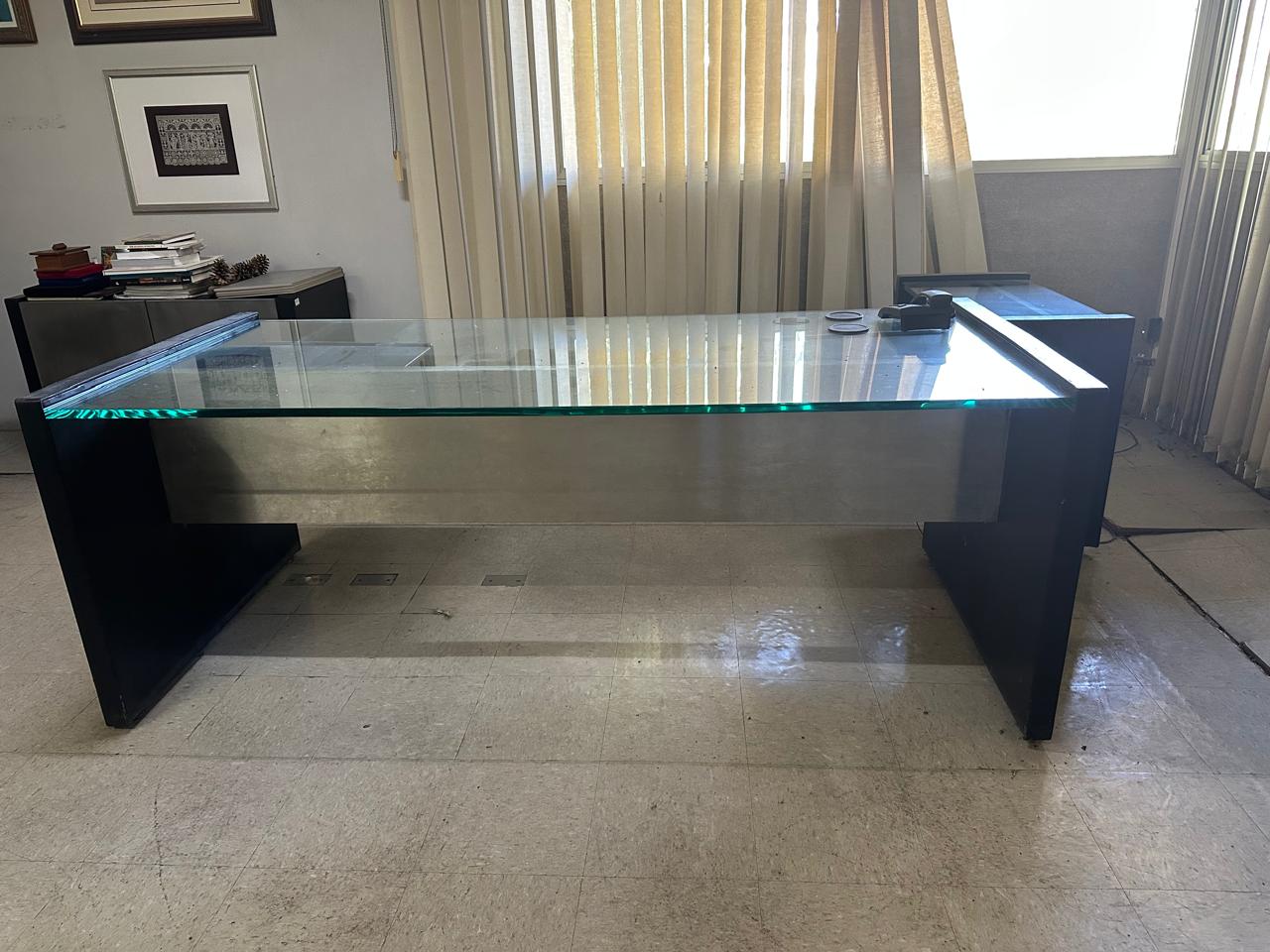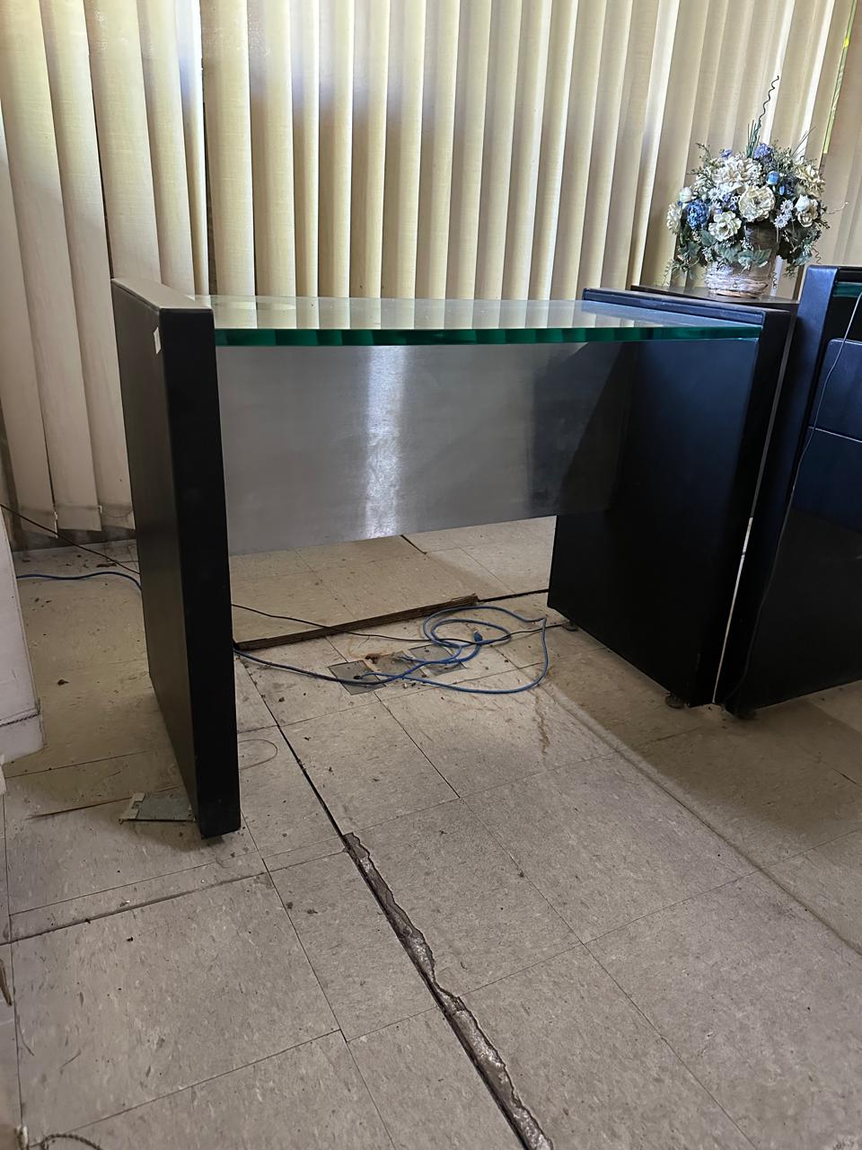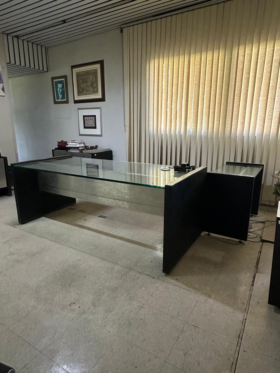 – Escrivaninha com tampo de vidro grosso de 20 mm e saia de aço – Medidas: 201 x 75 x 90cm (L x A x P)