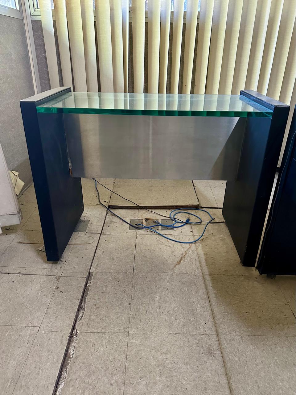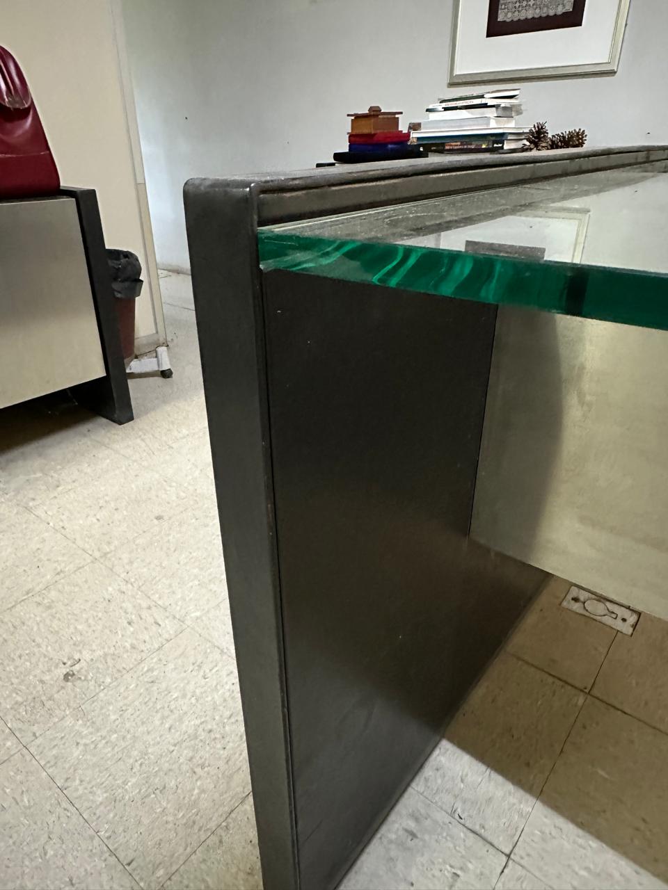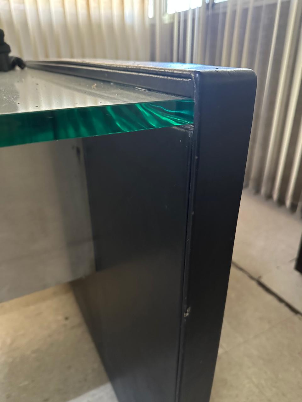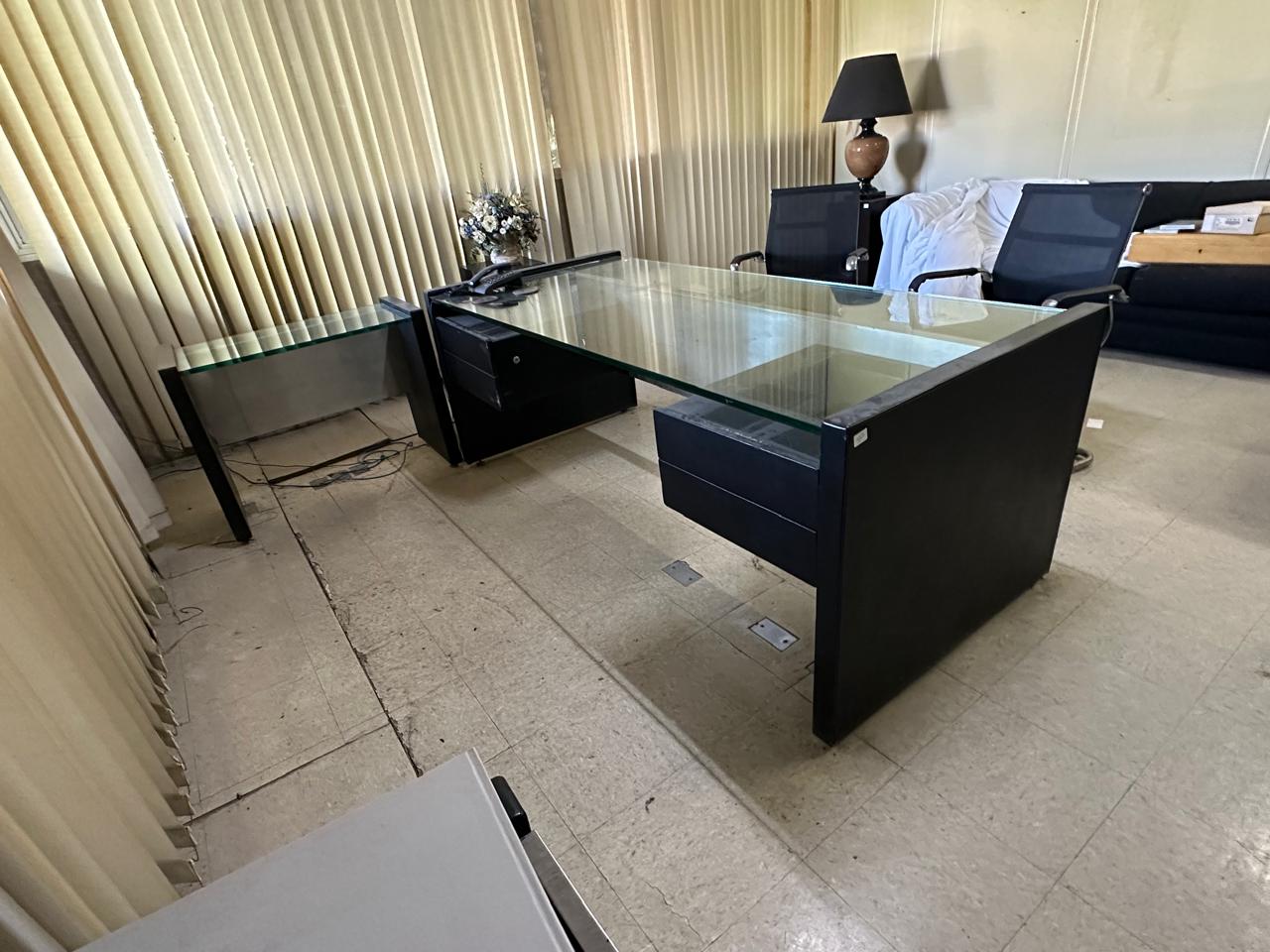 – Escrivaninha com tampo de vidro grosso de 20 mm e saia de aço – Medidas: 201 x 75 x 90cm (L x A x P)