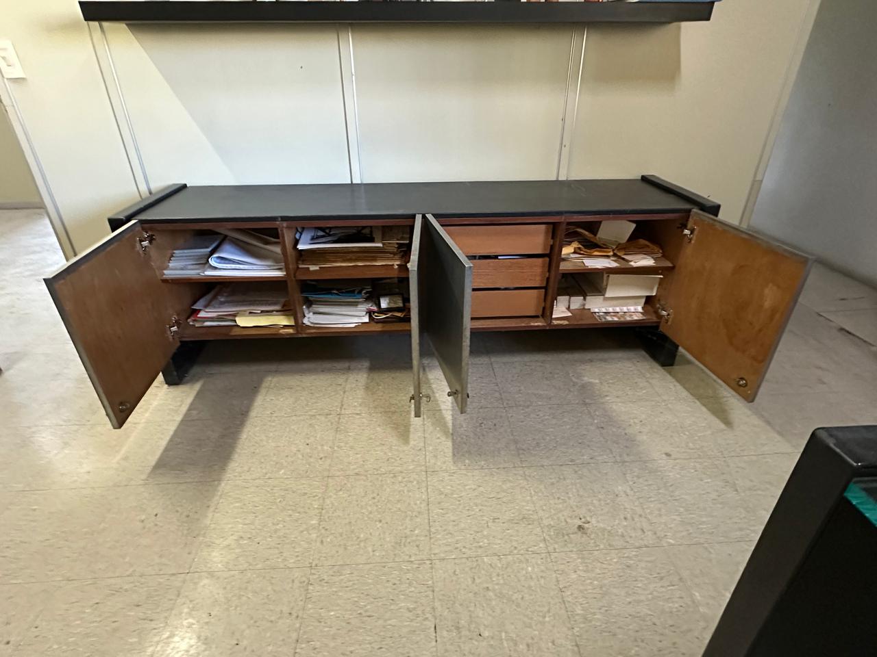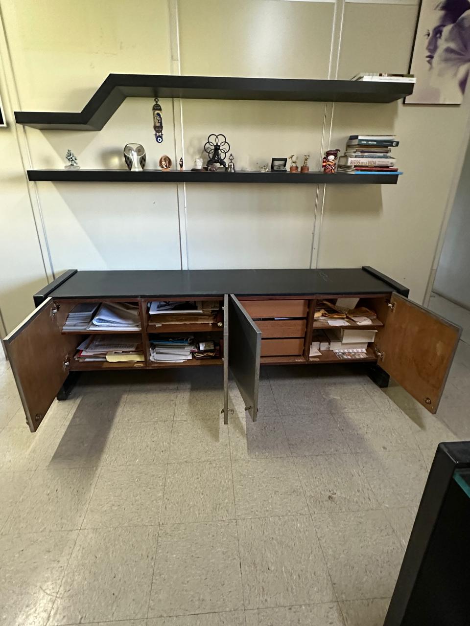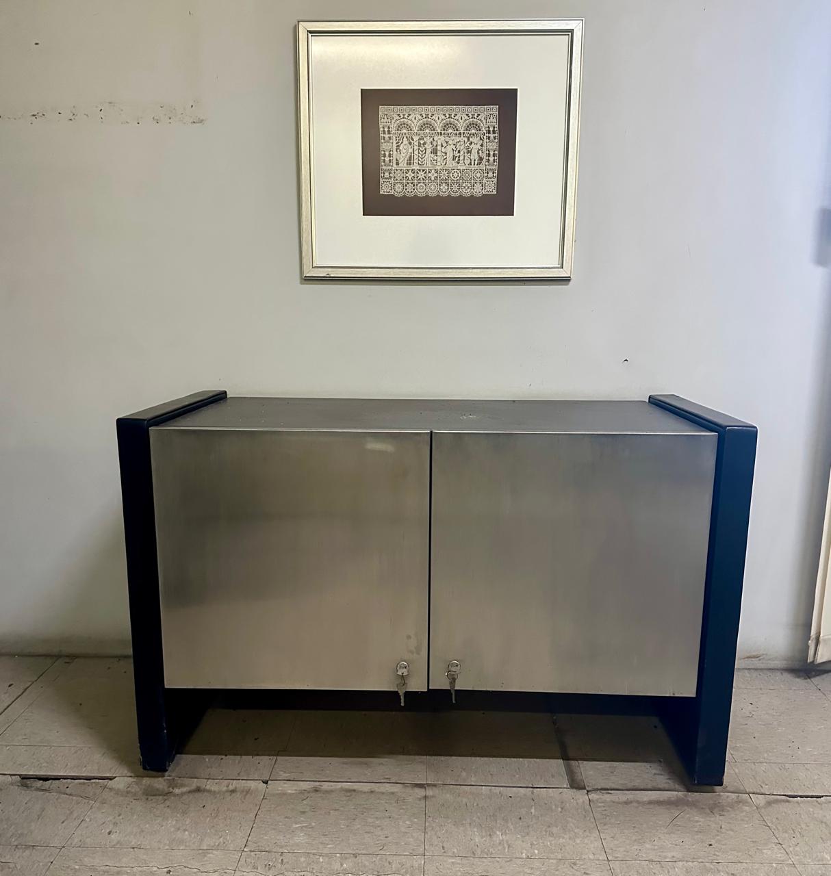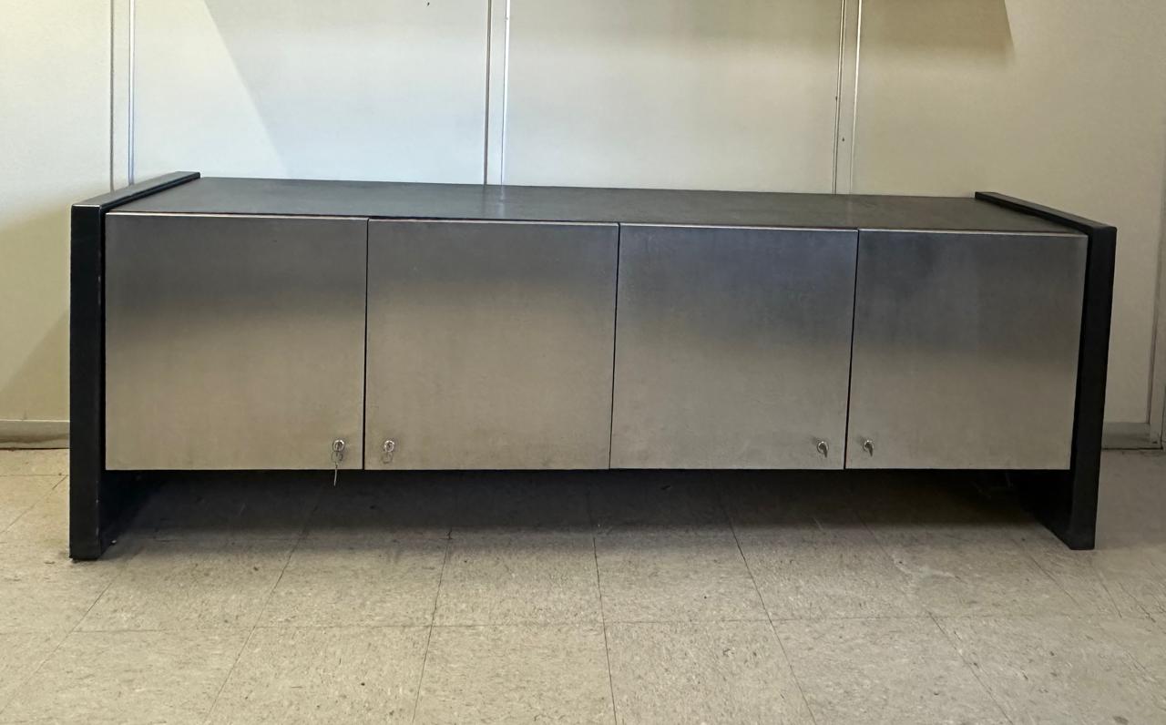 CONJUNTO DE ESCRITÓRIO DE 4 PEÇAS – TAMPO E LATERAIS EM COURO PRETO E BALCÕES COM PORTAS REVESTIDAS EM AÇO INOX ESCOVADO — L085.200