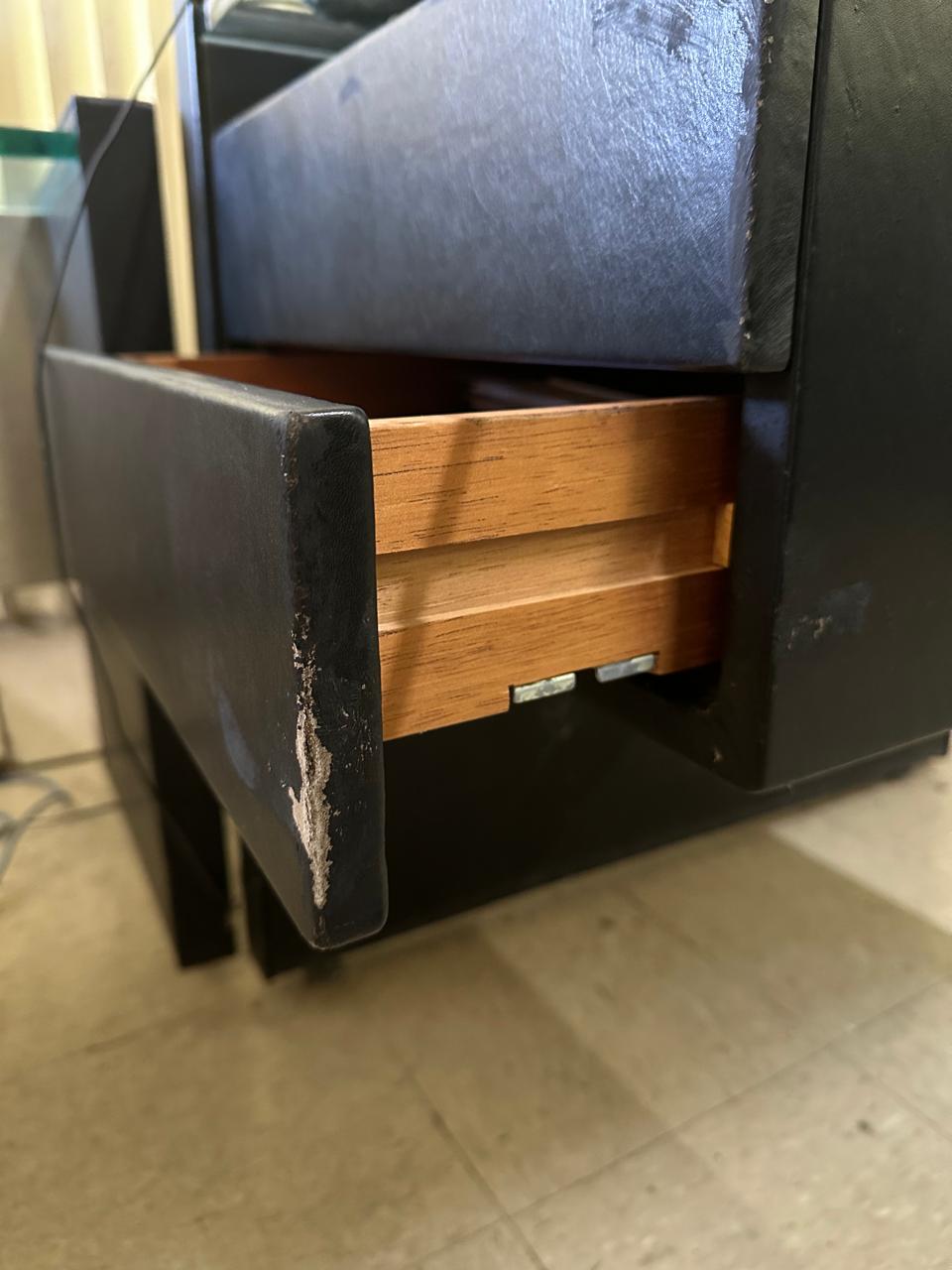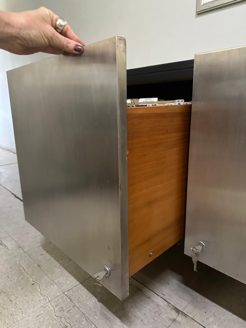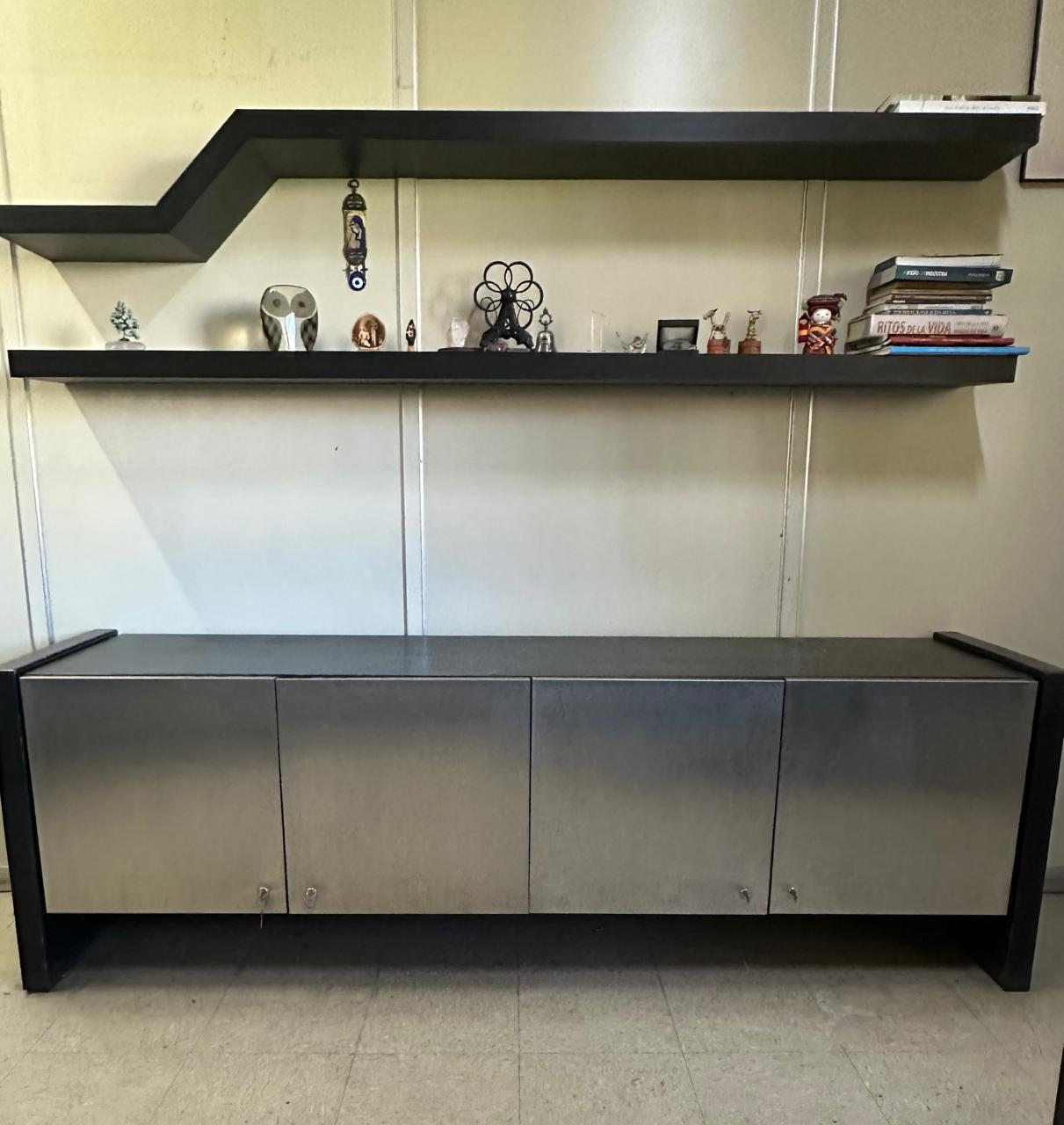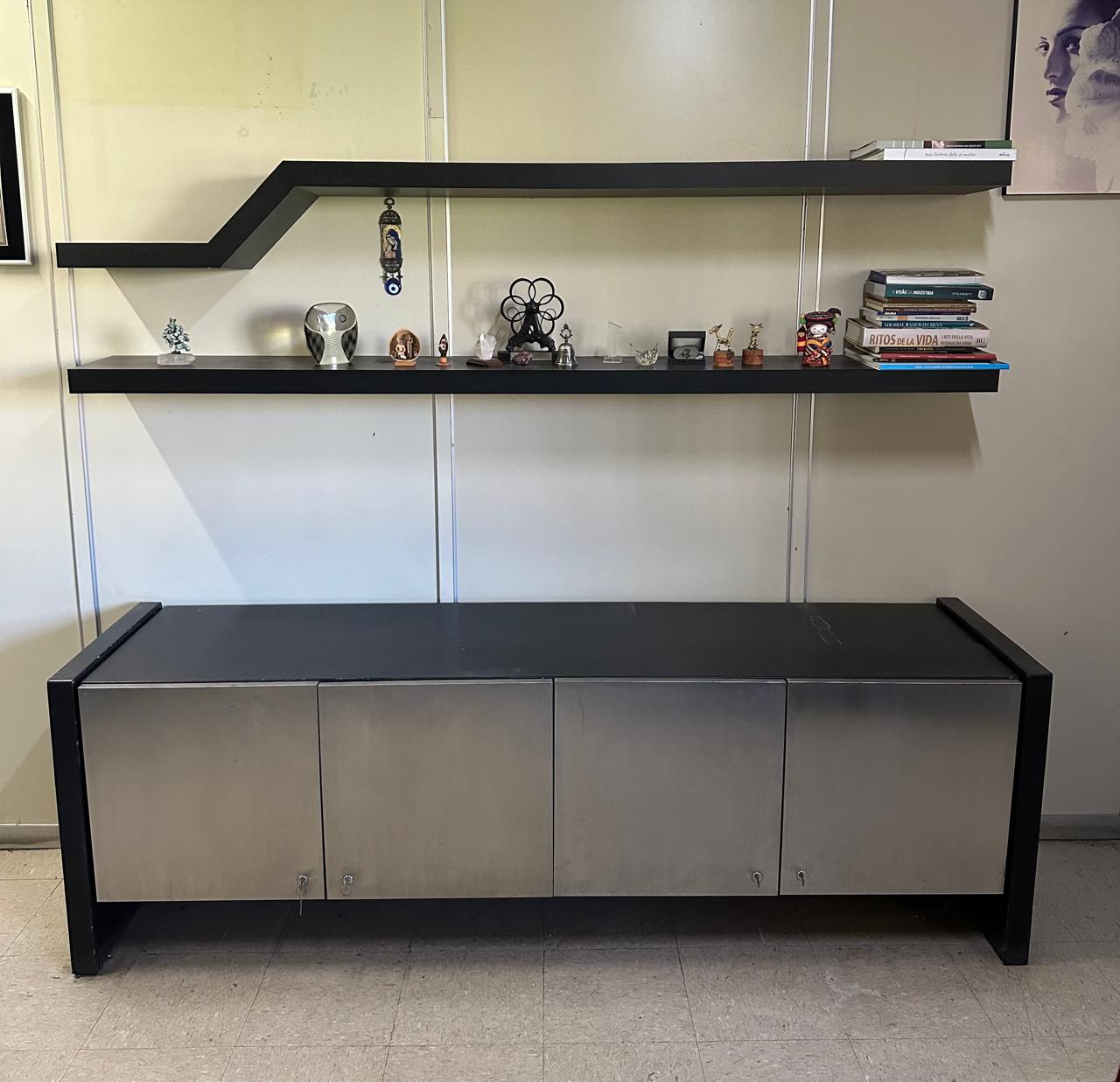 Seja o primeiro a avaliar “CONJUNTO DE ESCRITÓRIO DE 4 PEÇAS – TAMPO E LATERAIS EM COURO PRETO E BALCÕES COM PORTAS REVESTIDAS EM AÇO INOX ESCOVADO — L085.200” Cancelar resposta