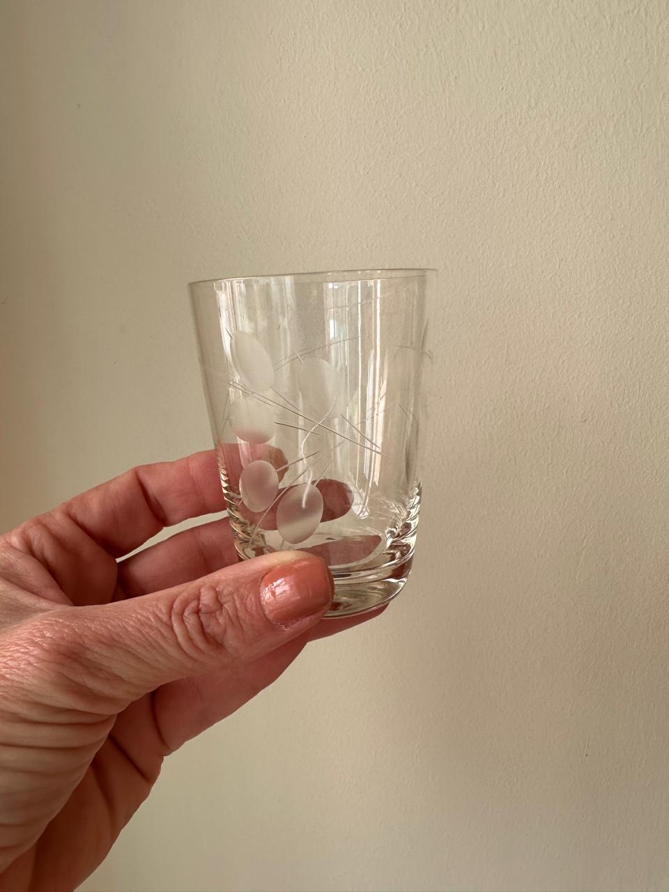CRISTAL – COPOS – LOTE ÚNICO – 5 COPOS BAIXOS – PARA SUCO OU PORTO – LAPIDAÇÃO AZEITONA — R065.121