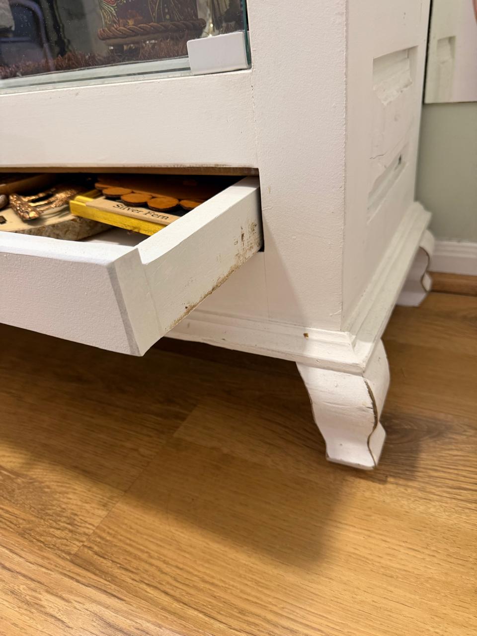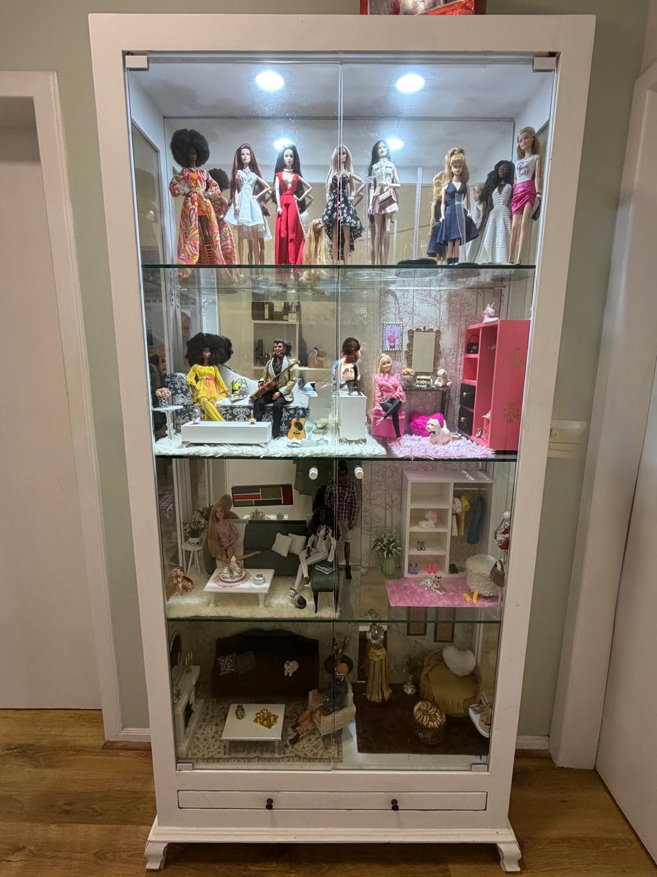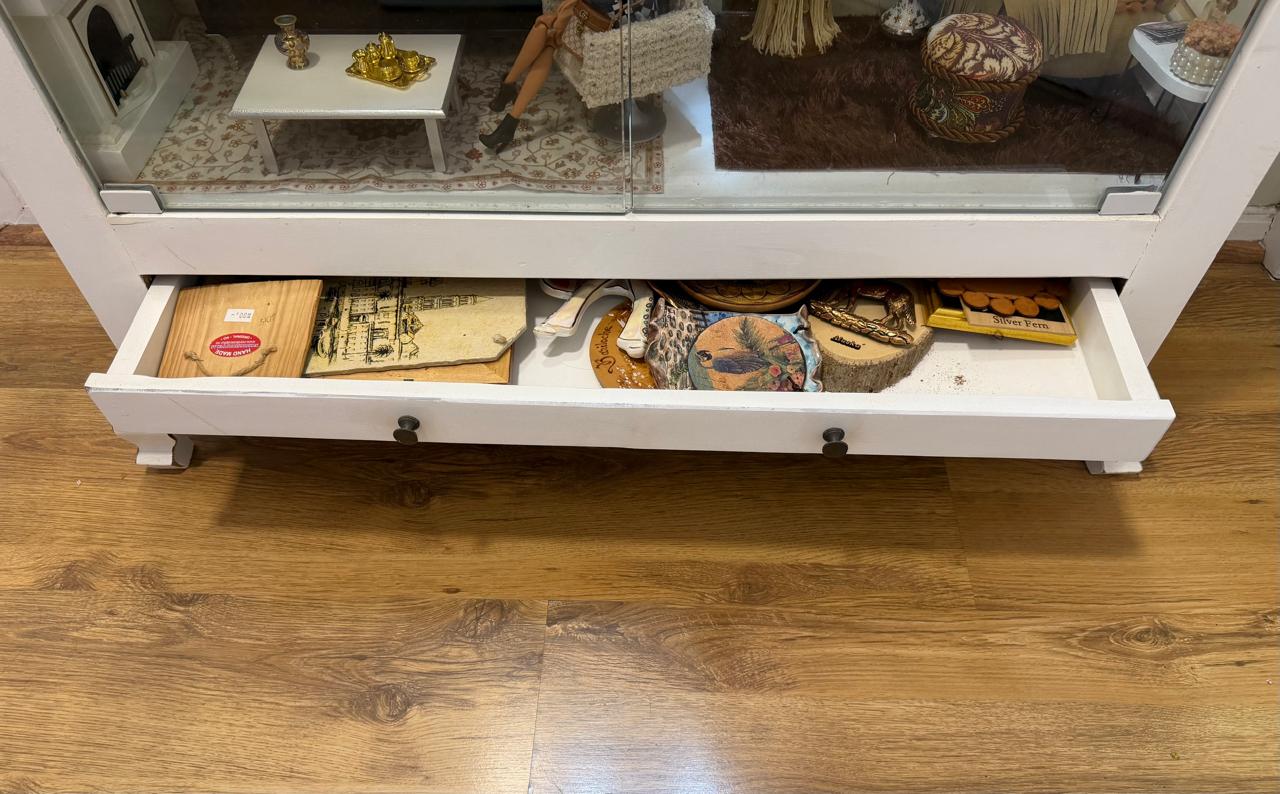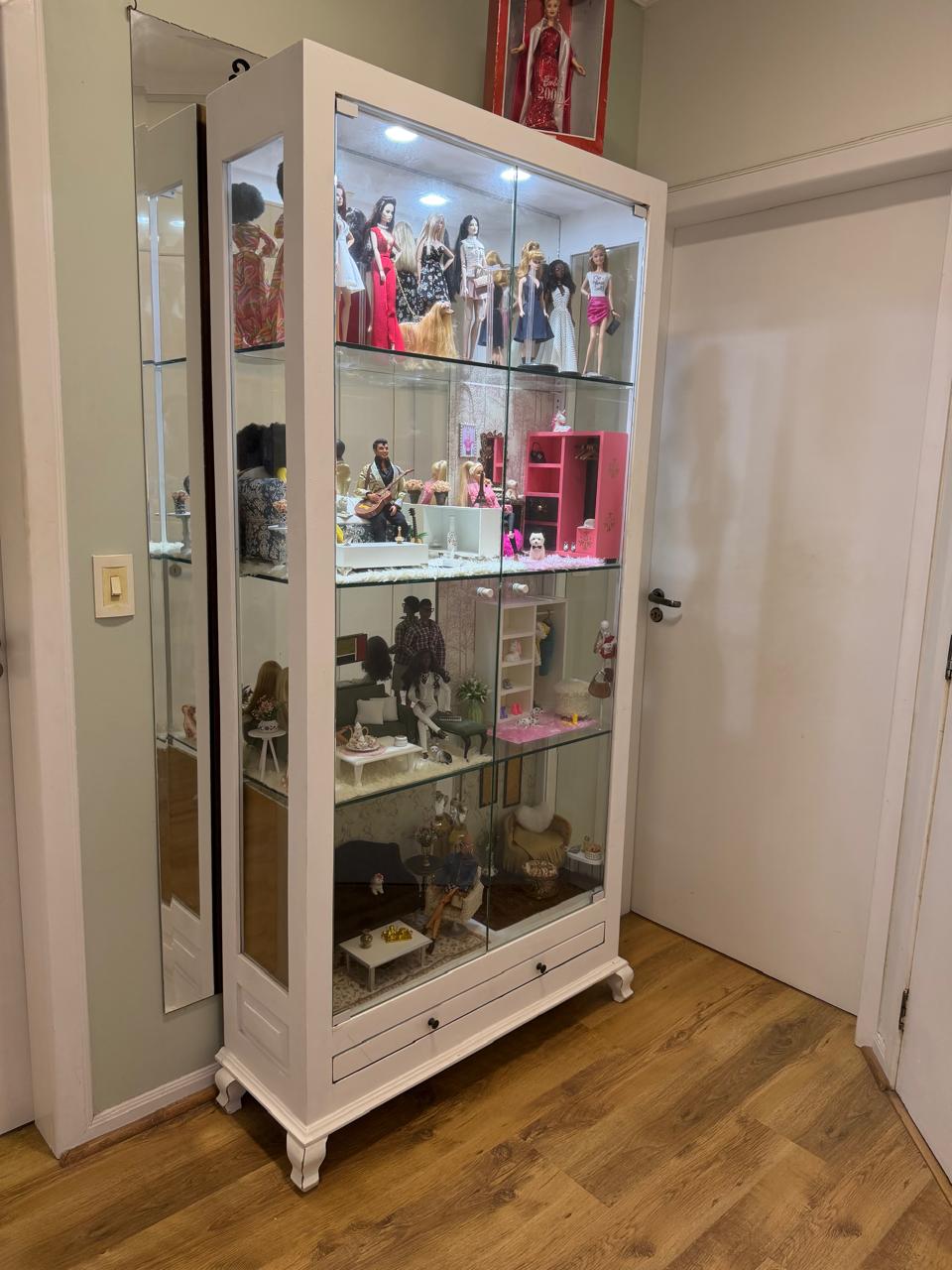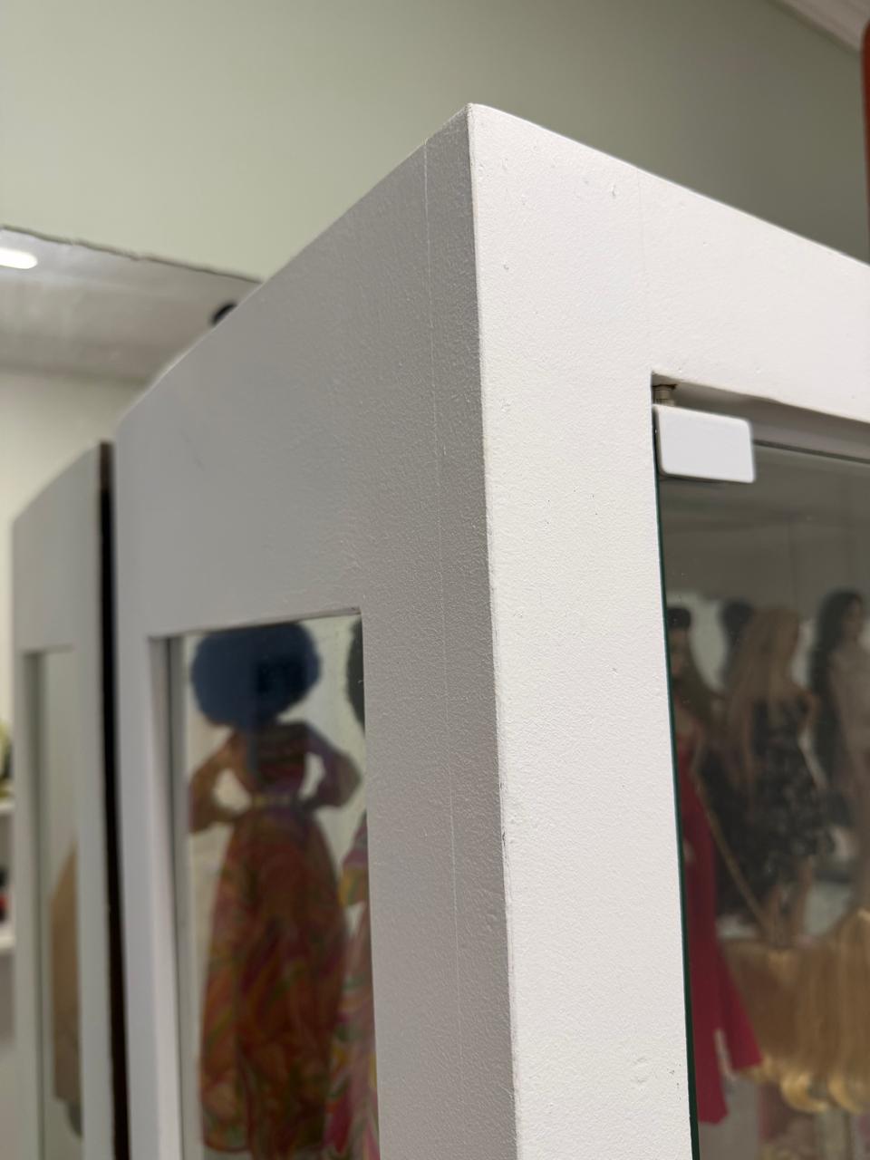 CRISTALEIRA – MADEIRA DEMOLIÇÃO MACIÇA + PINTURA BRANCA + LATERAIS, PRATELEIRAS E FRENTE DE VIDRO + ILUMINAÇÃO + FUNDO ESPELHADO — C081.104