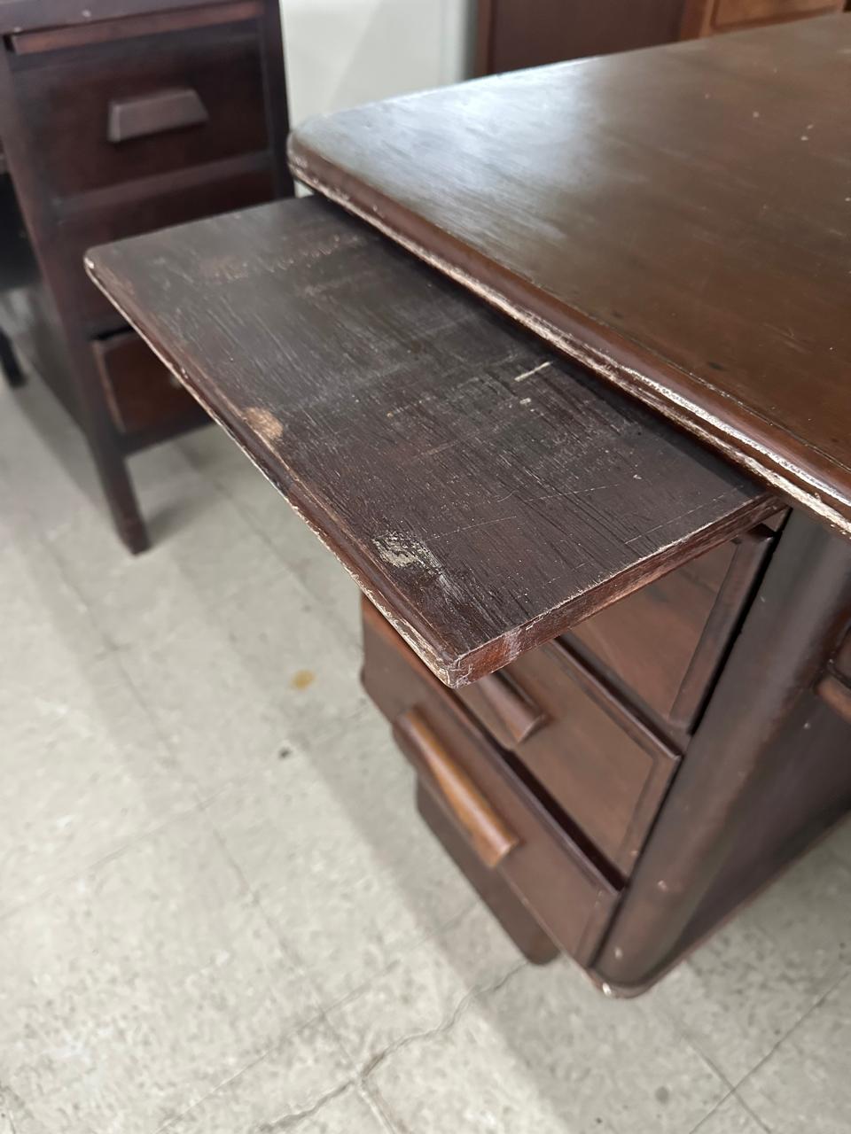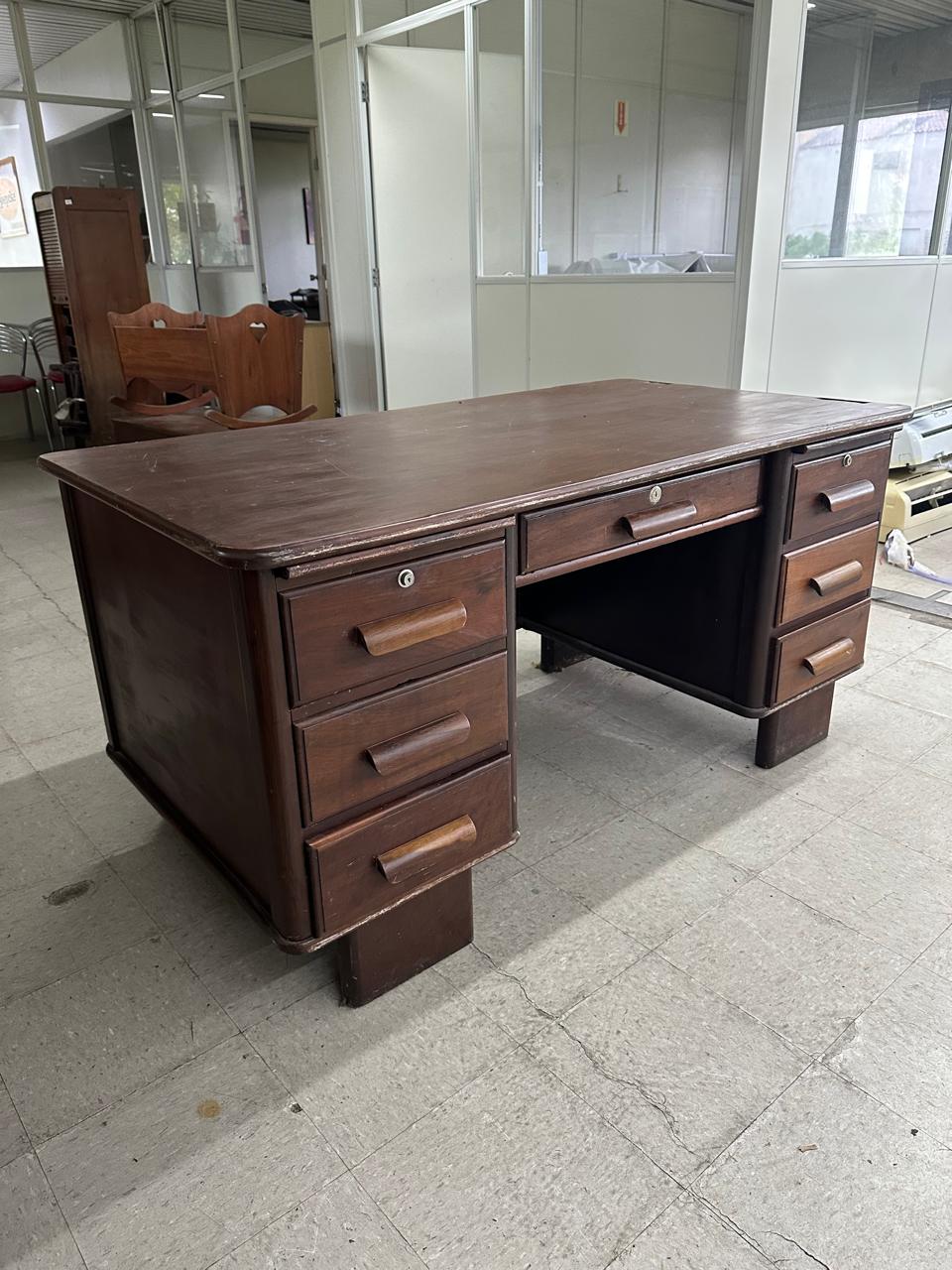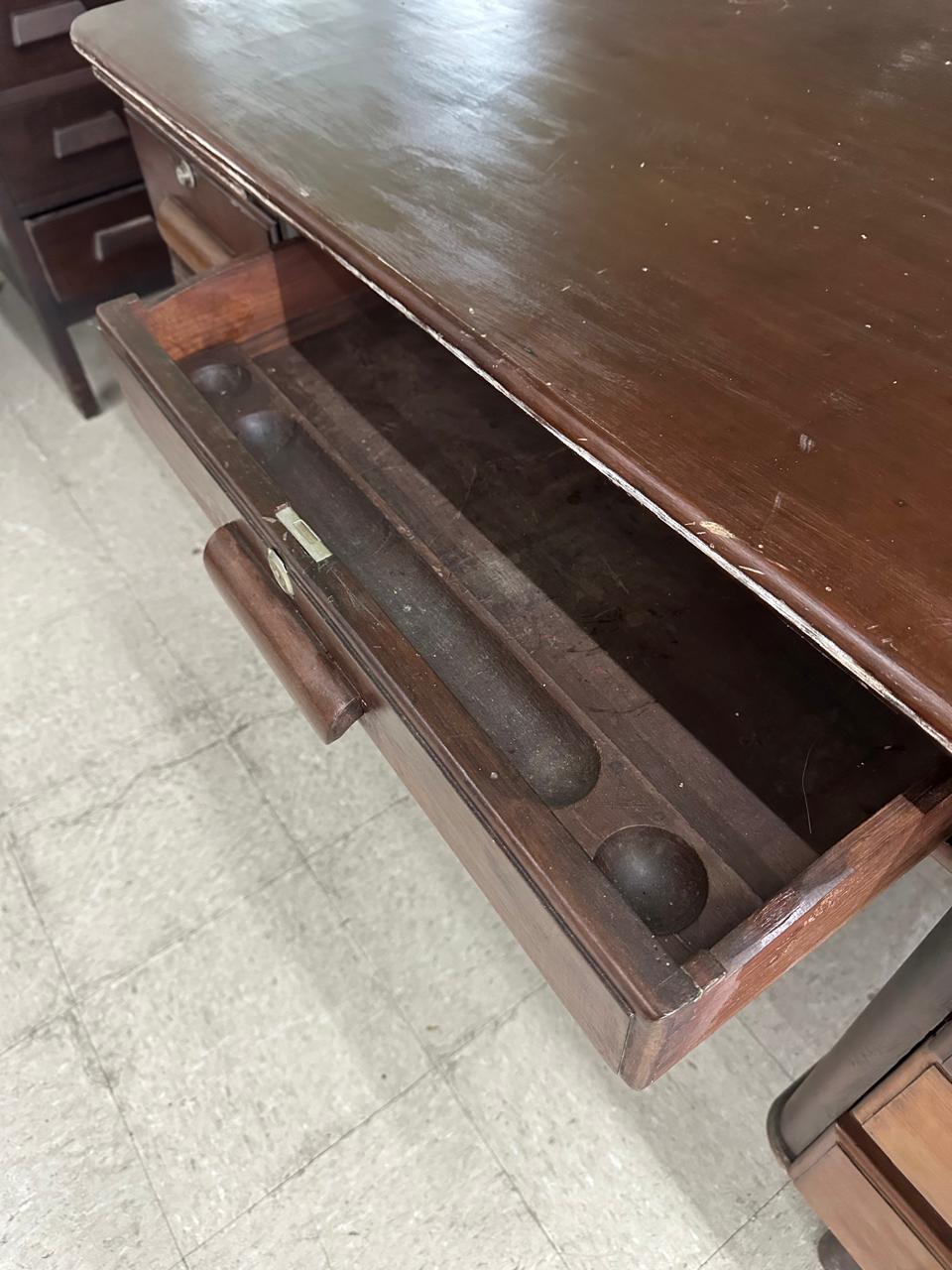ESCRIVANINHA ANTIGA – EXCELENTE TAMANHO PARA QUEM GOSTA DE SE ESPALHAR – BASTANTE PROFUNDIDADE – PONTOS DE CUPIM NO TAMPO – VALE A PENA RESTAURAR PARA DAR NOVA VIDA – MESA LINDA ! – GAVETAS DOS DOS LADOS + GAVETA CENTRAL — L085.23
