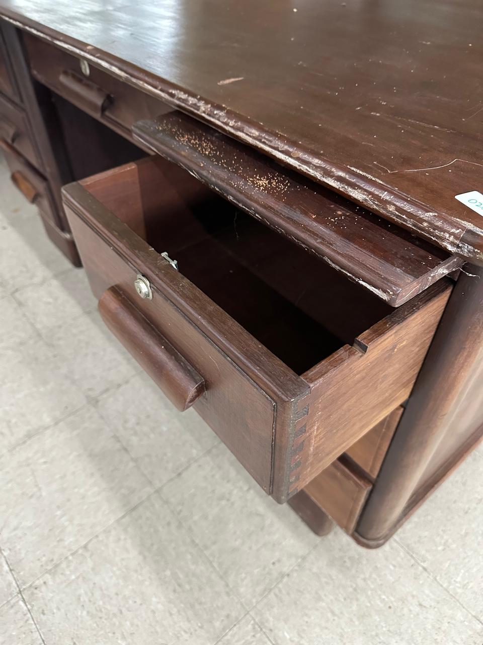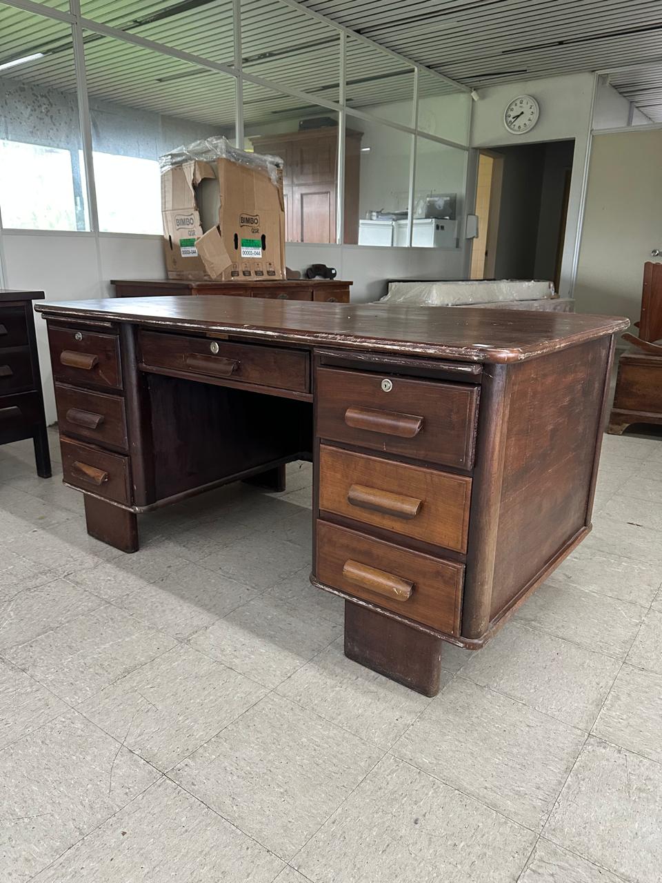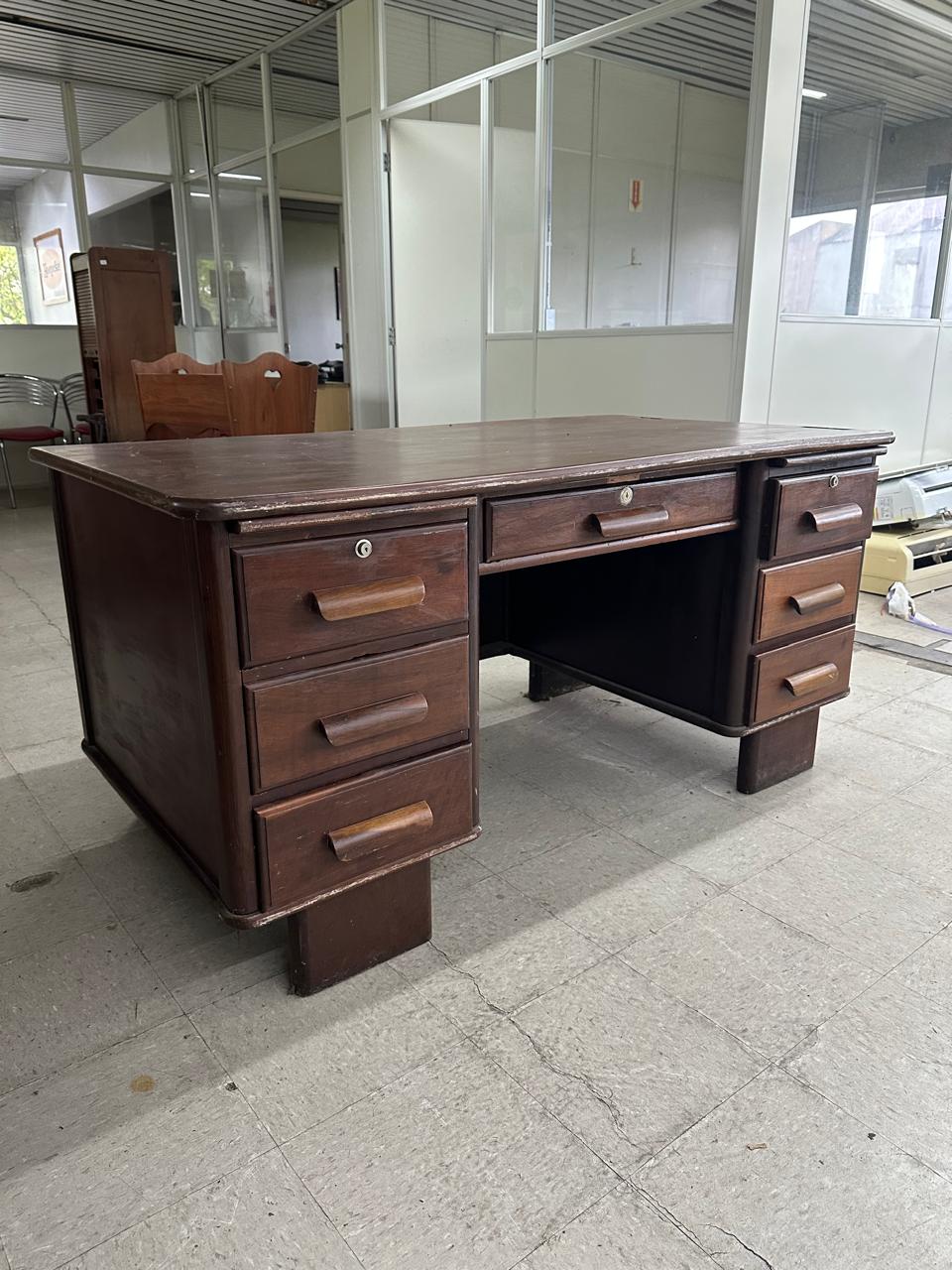 ESCRIVANINHA ANTIGA – EXCELENTE TAMANHO PARA QUEM GOSTA DE SE ESPALHAR – BASTANTE PROFUNDIDADE – PONTOS DE CUPIM NO TAMPO – VALE A PENA RESTAURAR PARA DAR NOVA VIDA – MESA LINDA ! – GAVETAS DOS DOS LADOS + GAVETA CENTRAL — L085.23