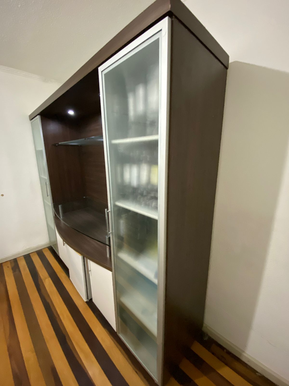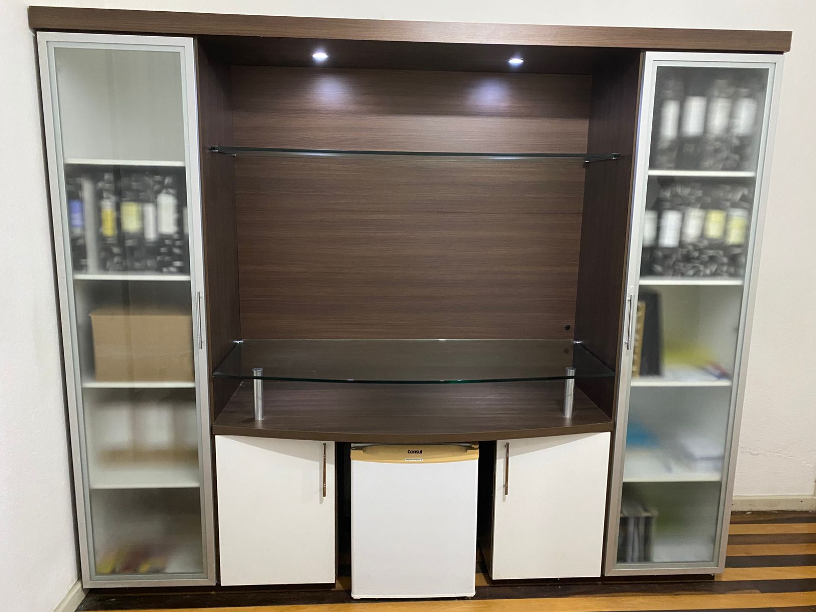 ESTANTE MDF + LATERAIS EM MADEIRA – PRATELEIRA DE VIDRO NA PARTE CENTRAL – PORTAS LATERAIS EM VIDRO – ILUMINAÇÃO CENTRAL — C096.02