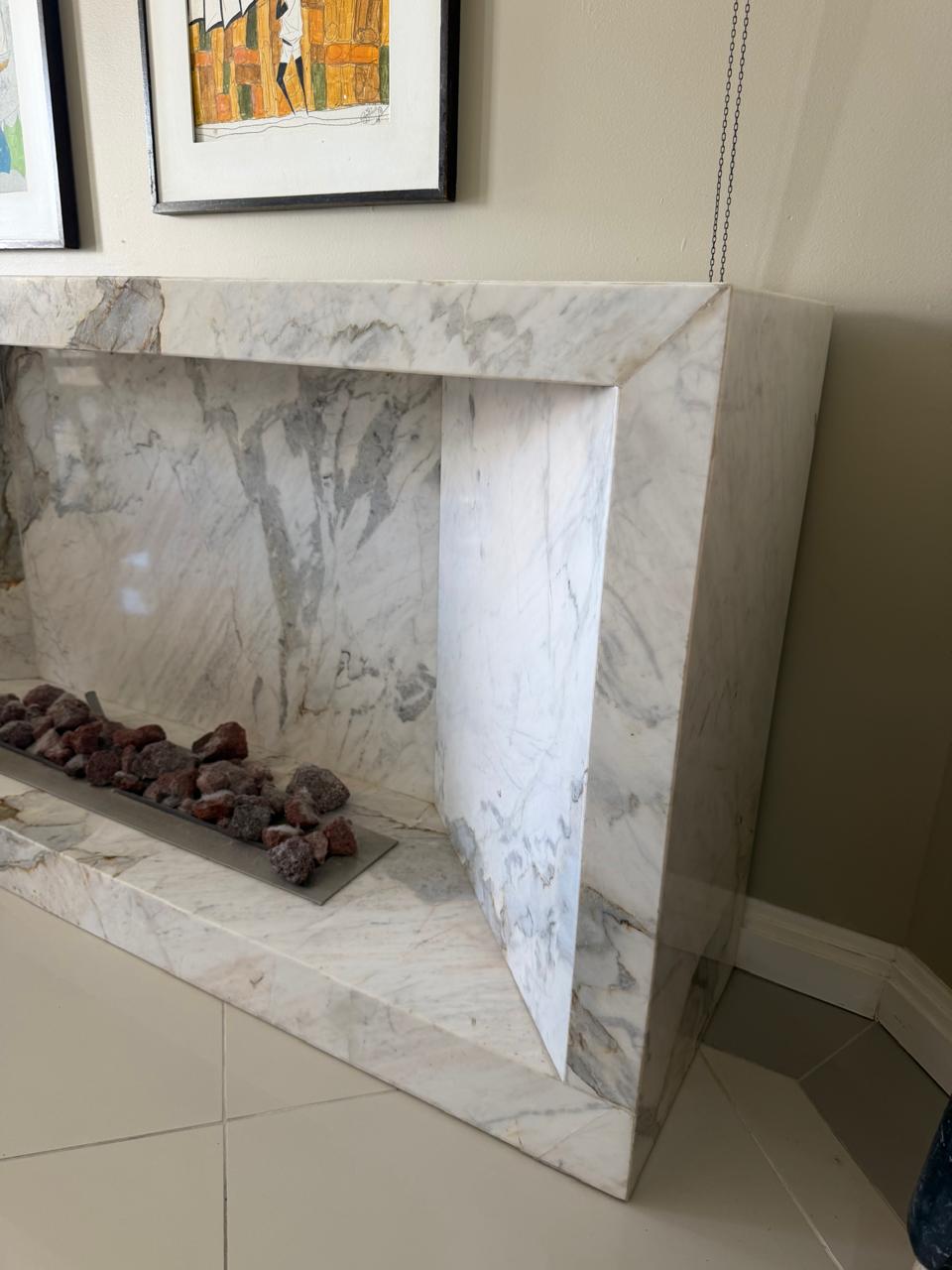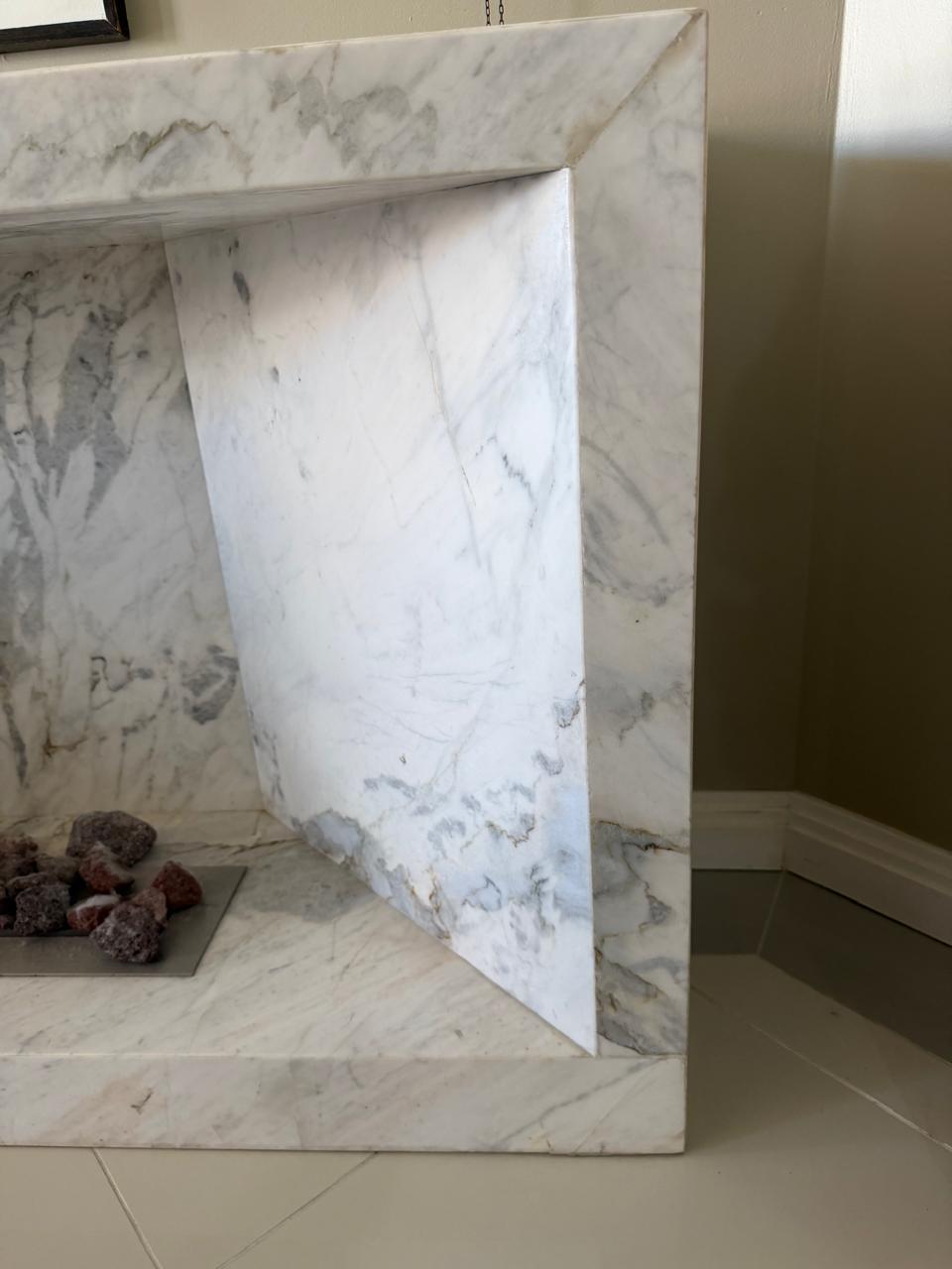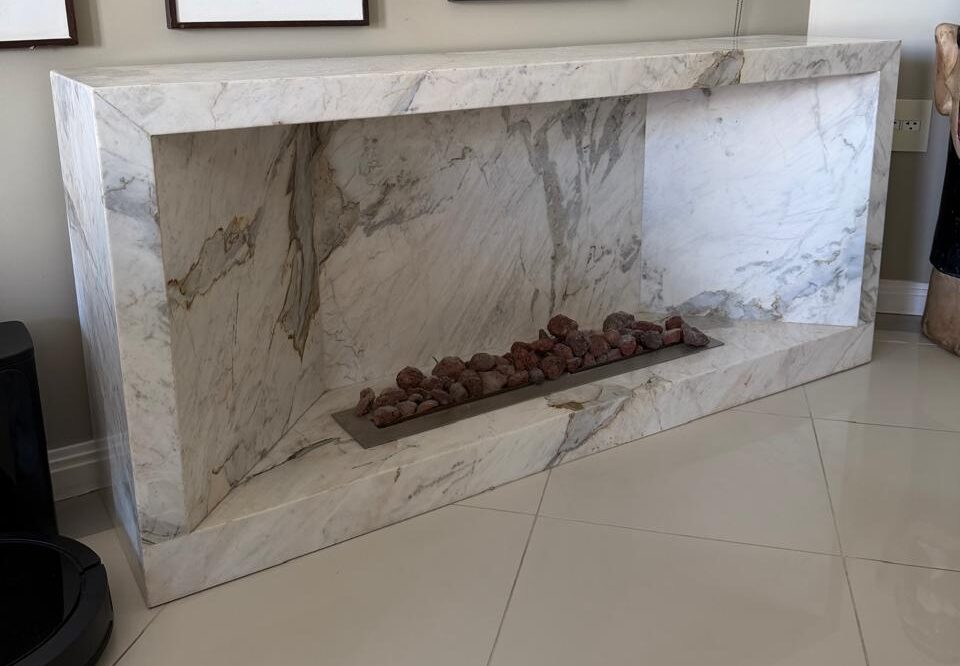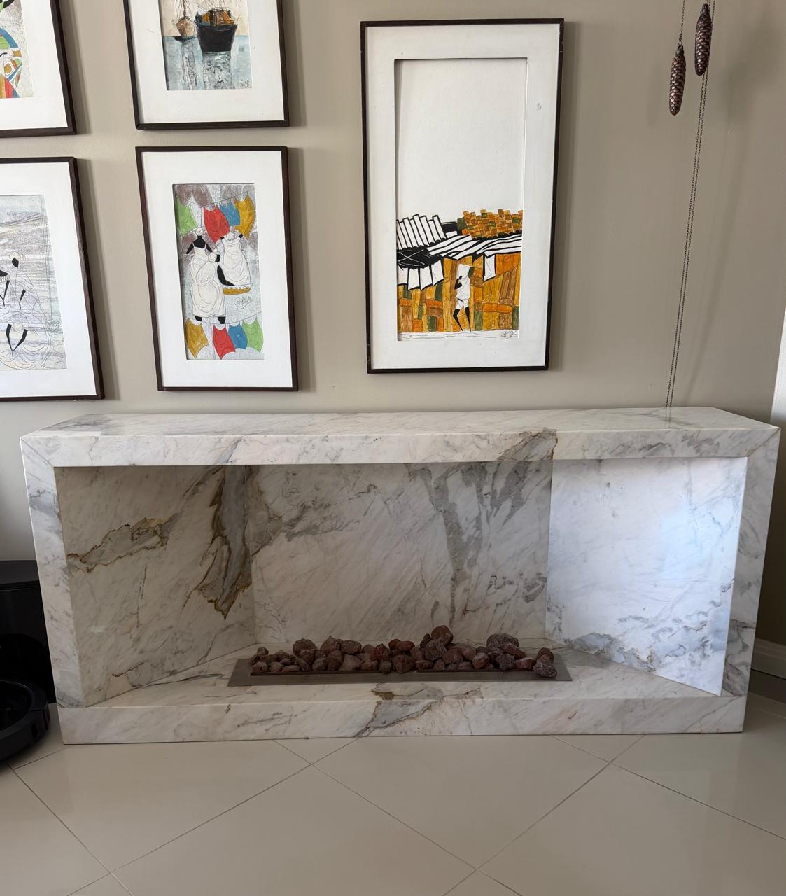 LAREIRA INTERNA OU EXTERNA COBERTA – ESTRUTURA APARADOR EM MÁRMORE – LAREIRA À ALCOOL – INOX – ESTADO DE NOVA — V050.13