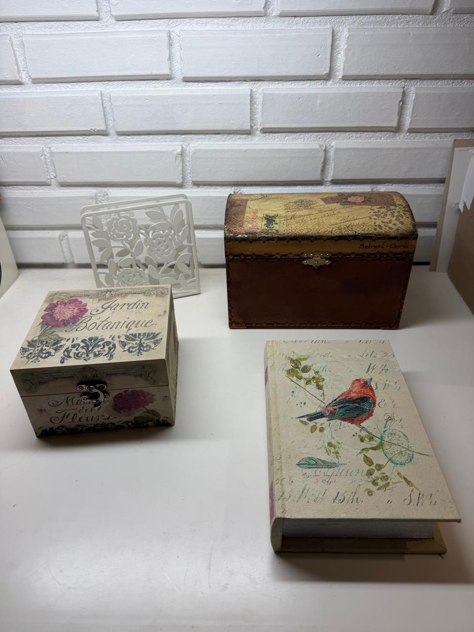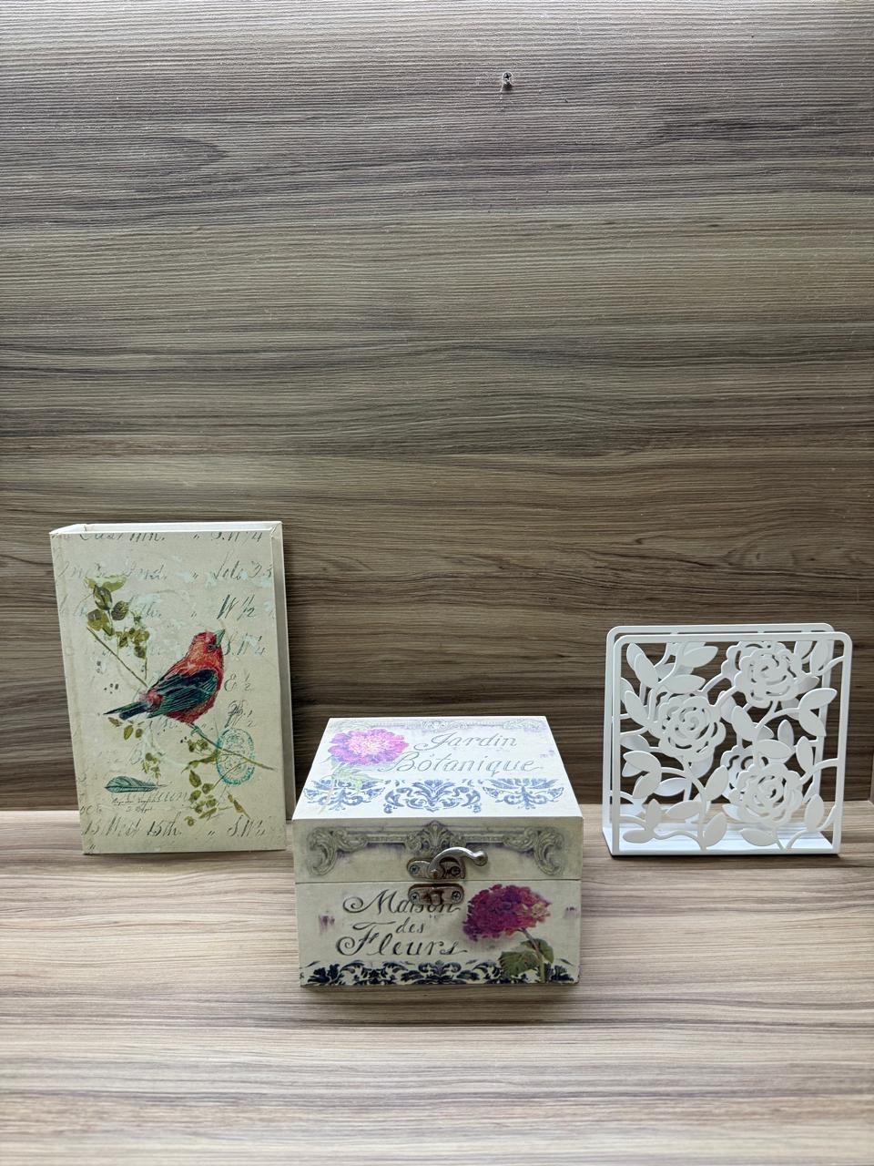 LOTE ÚNICO – 1 CAIXA-LIVRO PASSARINHO + 1 CAIXA RELÓGIO + 1 MINI BAÚ + 1 PORTA PAPEIS IKEA — I016.739