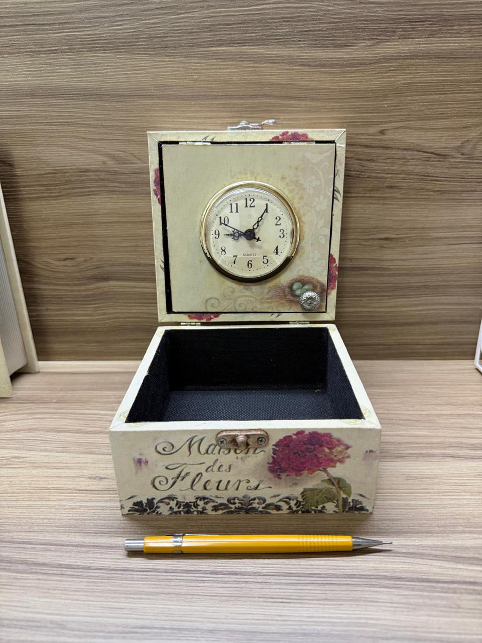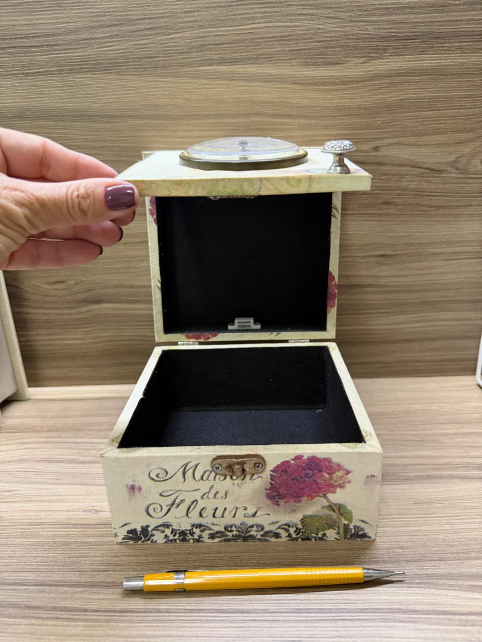 – Caixa com relógio dentro – não funcionando, falta pilha – 15 x 9 x 15 cm (L x A x L)