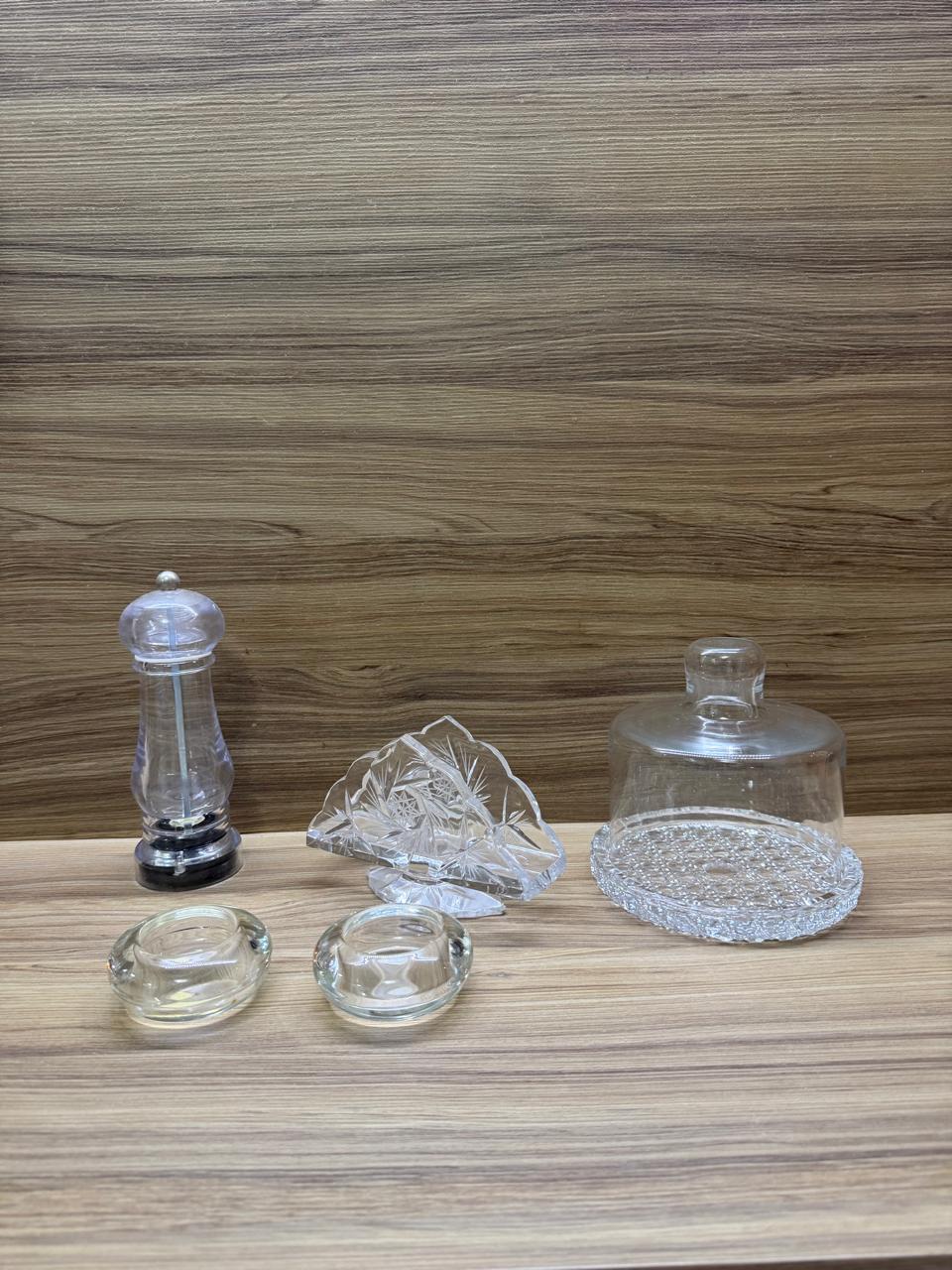LOTE ÚNICO – 1 PORTA QUEIJO VIDRO + 1 PORTA GUARDANAPO OU TORRADAS + 2 PORTA MANTEIGA INDIVIDUAL + 1 PIMENTEIRO ACRÍLICO — I016.715