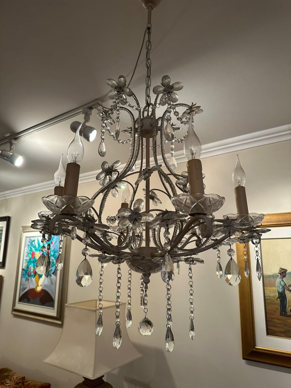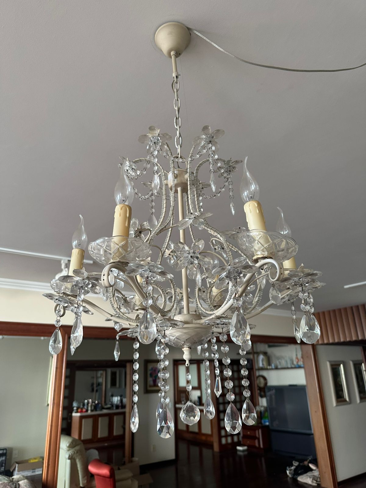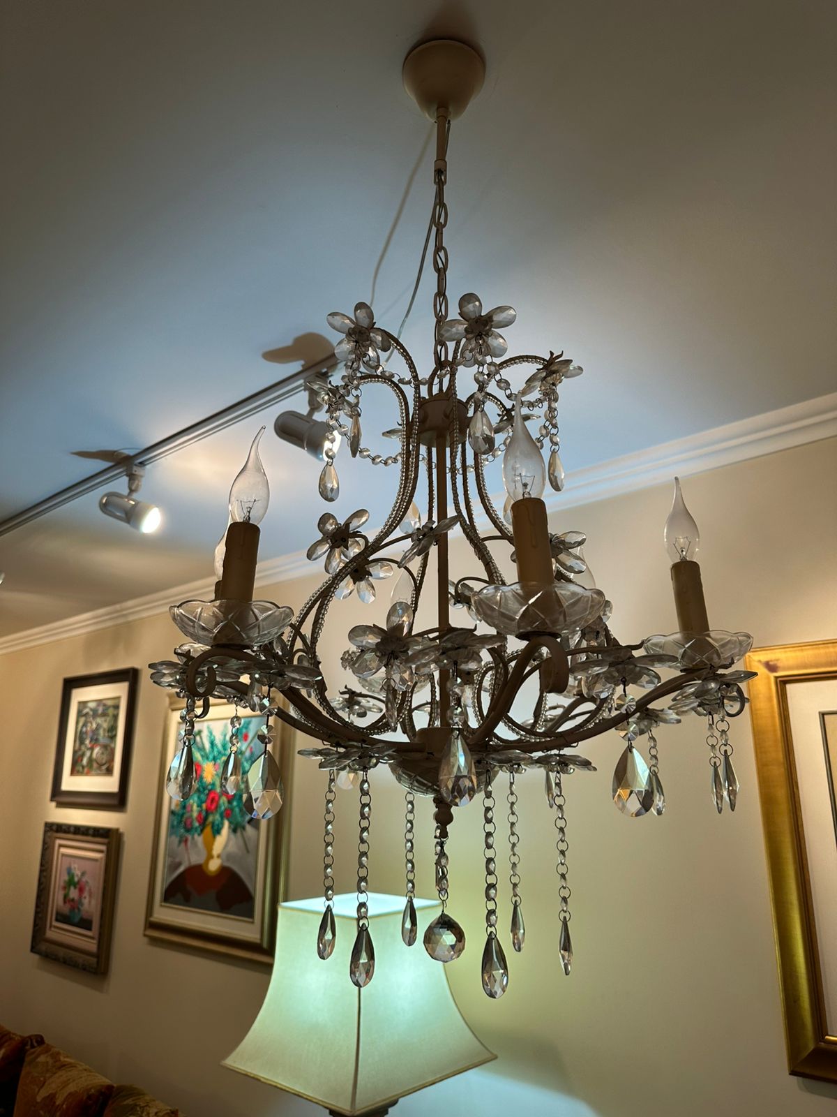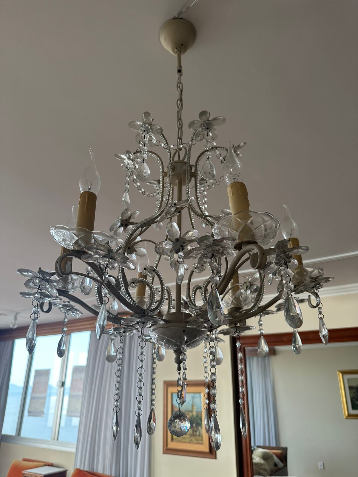 LUSTRE — 6 BRAÇOS — LÂMPADAS VELA — FERRO + CRISTAL + ACRÍLICO — M135.56