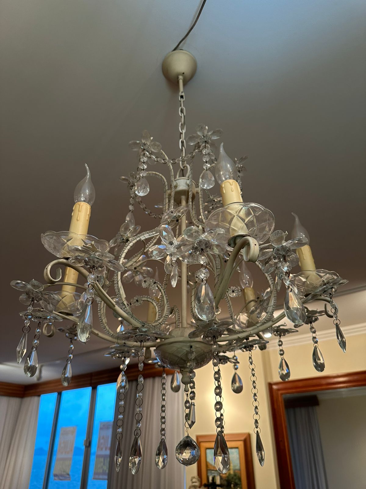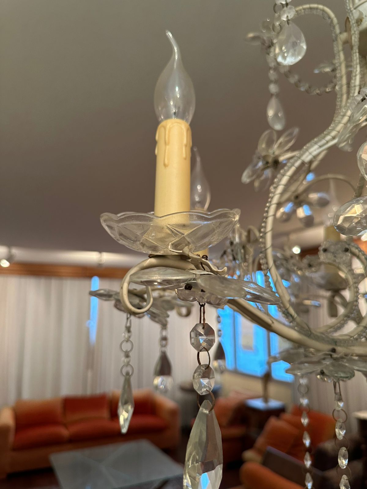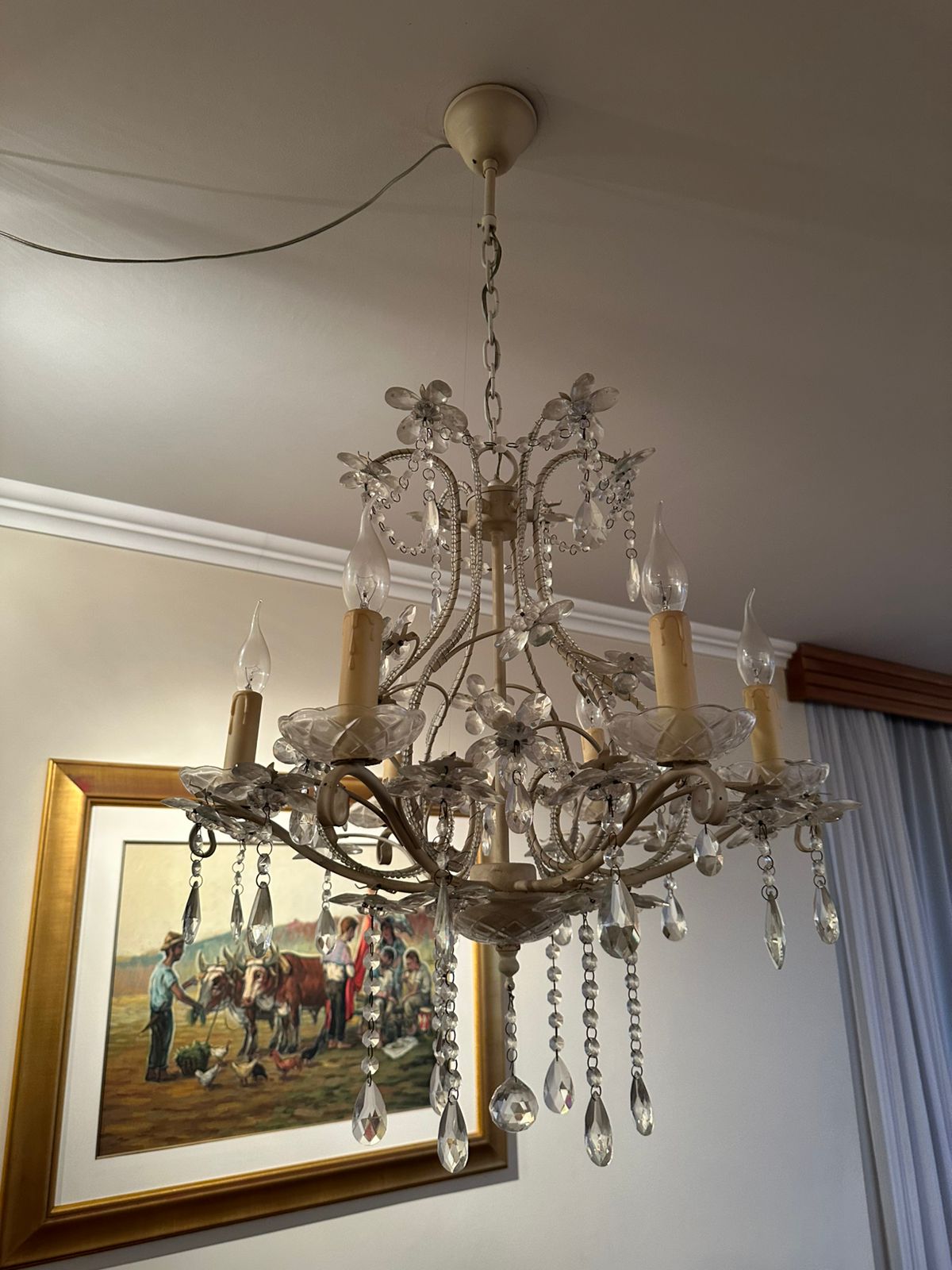 LUSTRE — 6 BRAÇOS — LÂMPADAS VELA — FERRO + CRISTAL + ACRÍLICO — M135.56