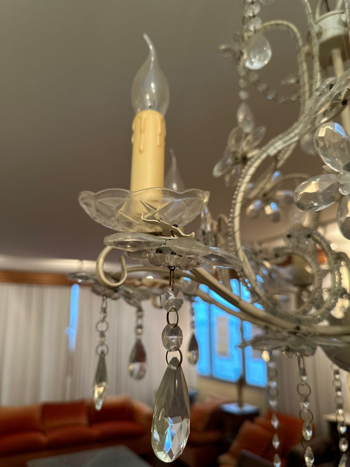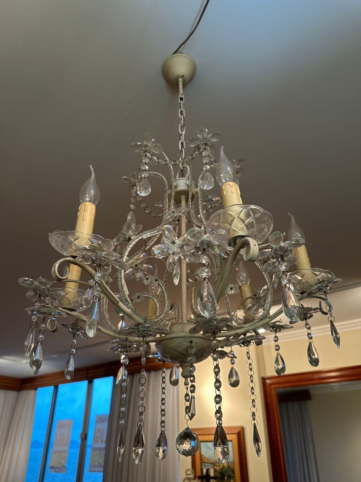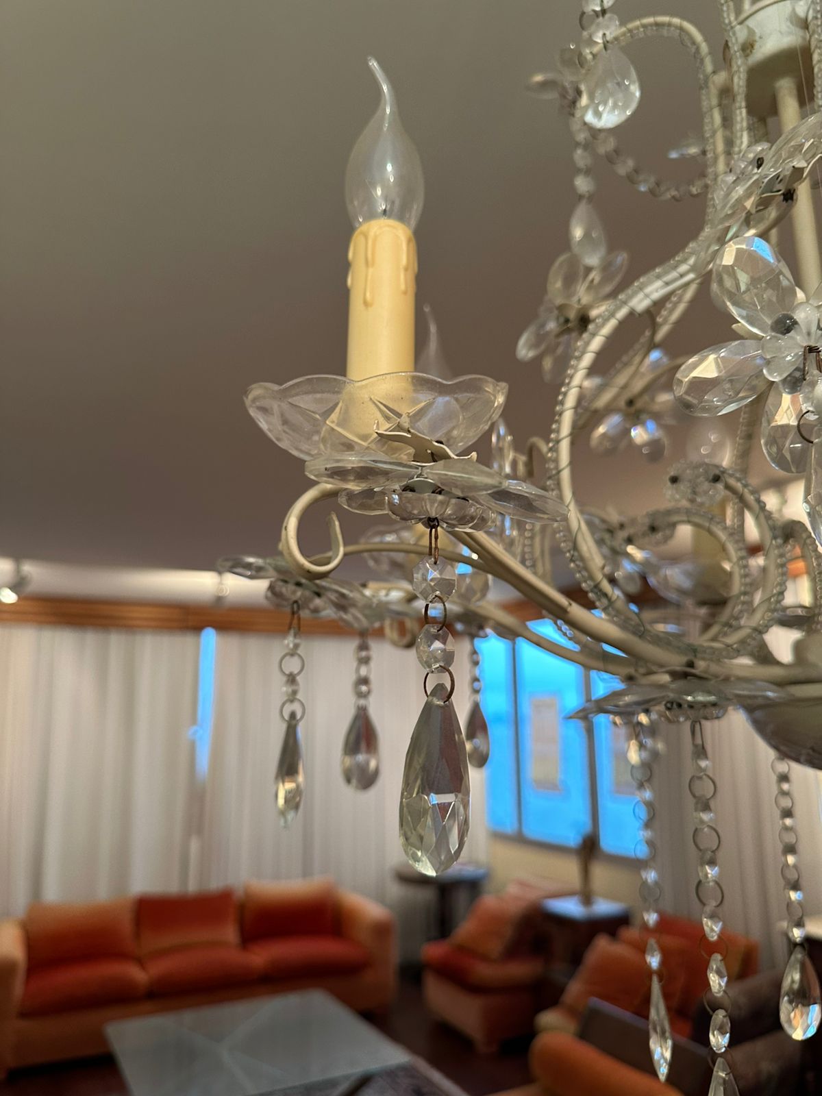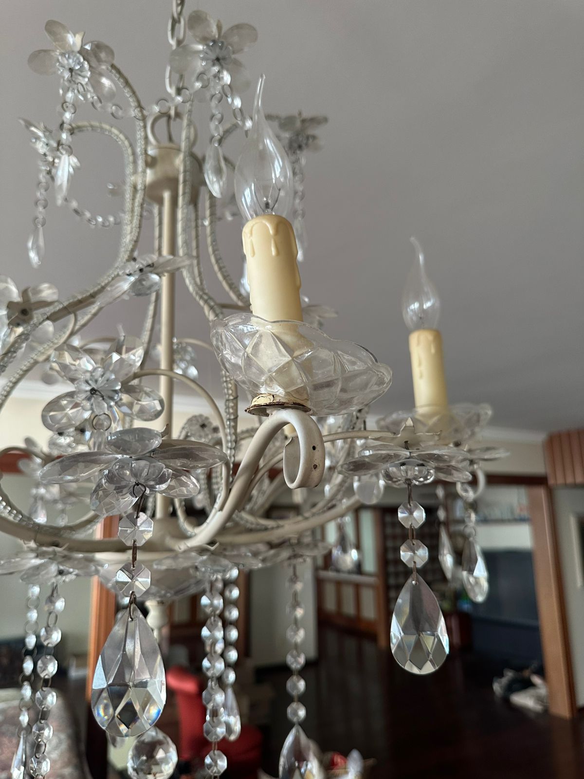LUSTRE — 6 BRAÇOS — LÂMPADAS VELA — FERRO + CRISTAL + ACRÍLICO — M135.56