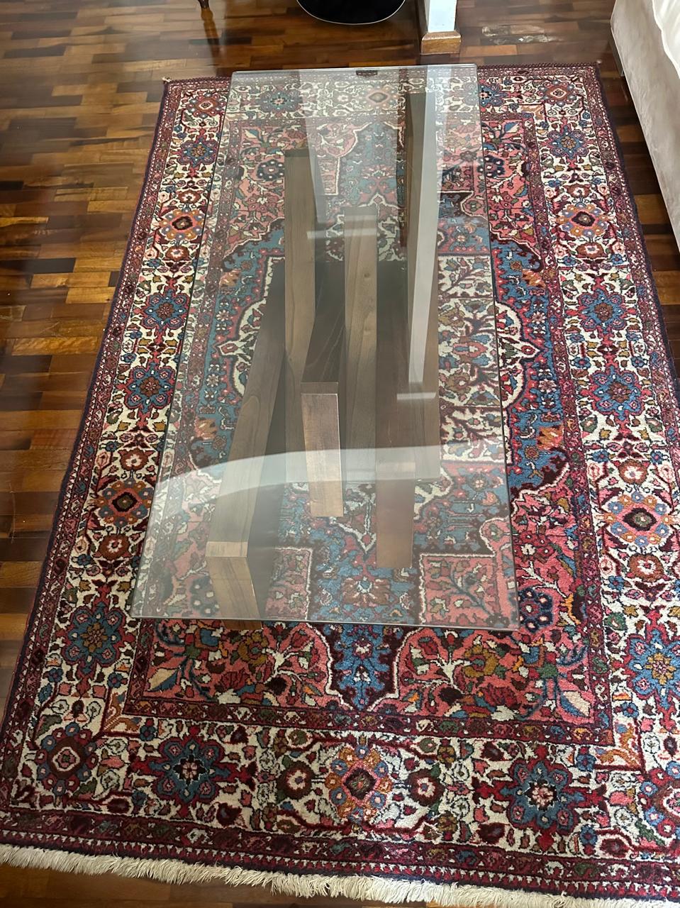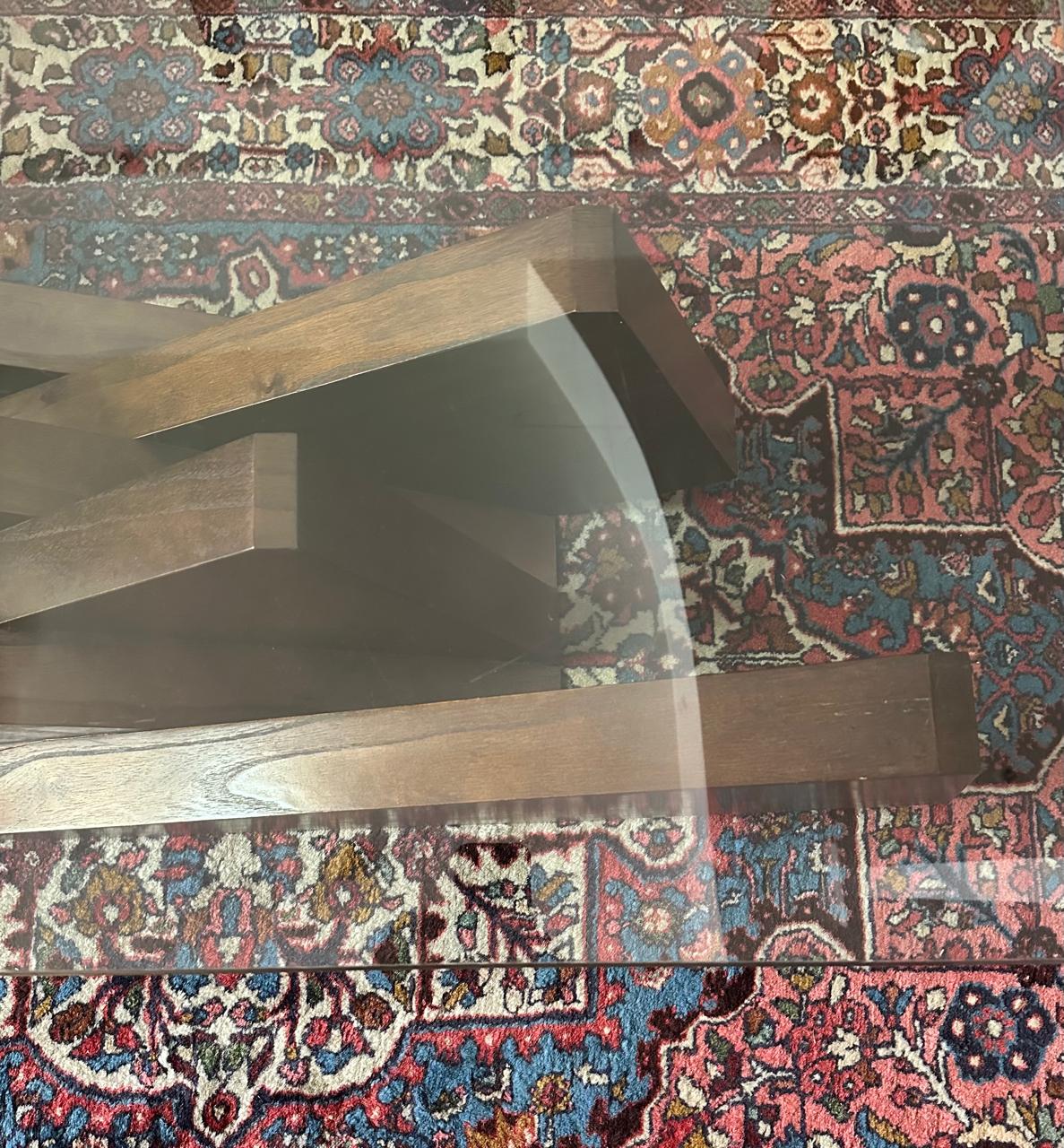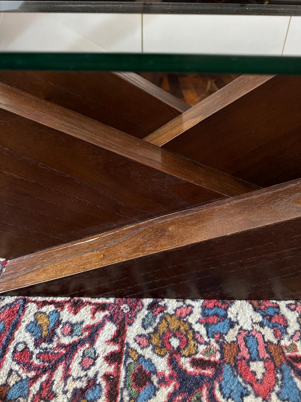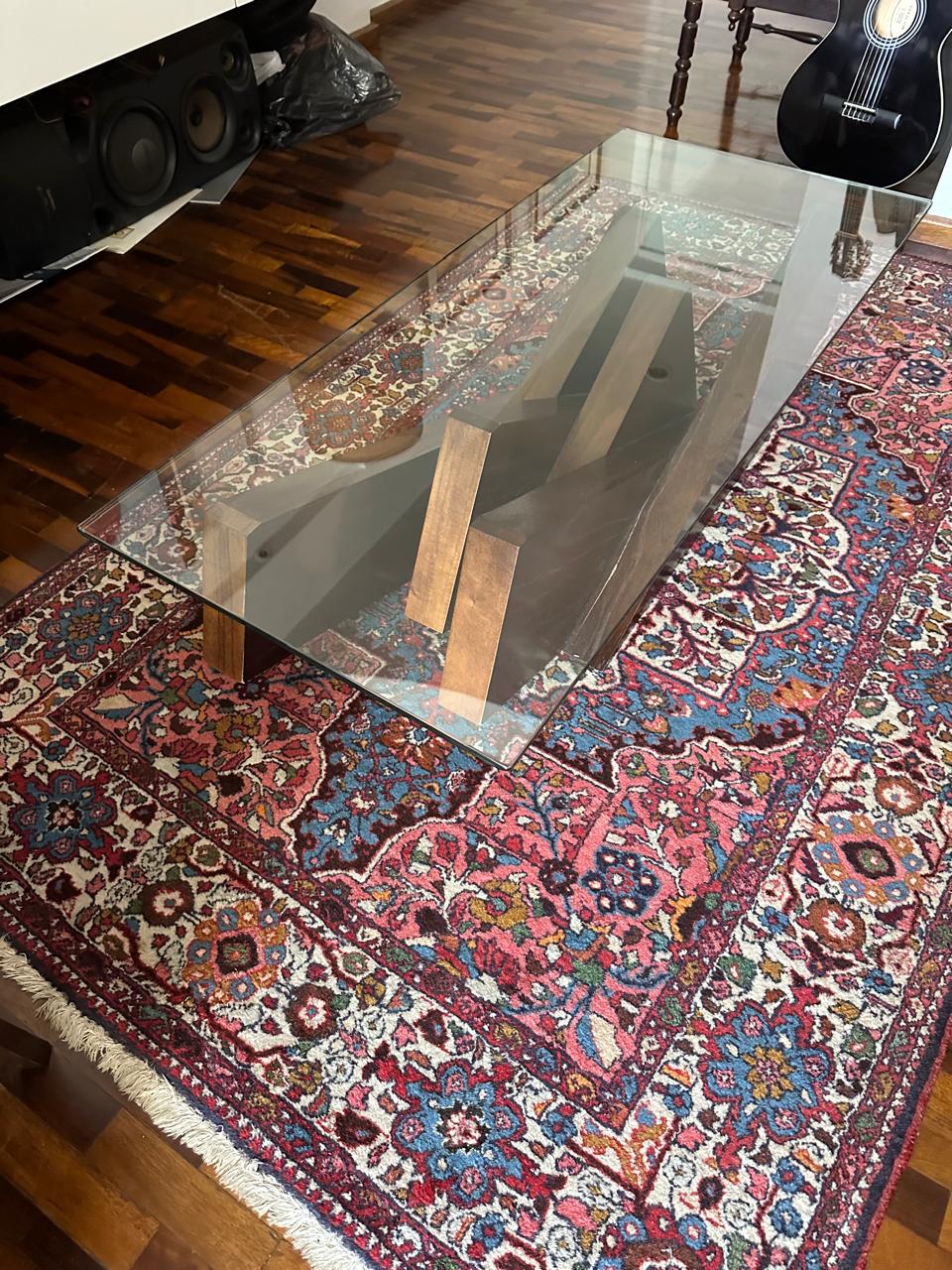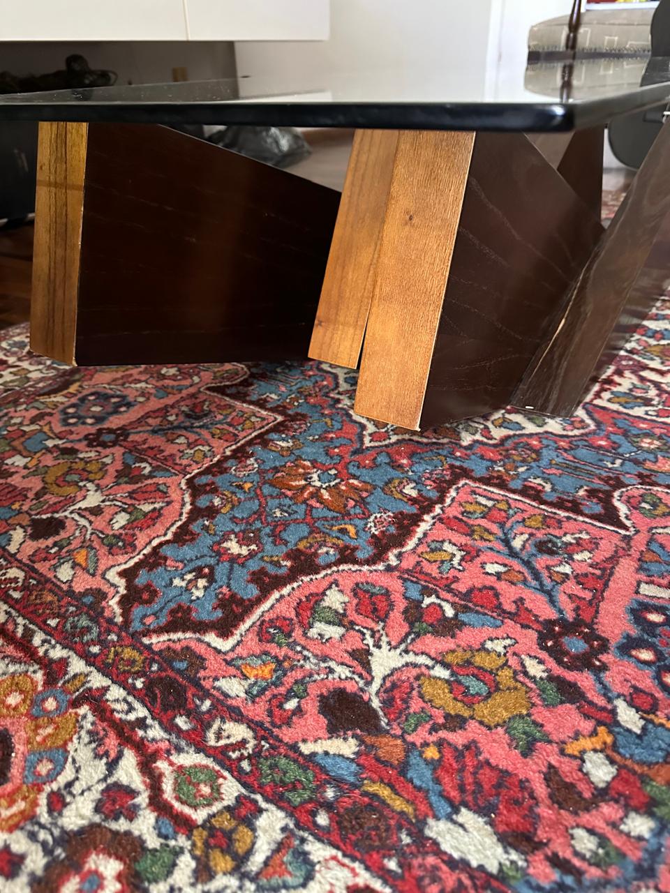 MESA DE CENTRO DIFERENTONA ! — PÉ CENTRAL MADEIRA — QUASE UMA ESCULTURA — TAMPO EM VIDRO PARA PODER MOSTRAR O DETALHE DA BASE — VIDRO DE 12MM — J063.01
