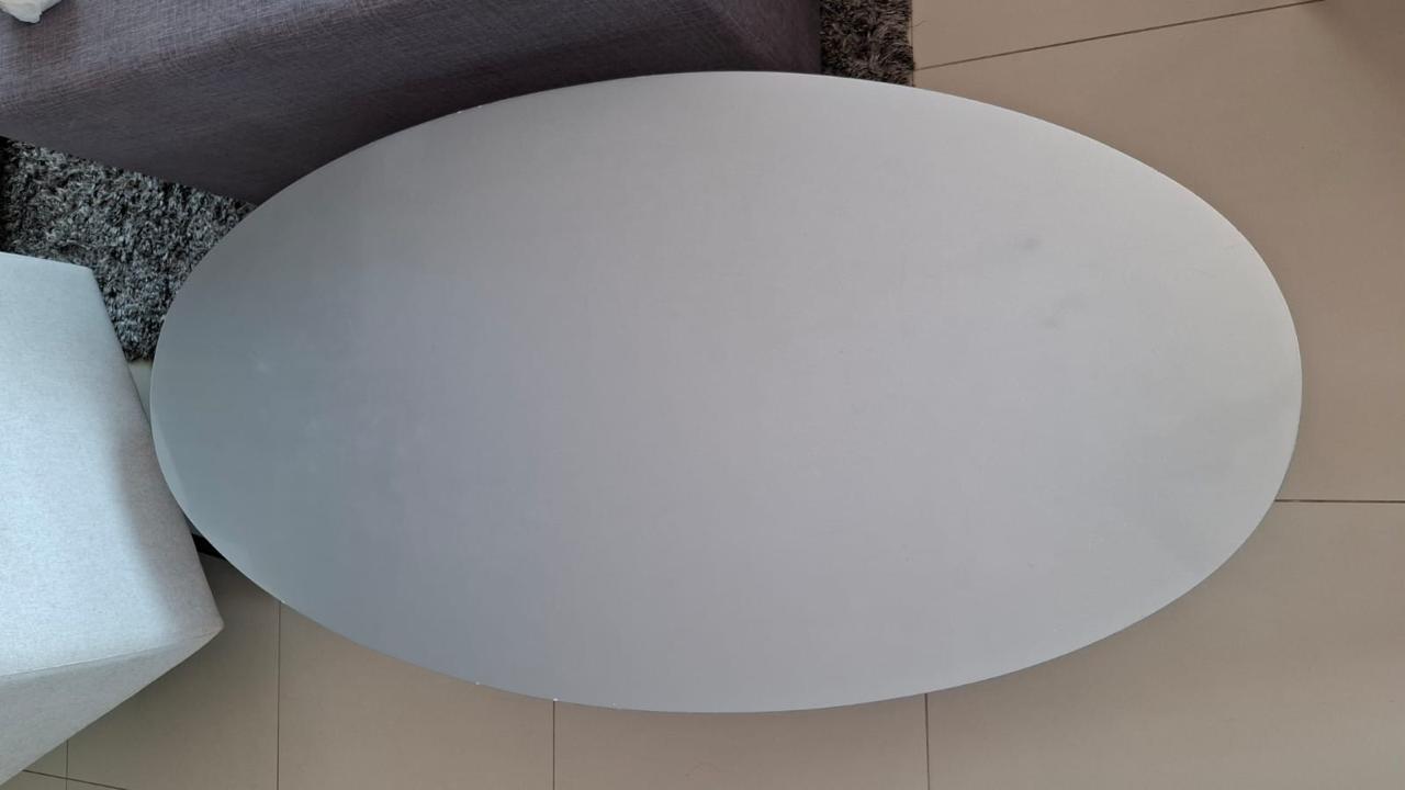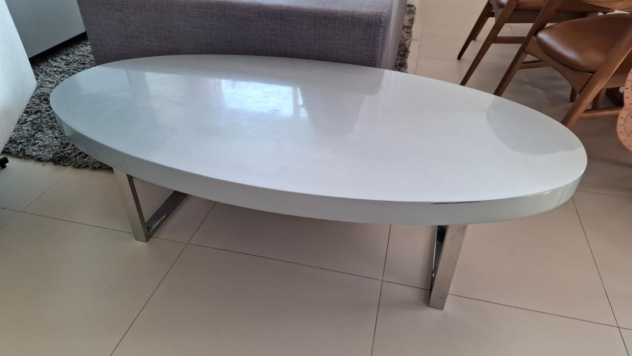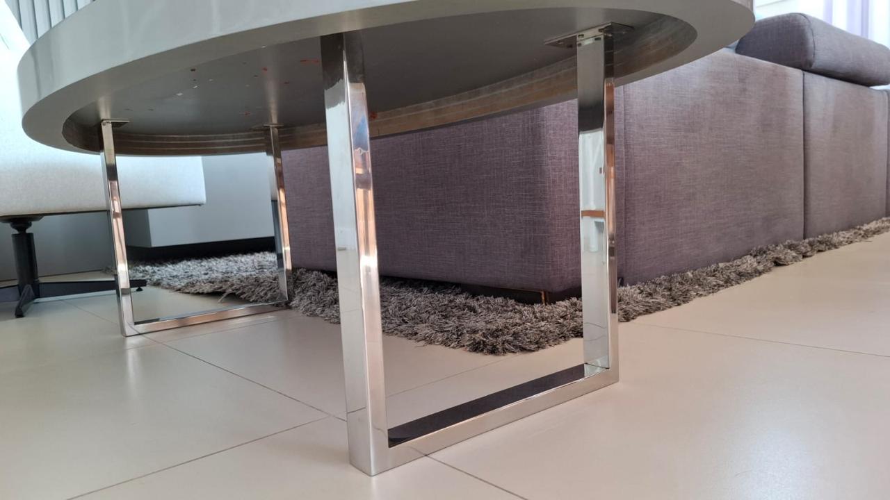 MESA DE CENTRO – FORMATO ELÍPTICO – LACA CINZA COM CINTILANTE COMO PURPURINA – PEQUENOS DETALHES NAS BORDAS – PÉS DE AÇO INOX – PEÇA BEM BACANA — D063.07
