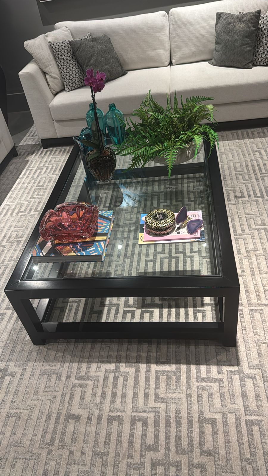 MESA DE CENTRO – LACA PRETA E VIDRO – CLÁSSICA E AO MESMO TEMPO CONTEMPORÂNEA — L071.102