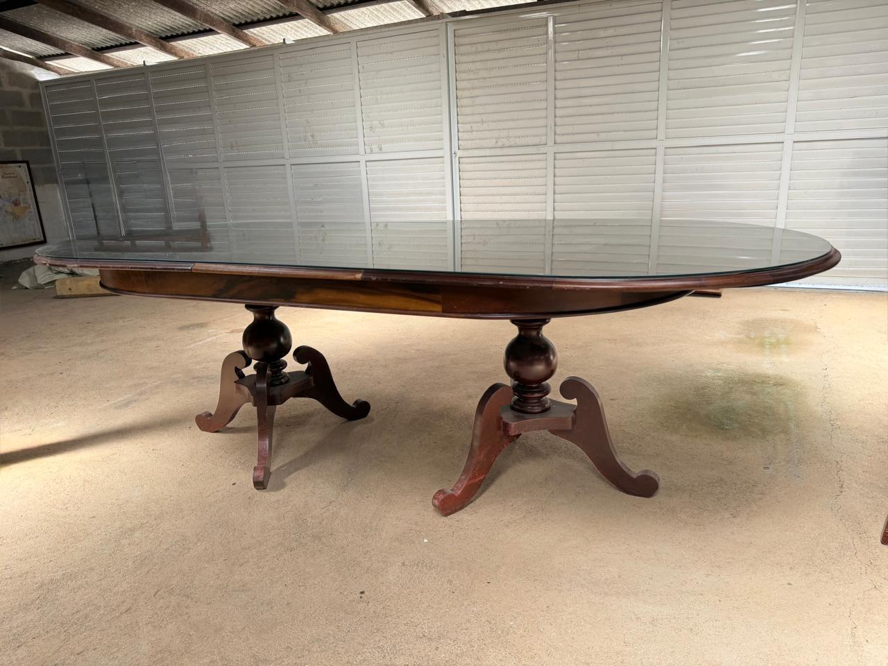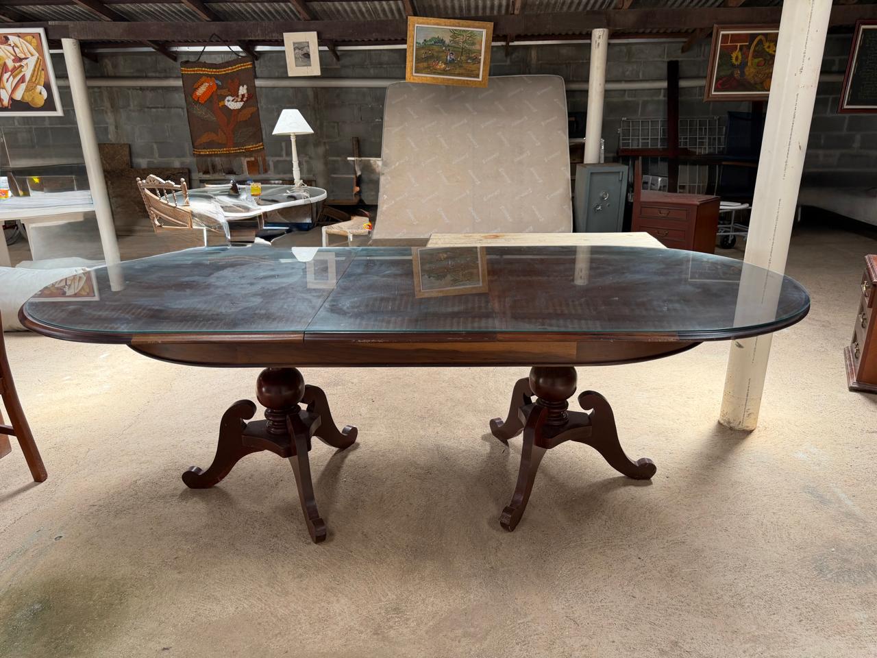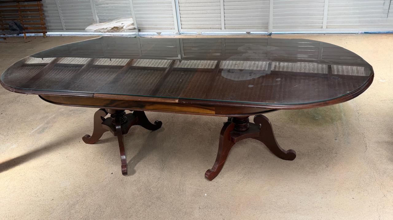 MESA DE JANTAR – GRANDE – COM EXPANSOR – SOBRETAMPO DE VIDRO – EXTREMIDADES ARREDONDADAS – 2 PÉS TORNEADOS – LÂMINA NO TAMPO — L079.104