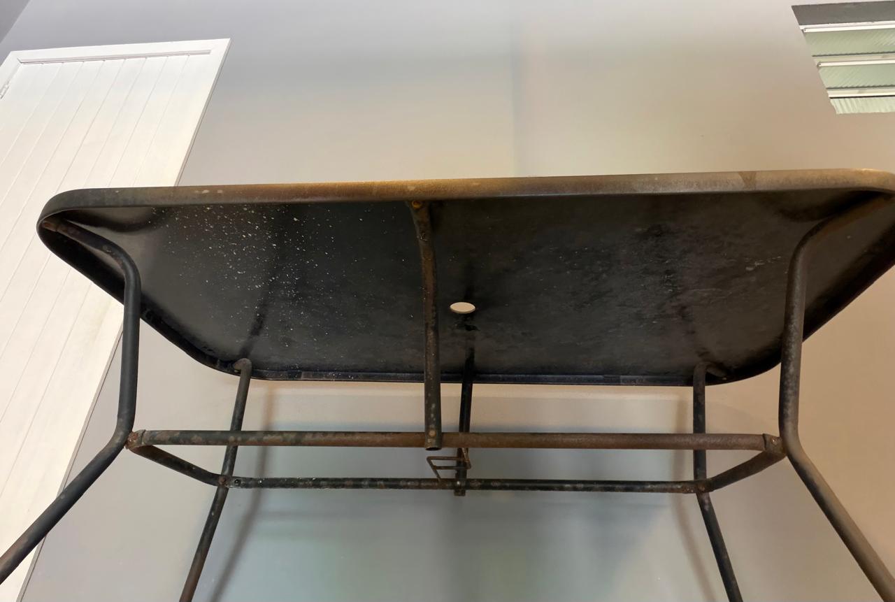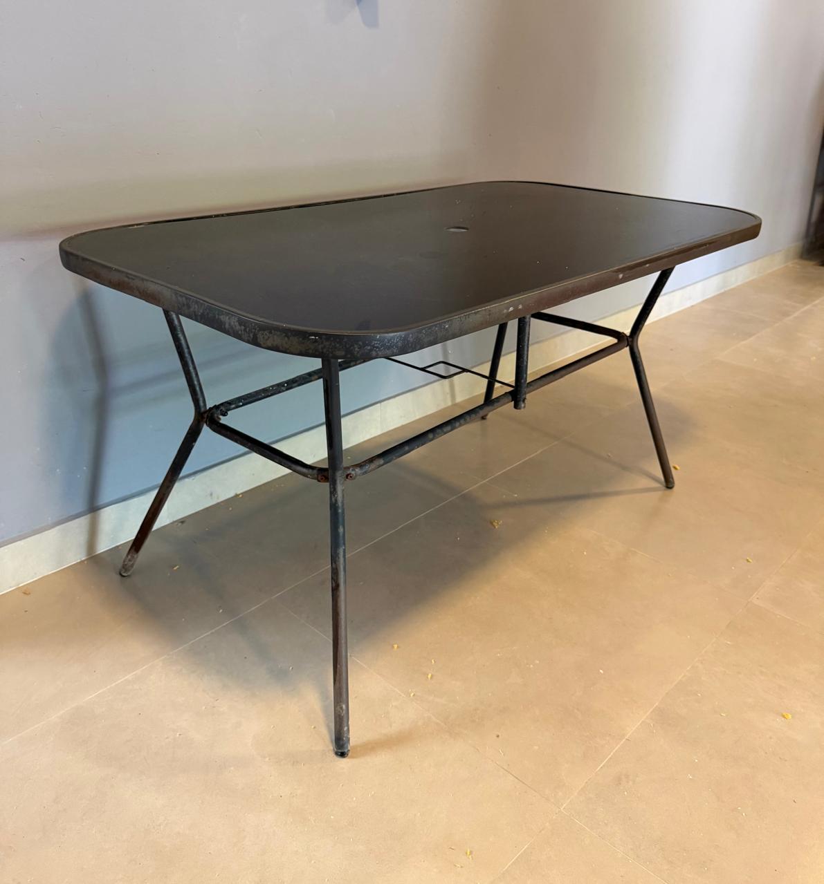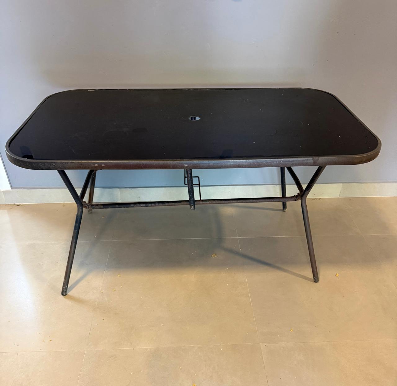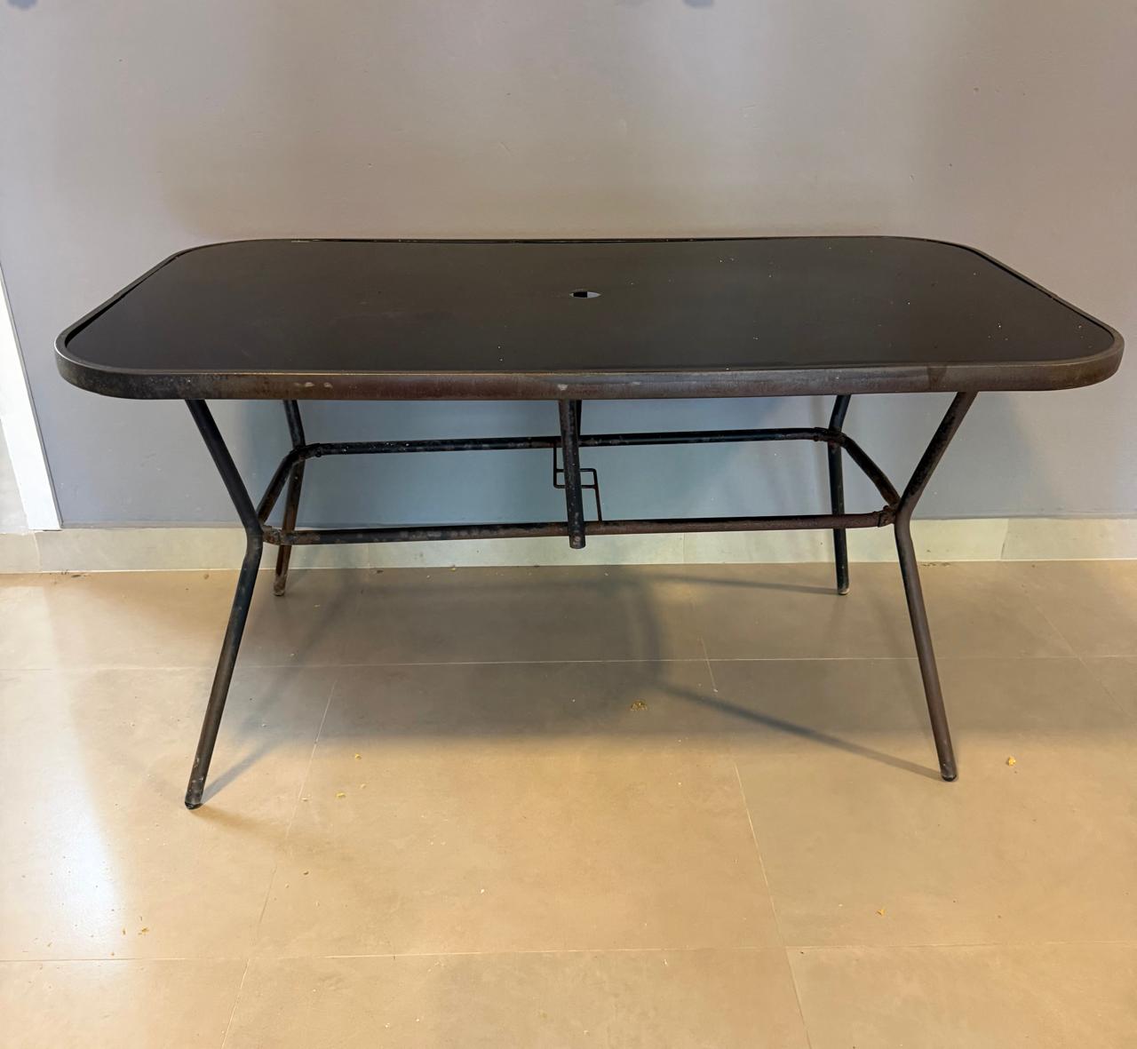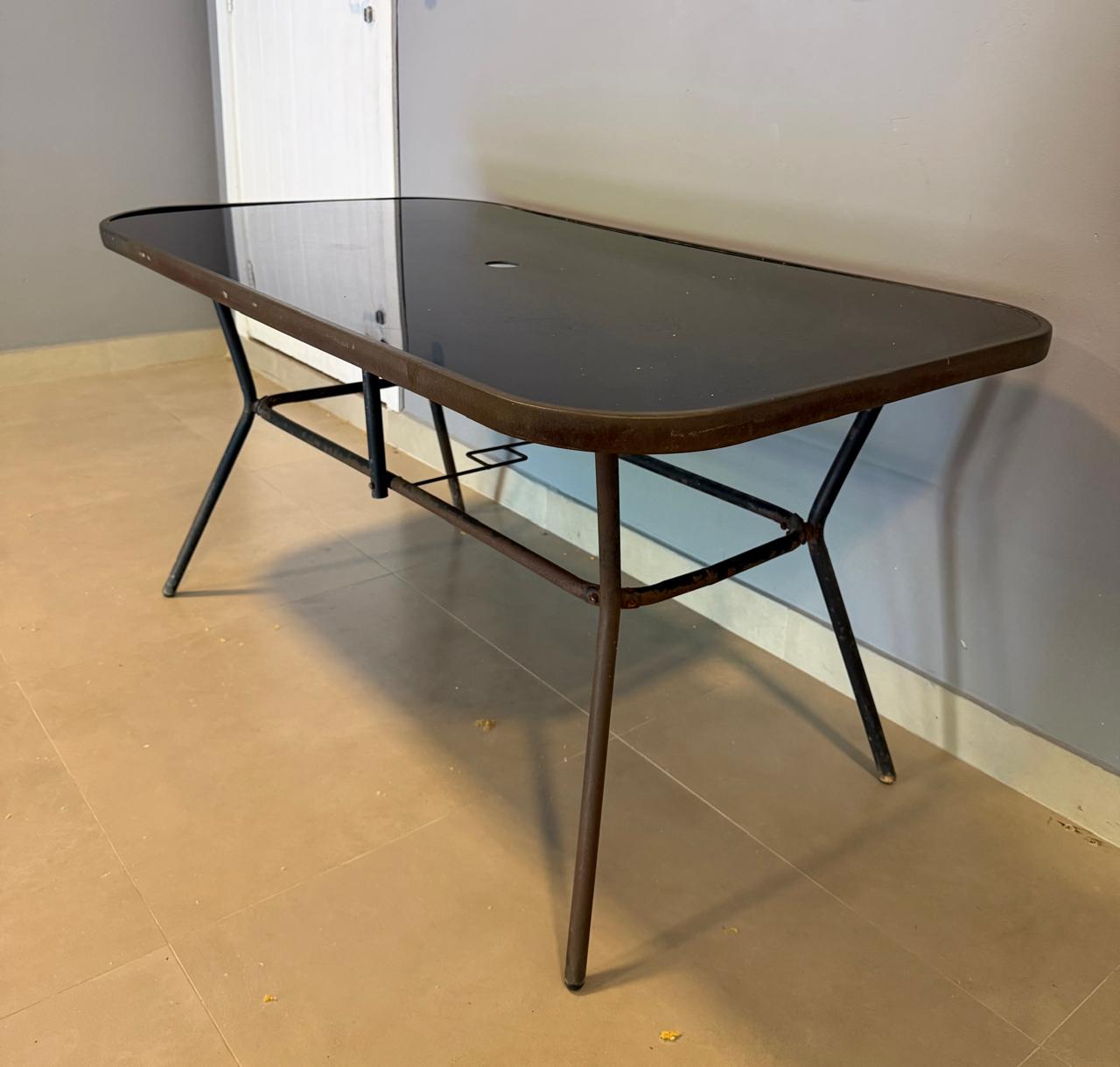 MESA RETANGULAR – TAMPO VIDRO PRETO + FURO CENTRAL PARA GUARDA-SOL – BASE FERRO – ÁREA EXTERNA COBERTA — G060.10