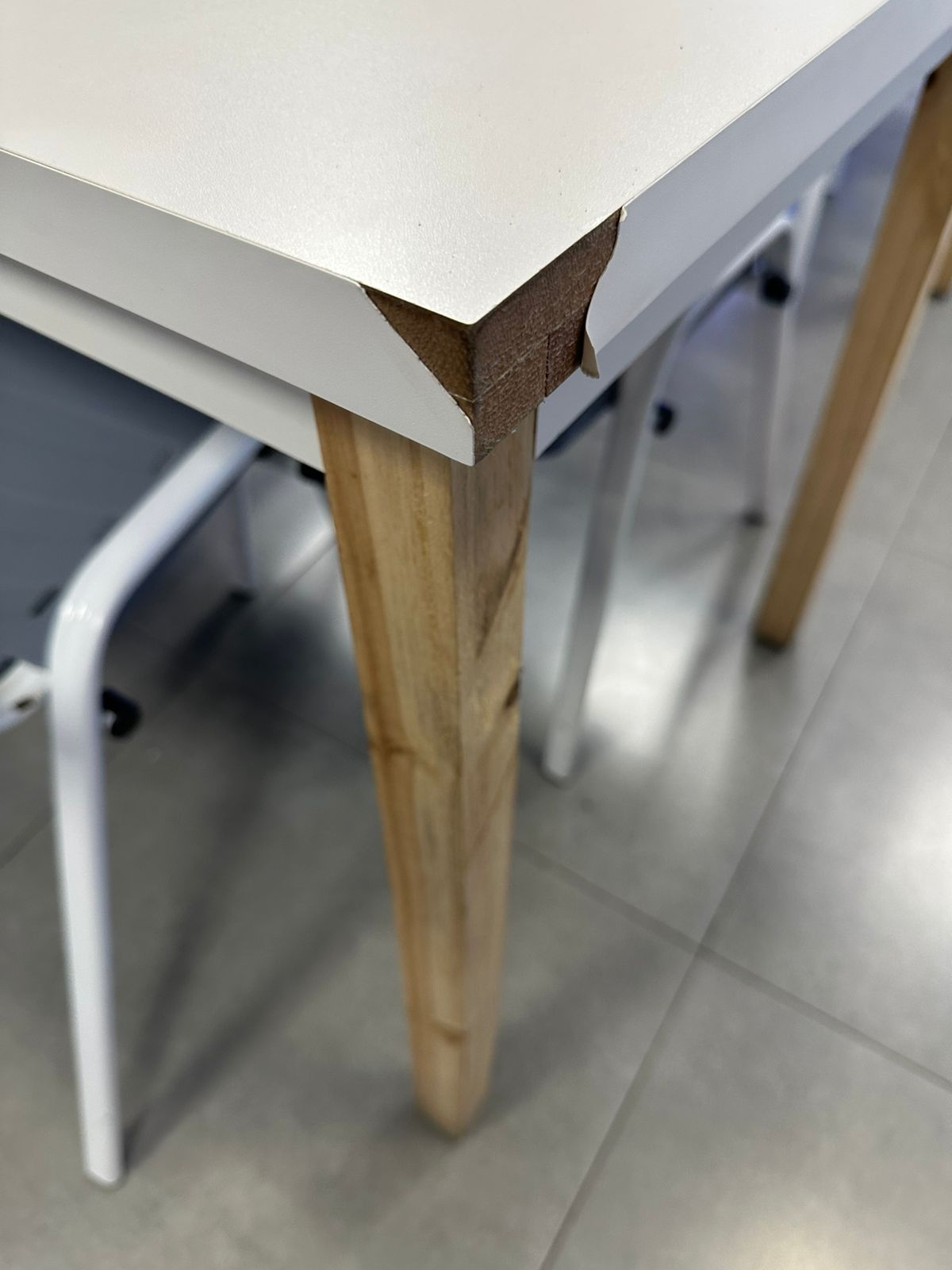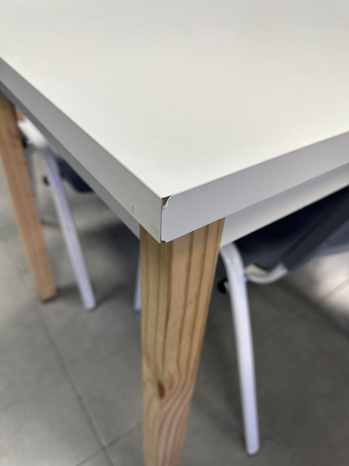 As bordas das mesas tem o acabamento comum do MDF: Fita de borda branca