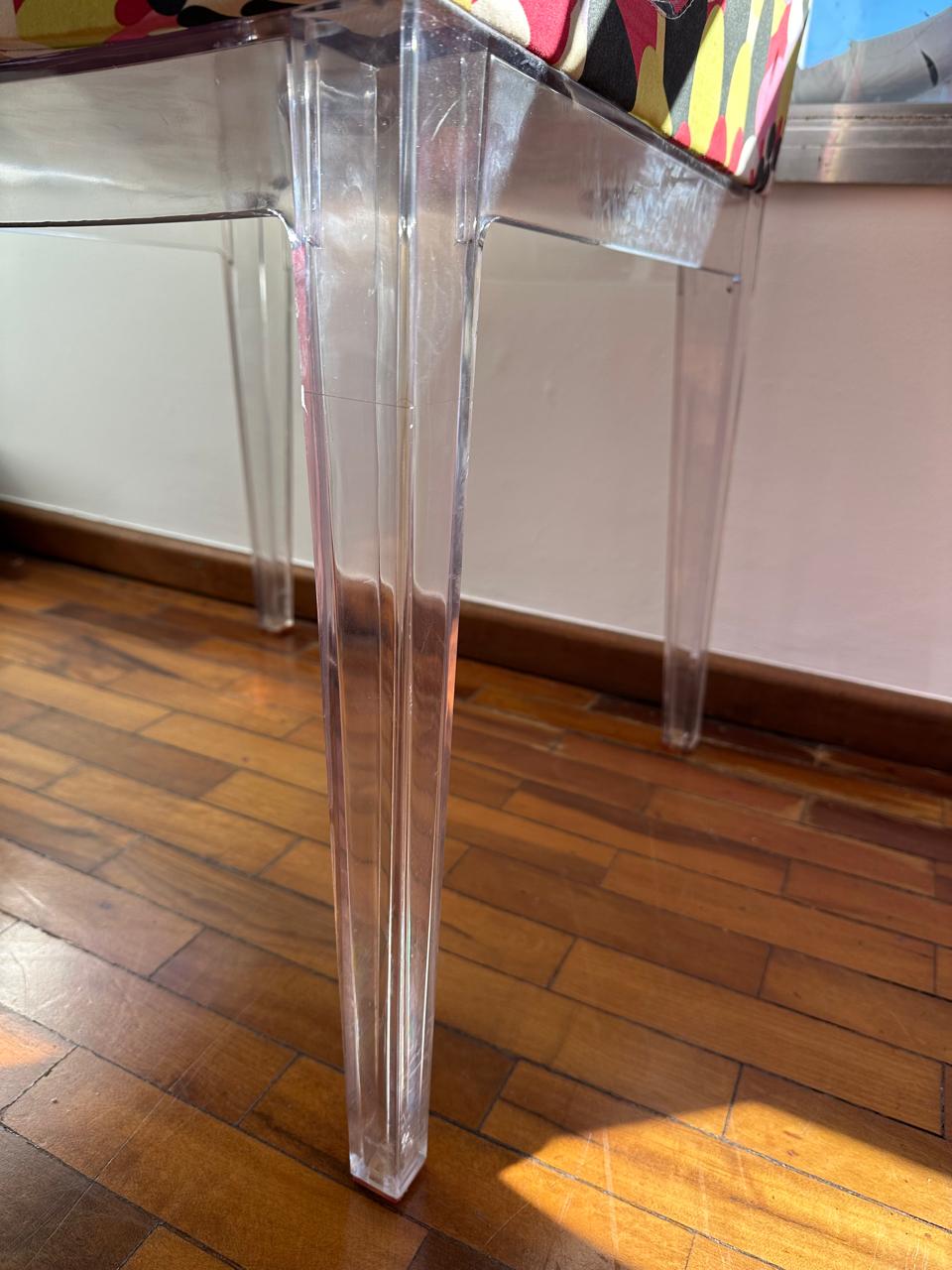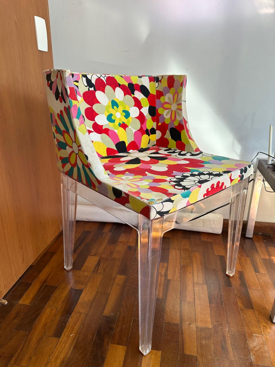 OBA !!! OLHA SÓ O QUE APARECEU POR AQUI !!! PHILLIPE STARCK ASSINA A CADEIRA MADEMOISELLE PARA KARTELL — ESTRUTURA EM POLICARBONATO TRANSPARENTE — ASSENTO E ENCOSTO EM POLIURETANO REVESTIDO EM TECIDO 100% ALGODÃO COM PADRÃO CHAMADO “WHITE POIS” — ORIGINAL DA KARTELL — UM ÍCONE — TECIDO COM LEVE ROTO NA BORDA, E QUEM SE IMPORTA ?  — J063.03