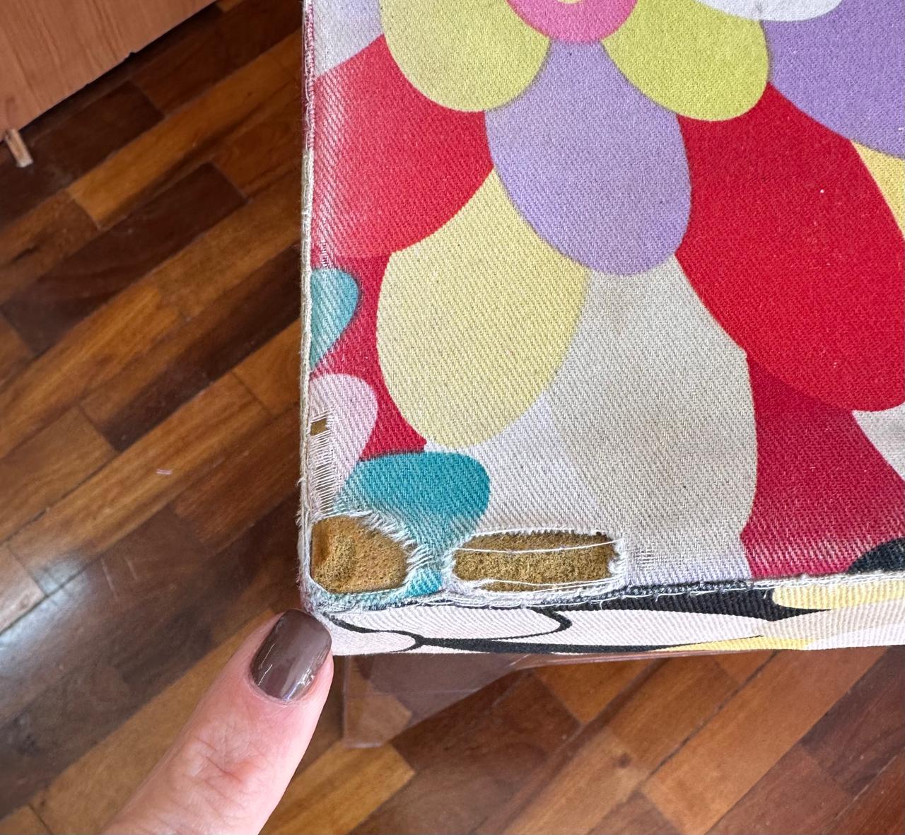 Está com tecido gasto e um pouquinho rasgado na borda do assento
