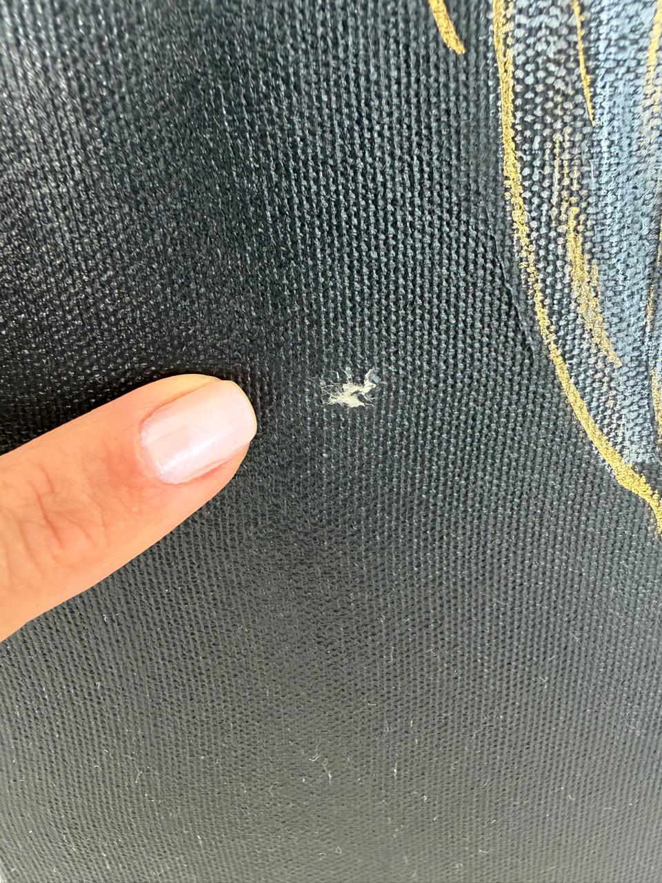 Tem um pequeno furo na tela, destacamos em foto