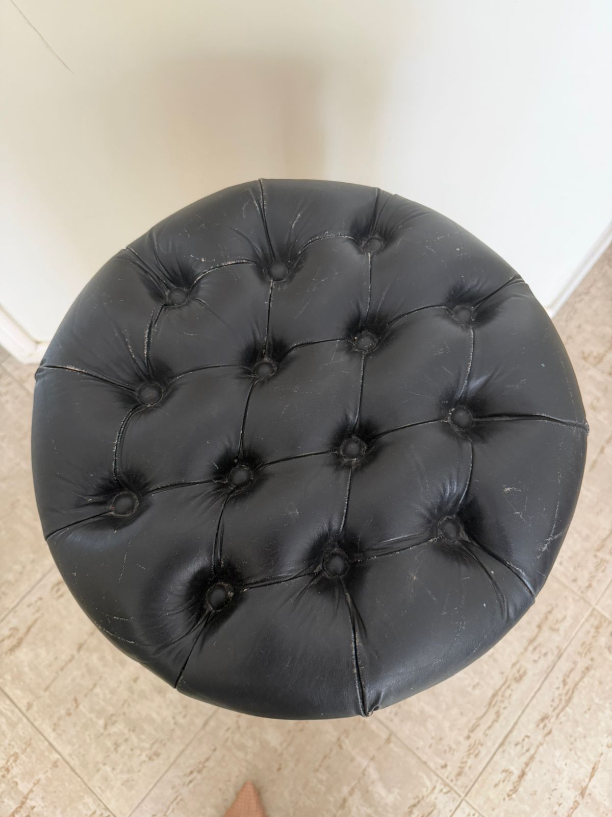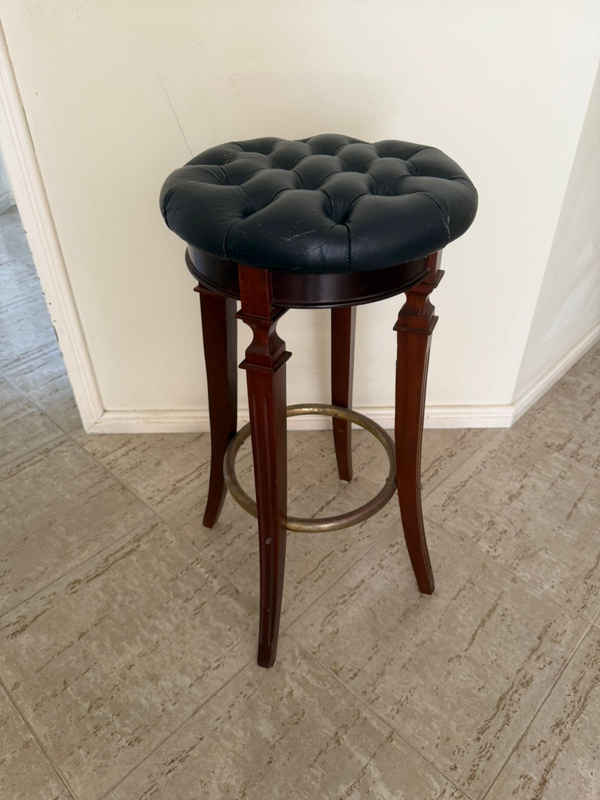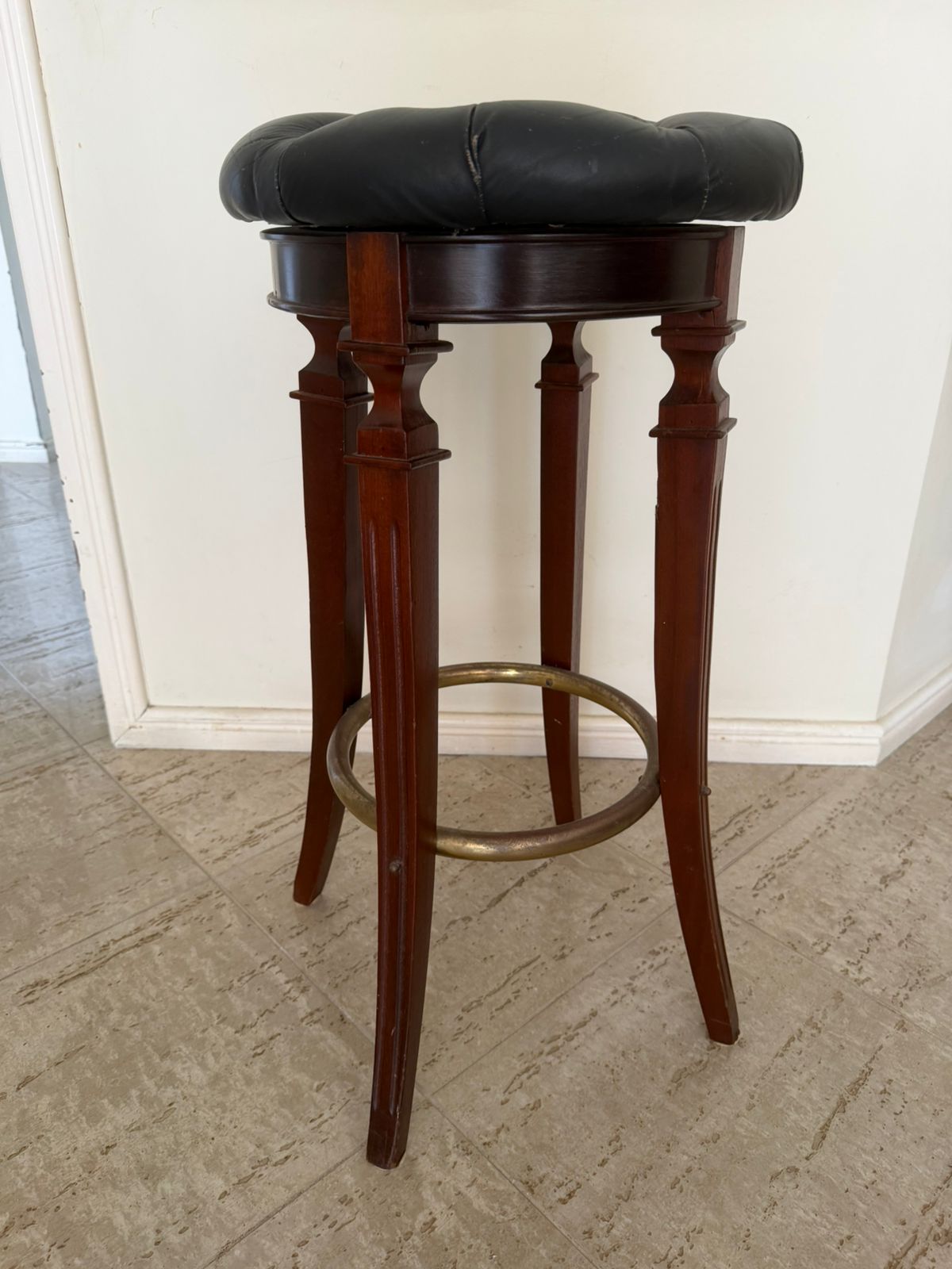 Os tampos são giratórios em capitonê em couro preto – parecem um pouco desgastado – mas é o estilo mesmo