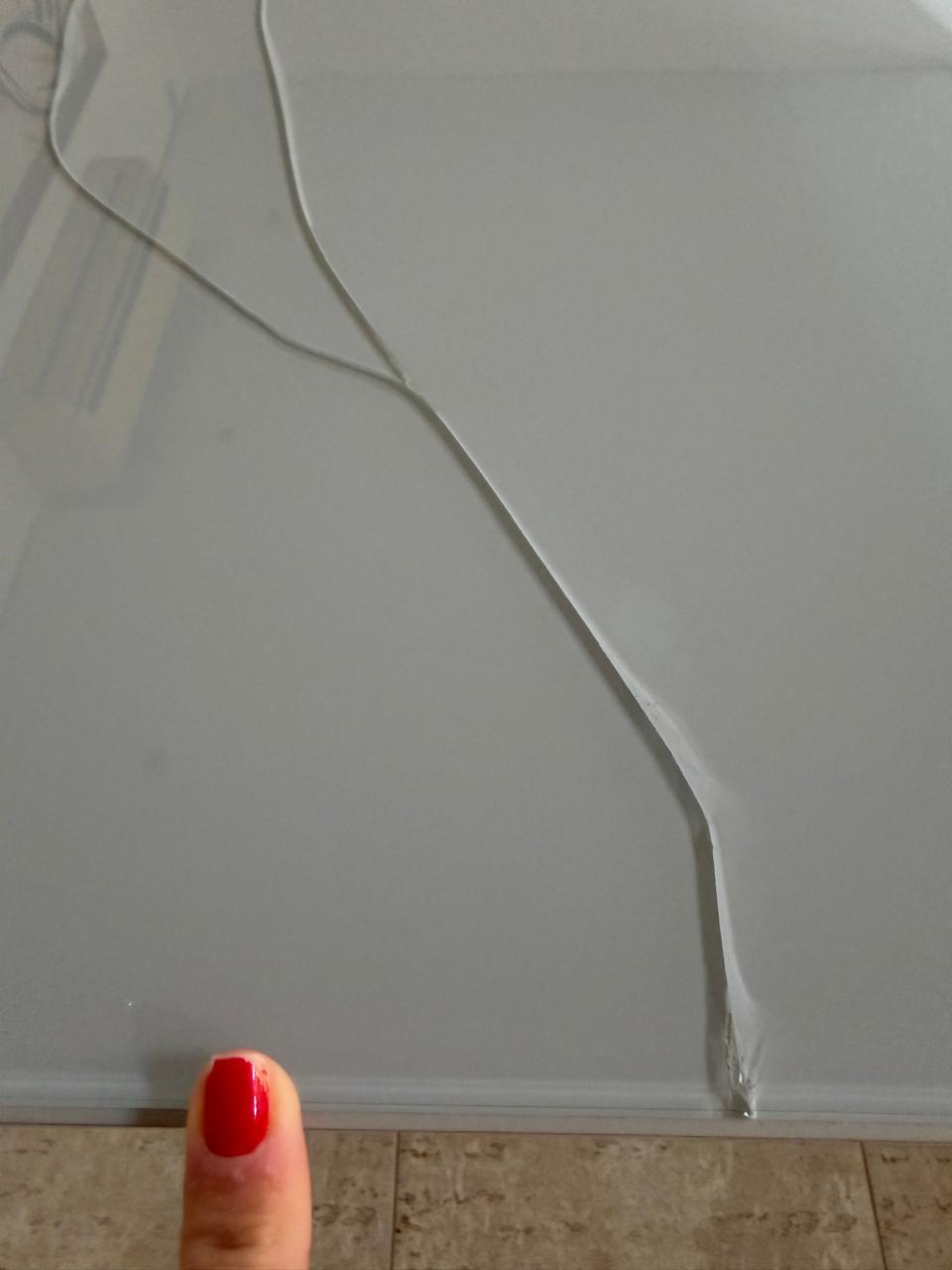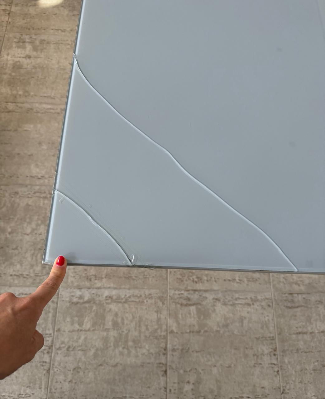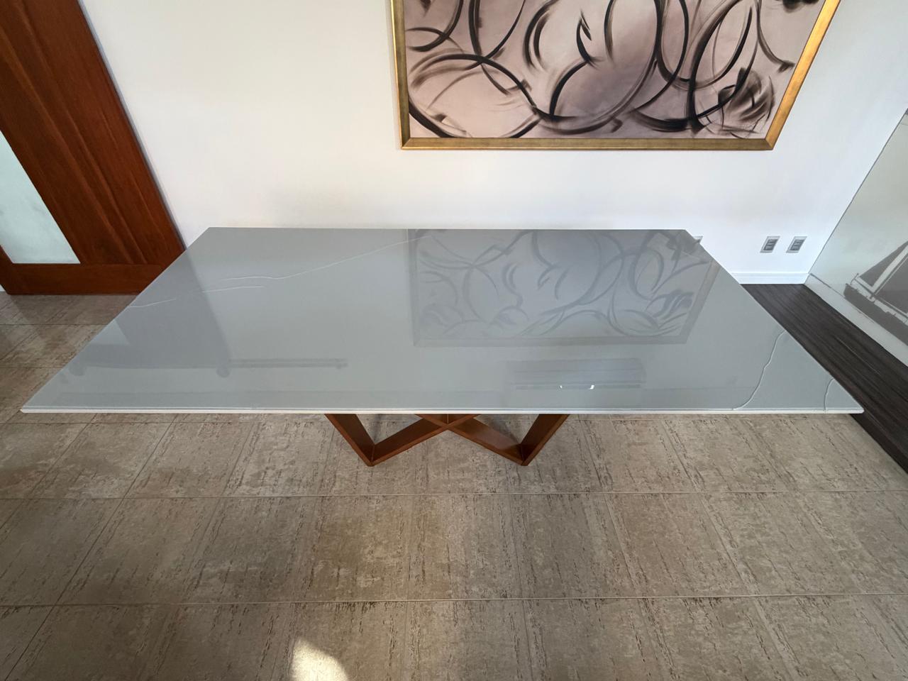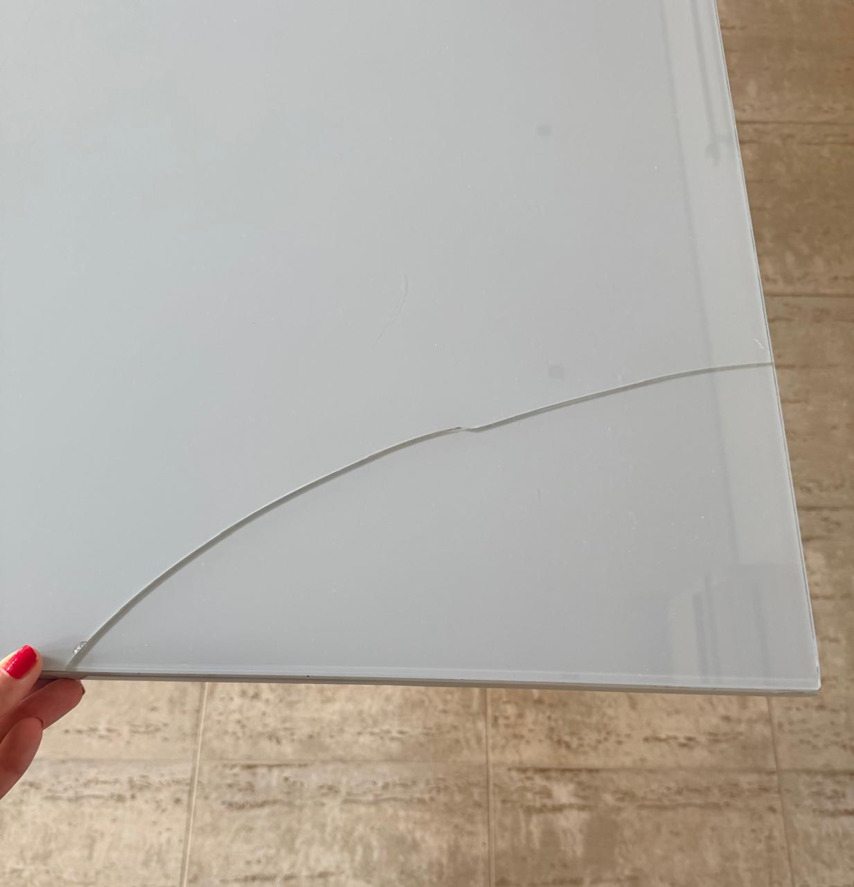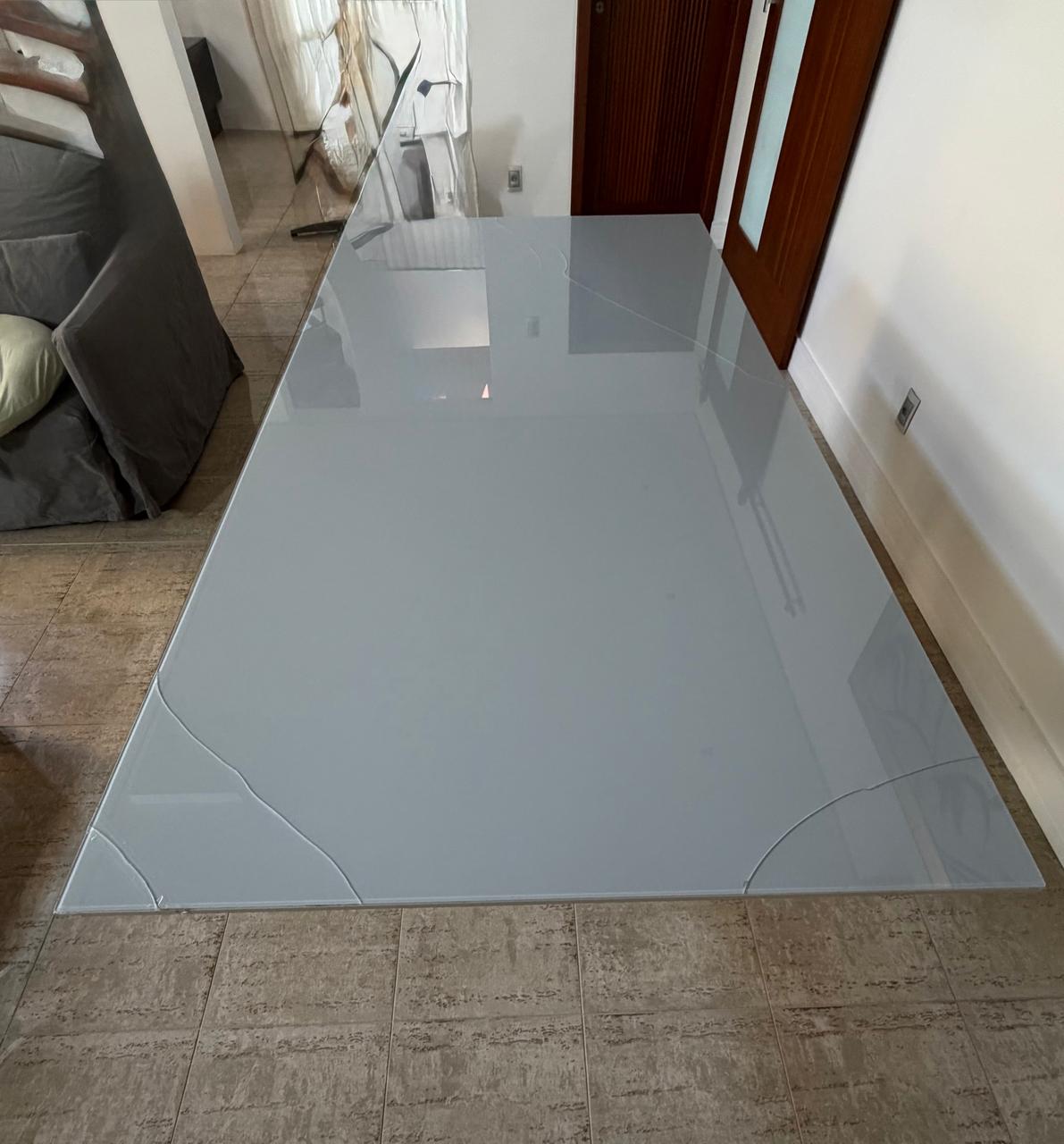 O tampo é em MDF, porém o sobretampo de vidro serigrafado trincou em vários locais