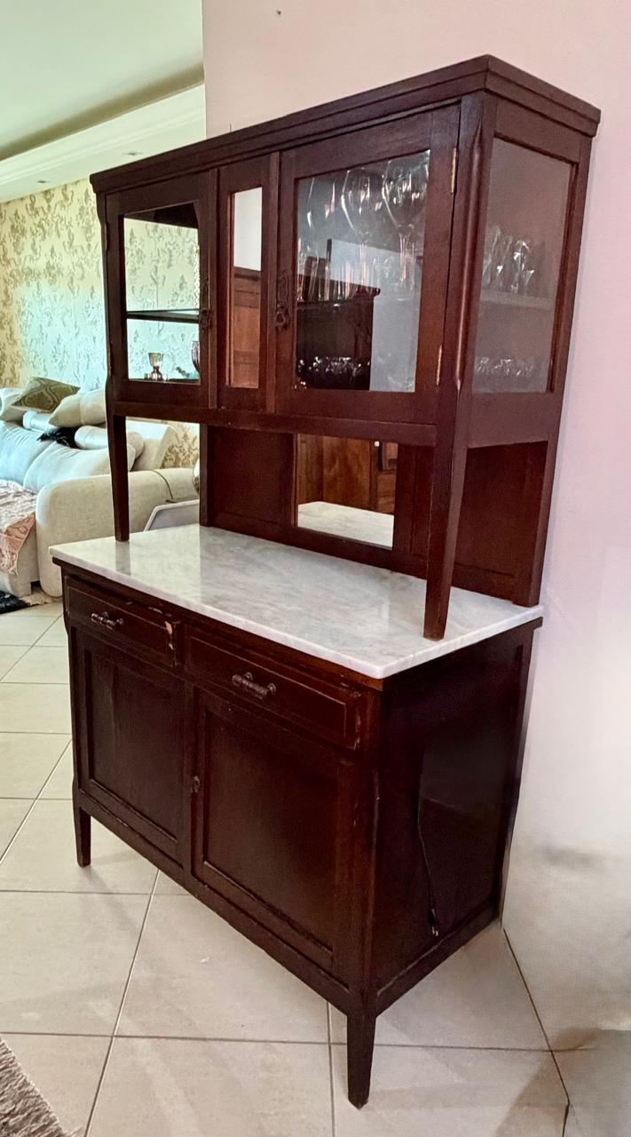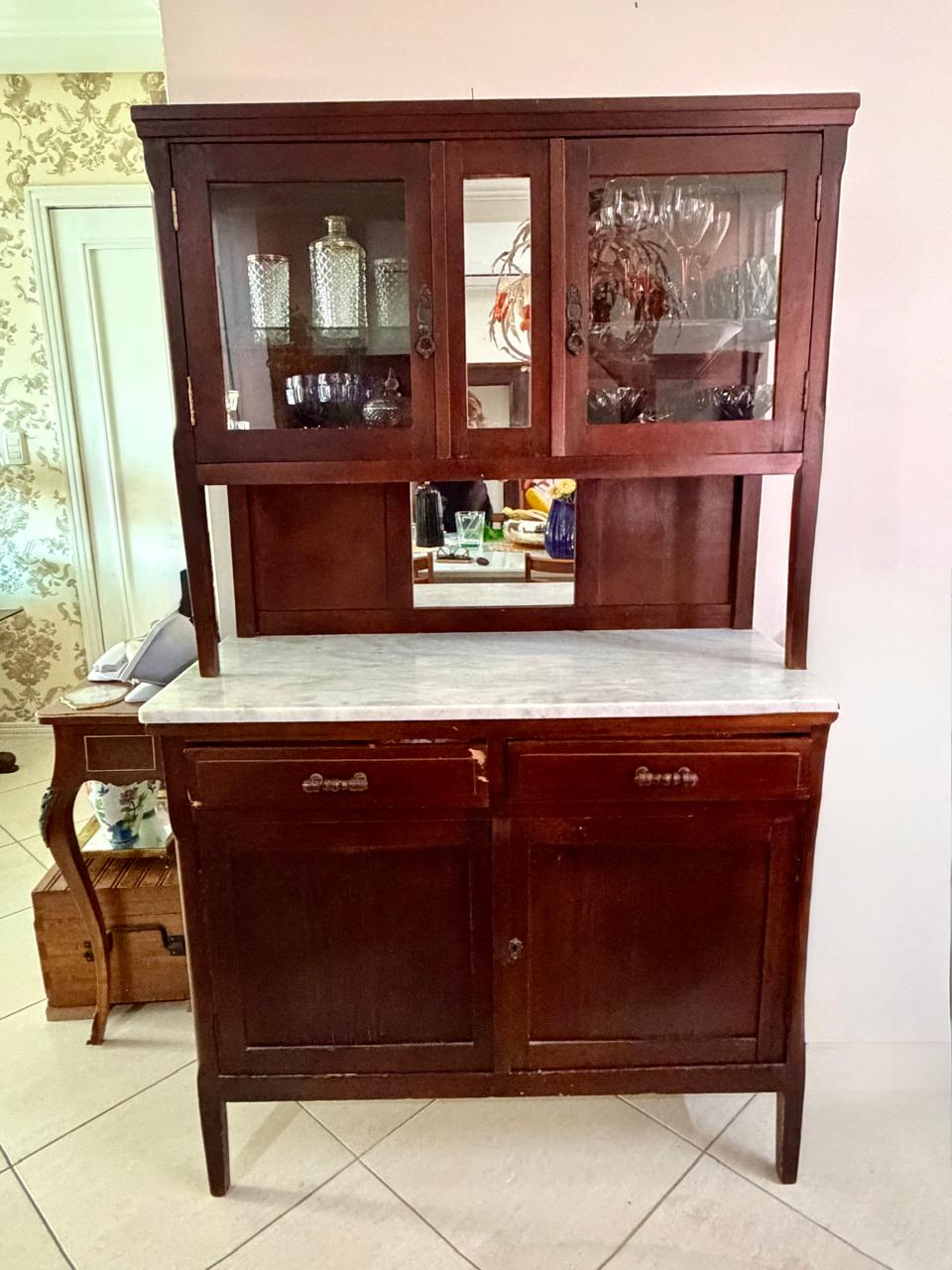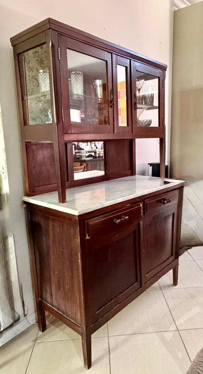 PEÇA ANTIGA – ANOS 1930 – LOUCEIRO GUARDADOR DE ALIMENTOS – MADEIRA + LÂMINA + PEDRA MÁRMORE + ESPELHO E VIDRO — G064.01
