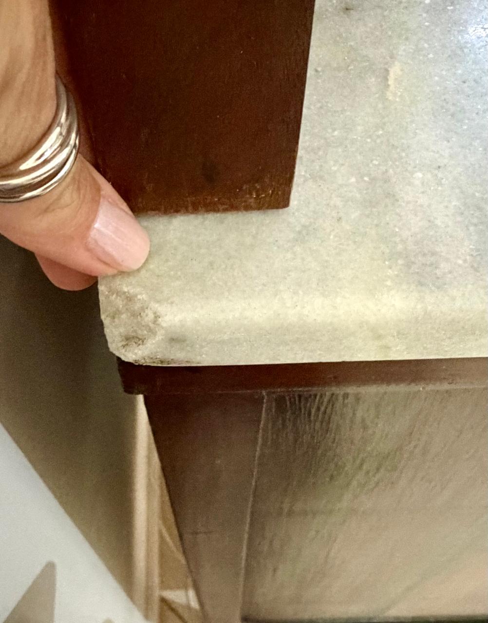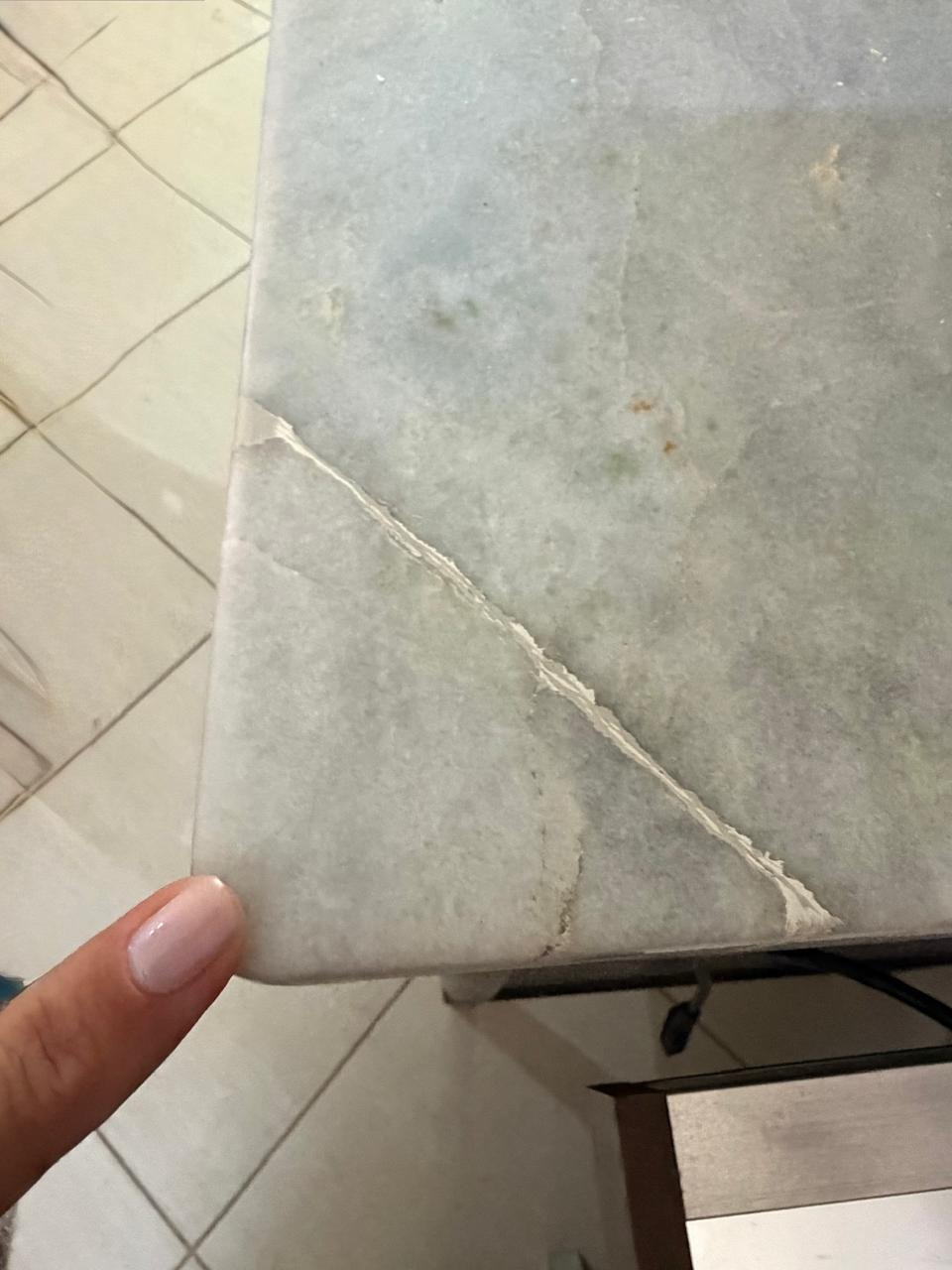 O tampo de mármore tem um remendo em um dos cantos, detalhe na foto