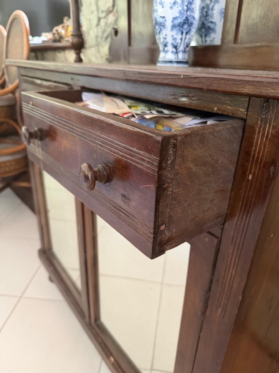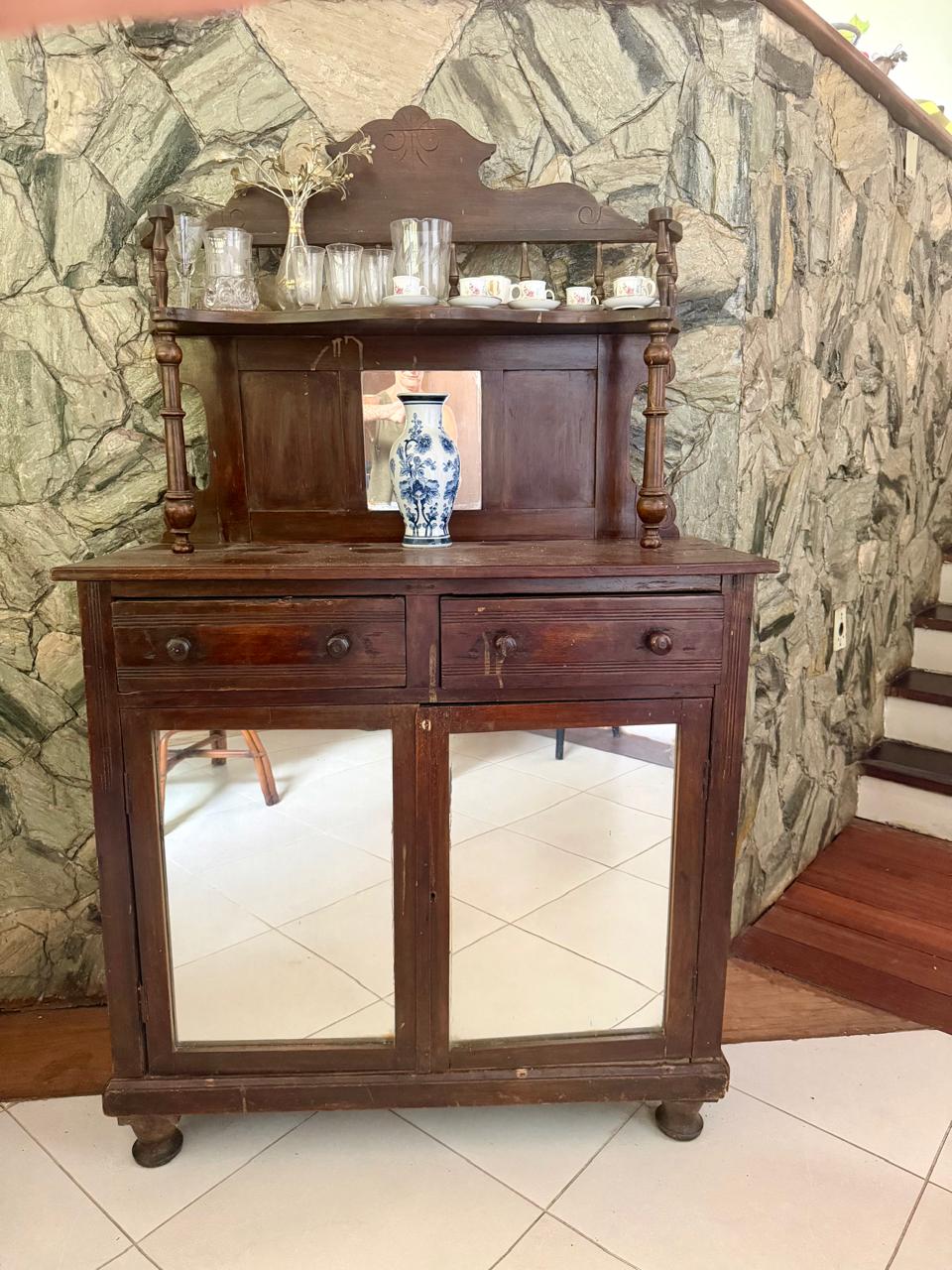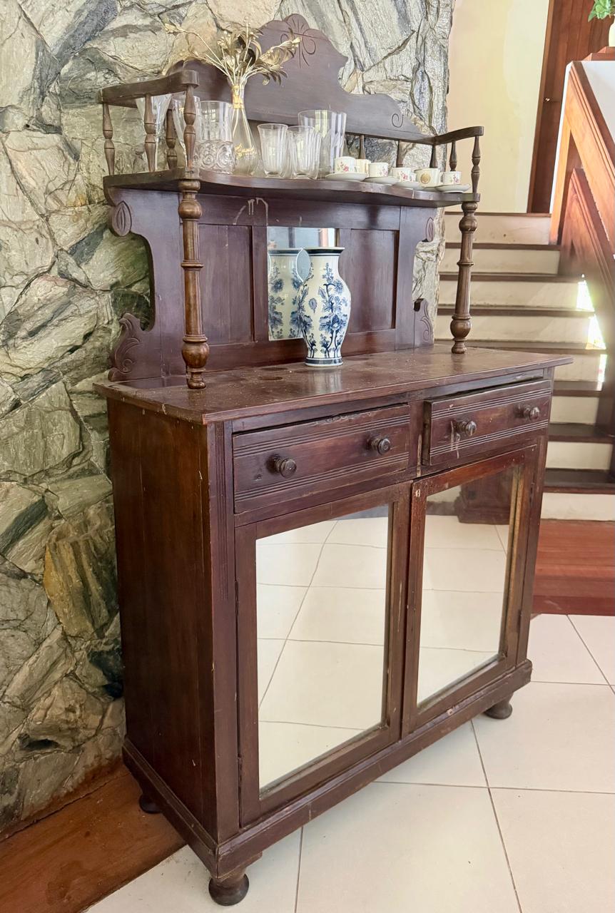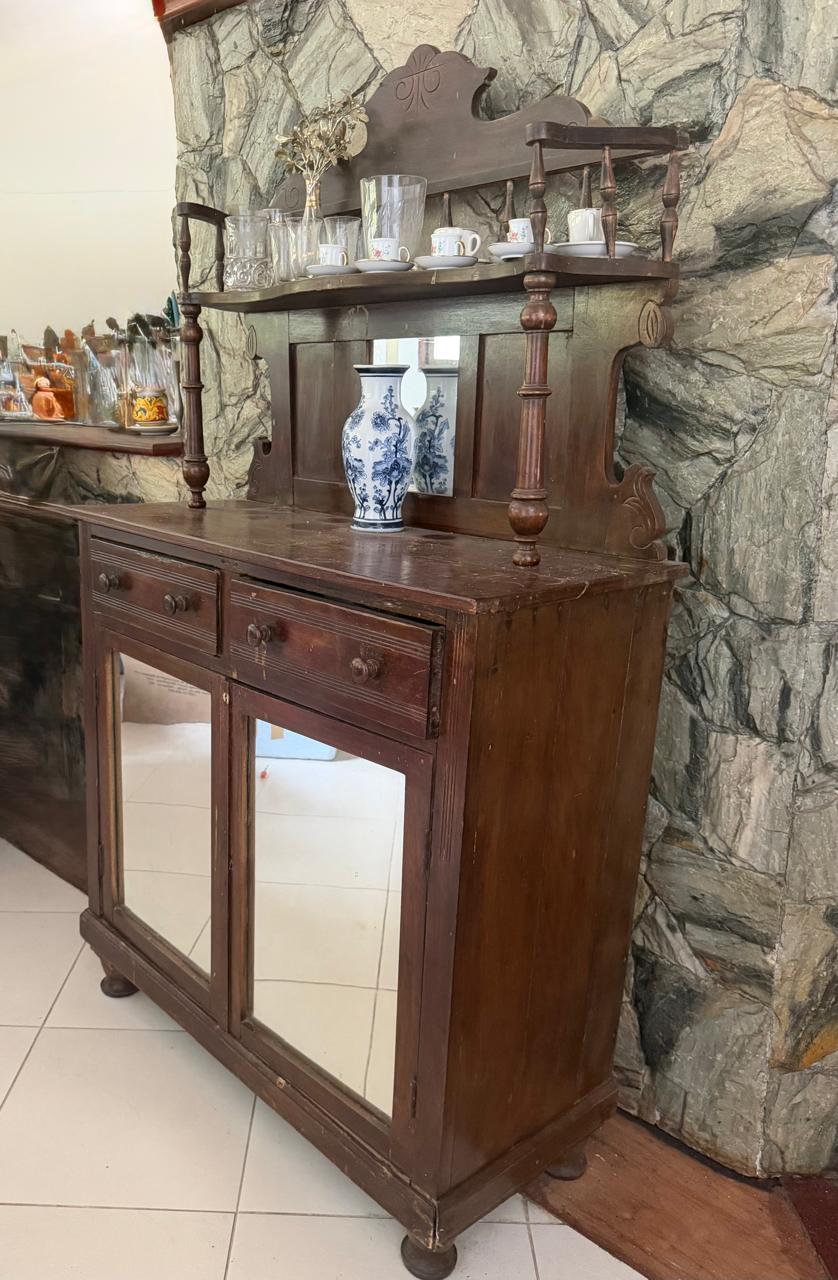 PEÇA DE ANTIQUÁRIO – BAR ANTIGO – MADEIRA + ESPELHO AO FUNDO + ARMARINHO PORTAS DE ESPELHO + TAMPO DE PEDRA — R093.19