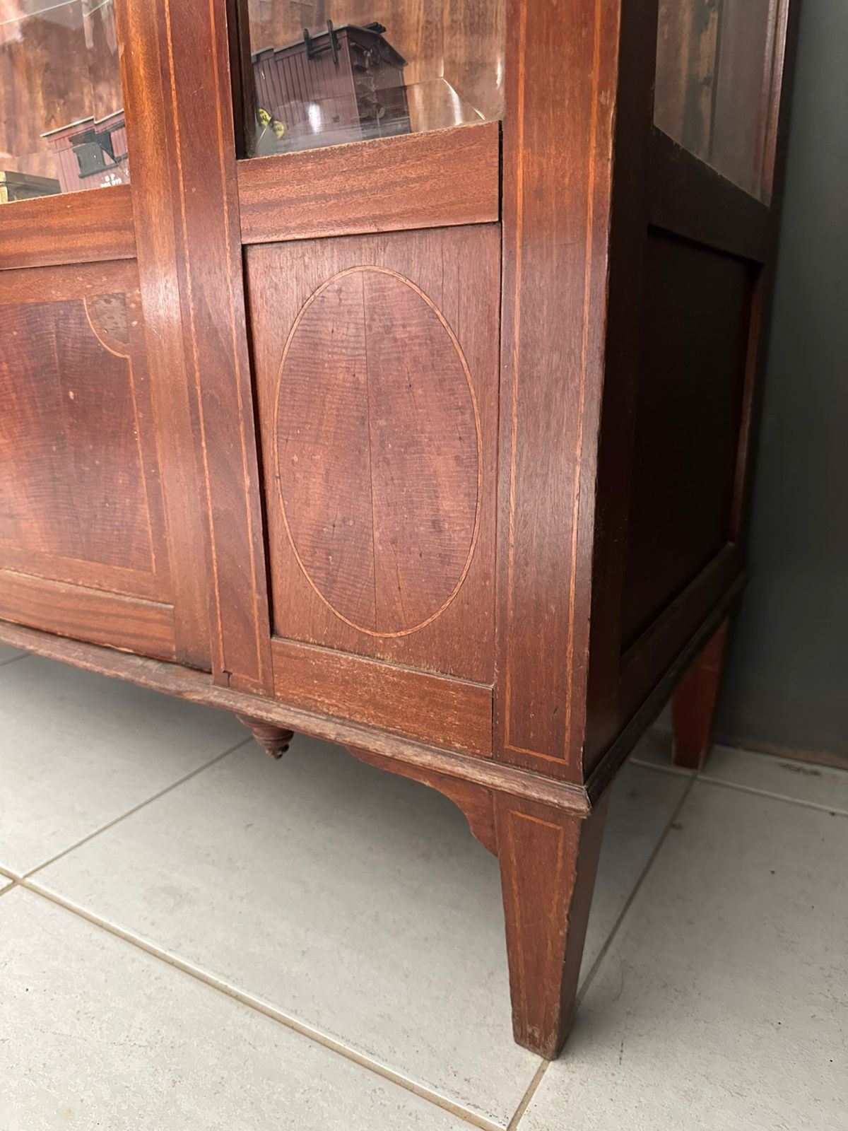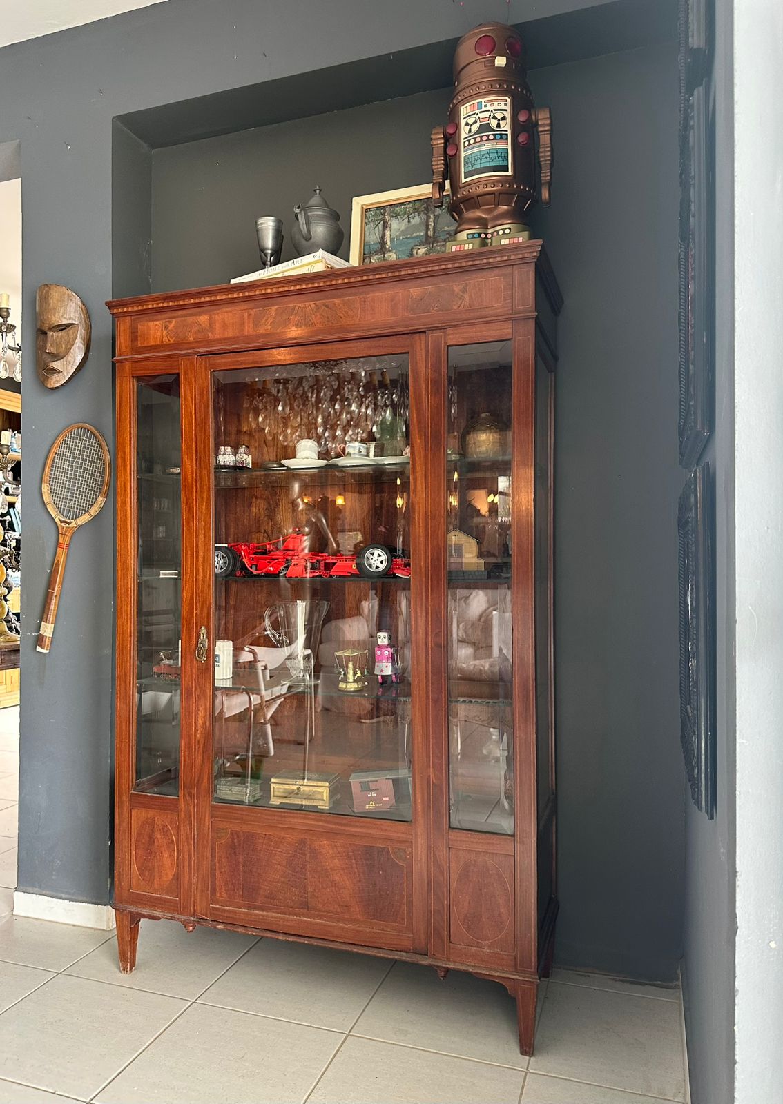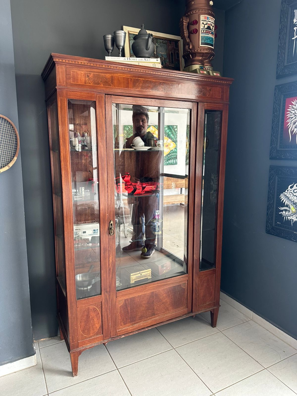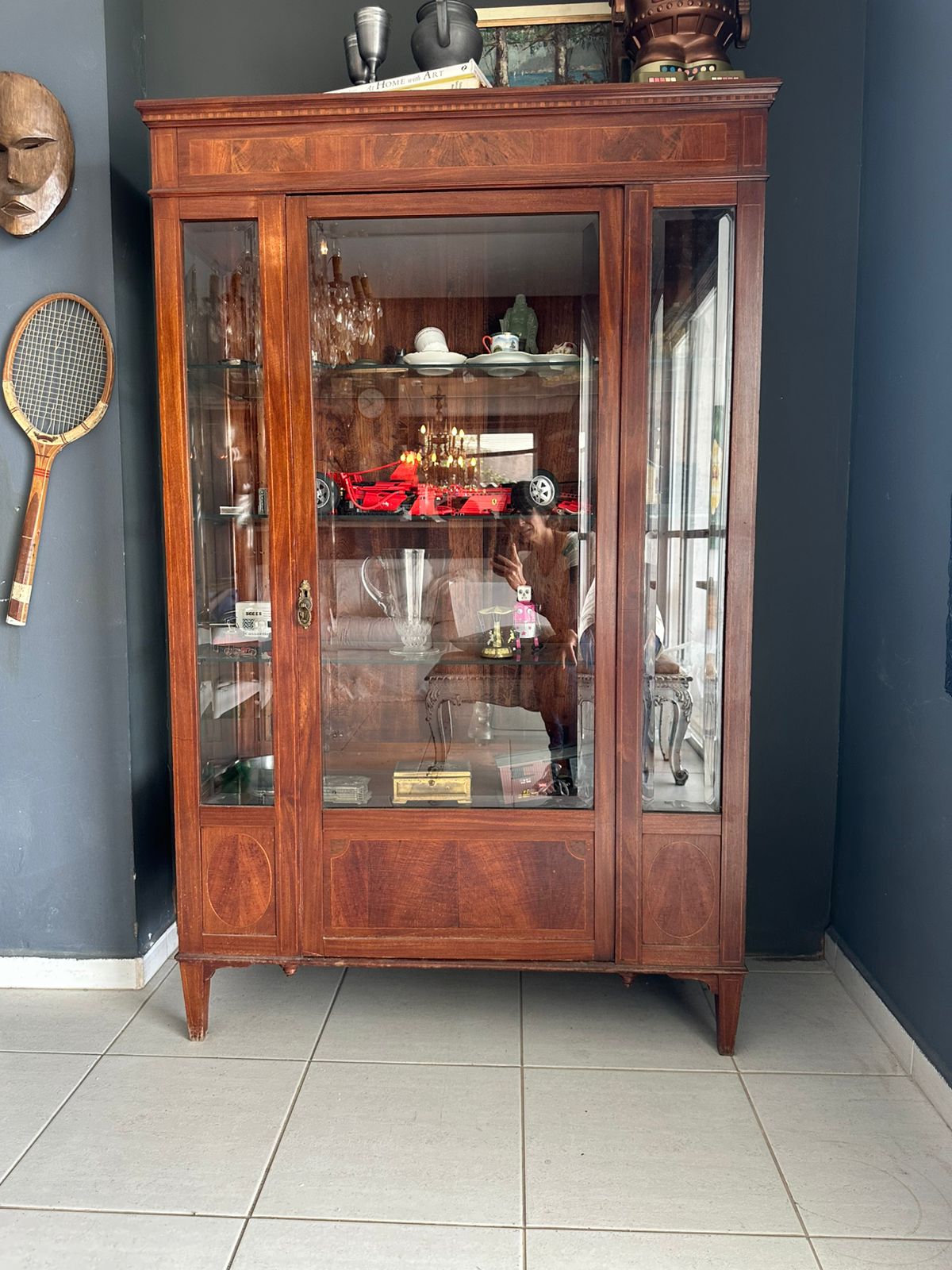 PEÇA DE ANTIQUÁRIO – CRISTALEIRA – CASA LEANDRO MARTINS – PEÇA BELÍSSIMA ! – PRATELEIRAS DE VIDRO – PORTAS COM VIDRO BISOTÊ – MADEIRA E LÂMINAS MARCHETADAS – PEÇA DE MUSEU NA SUA CASA ! — F067.07