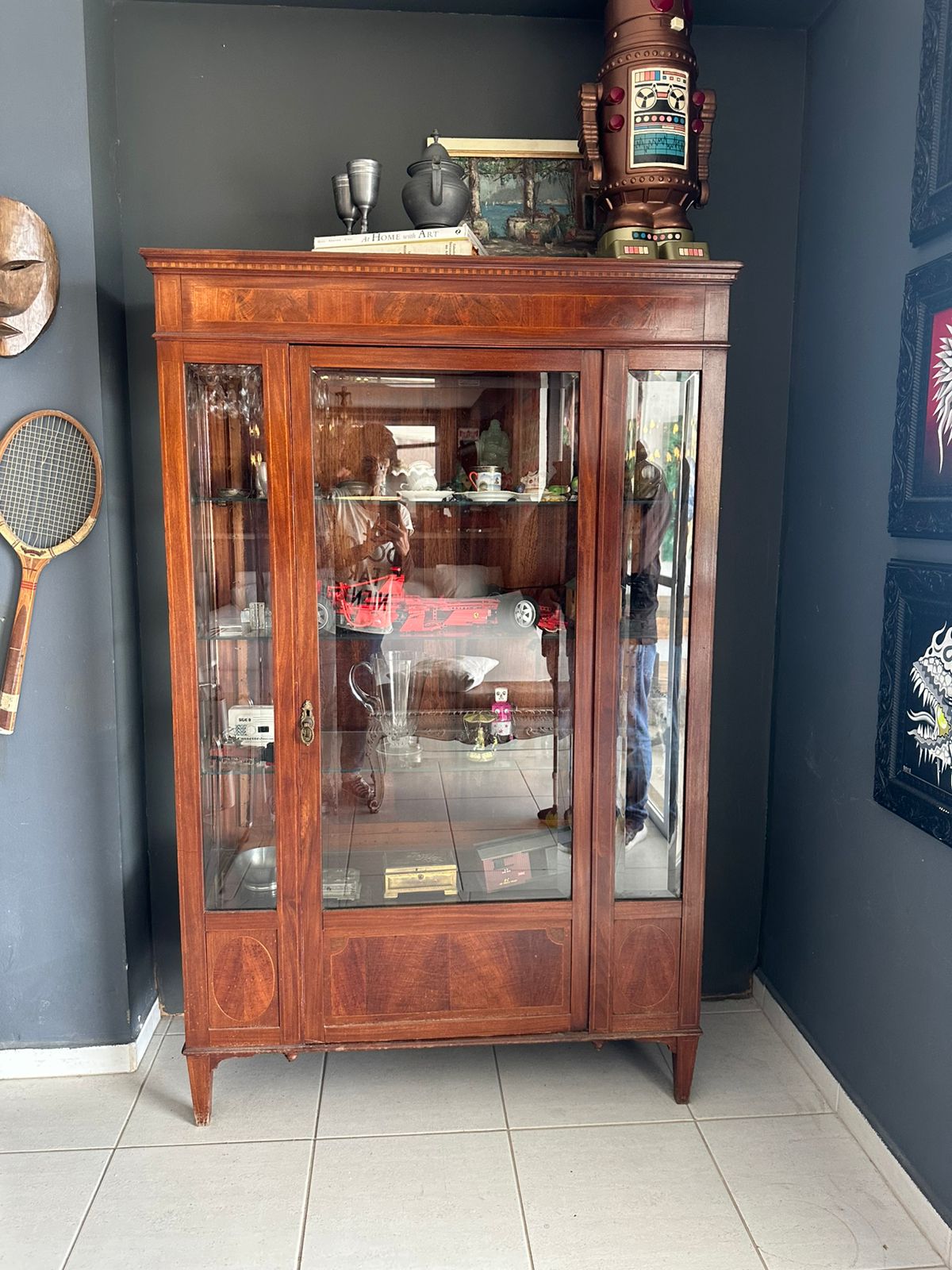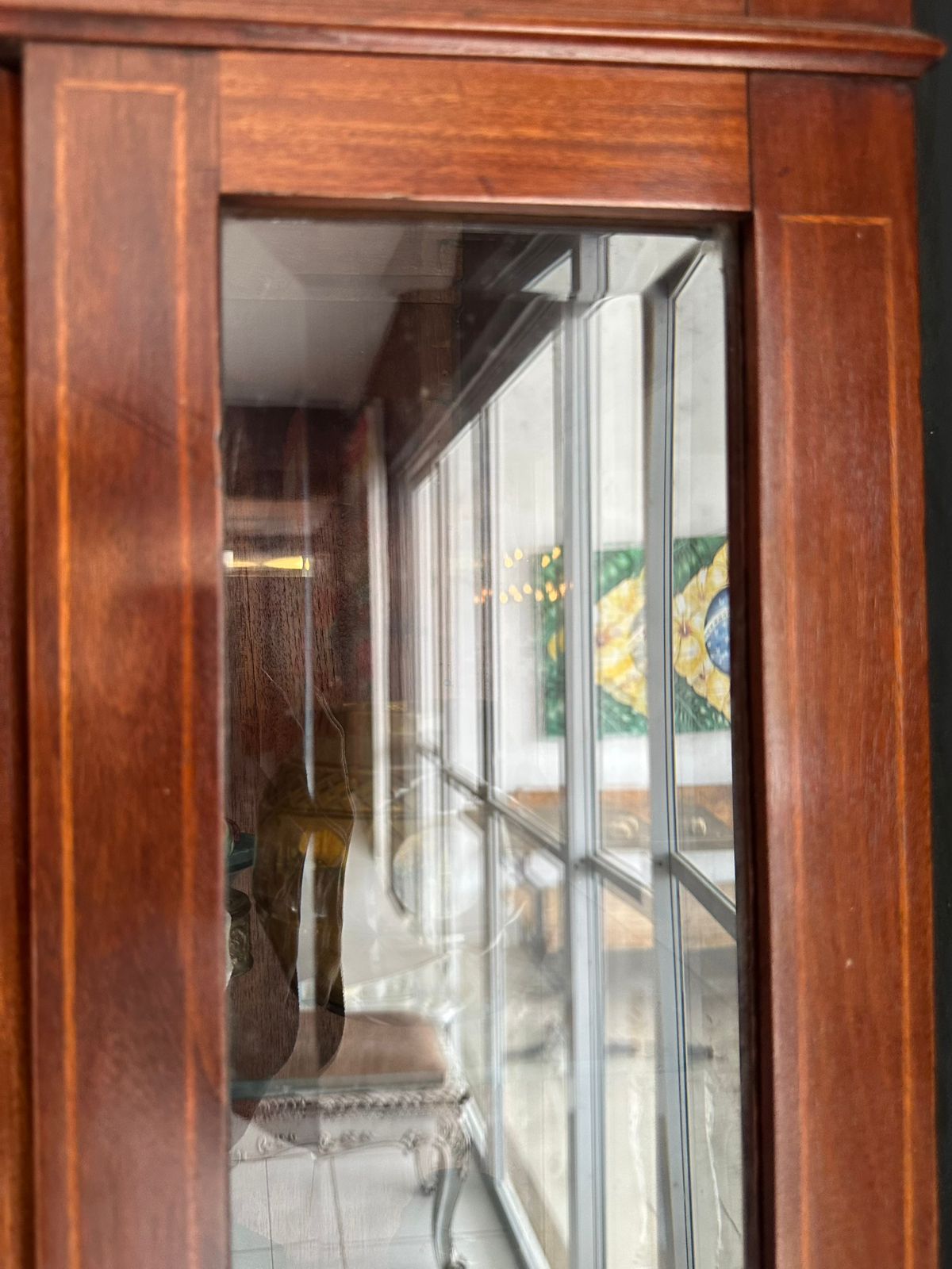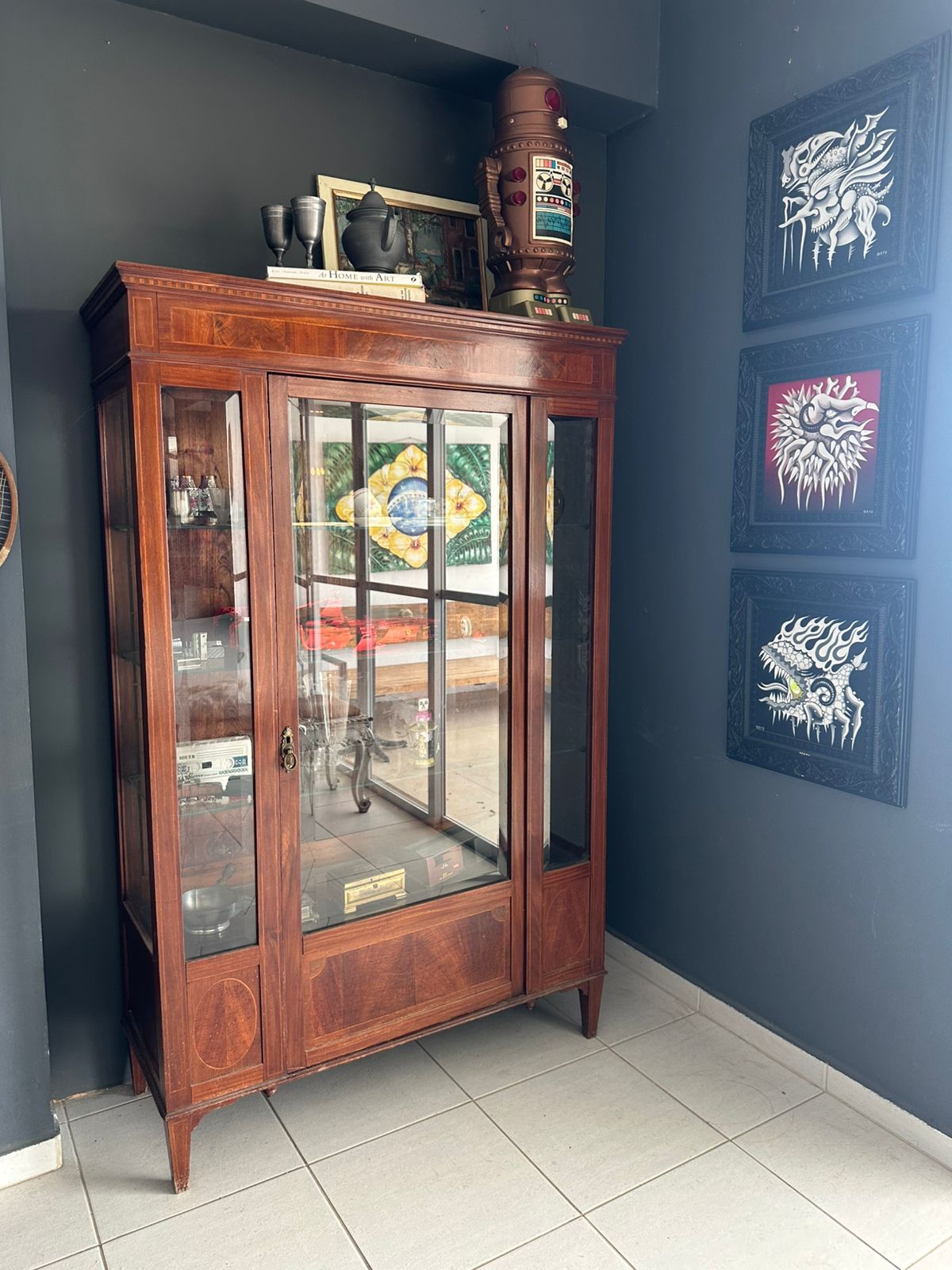 PEÇA DE ANTIQUÁRIO – CRISTALEIRA – CASA LEANDRO MARTINS – PEÇA BELÍSSIMA ! – PRATELEIRAS DE VIDRO – PORTAS COM VIDRO BISOTÊ – MADEIRA E LÂMINAS MARCHETADAS – PEÇA DE MUSEU NA SUA CASA ! — F067.07