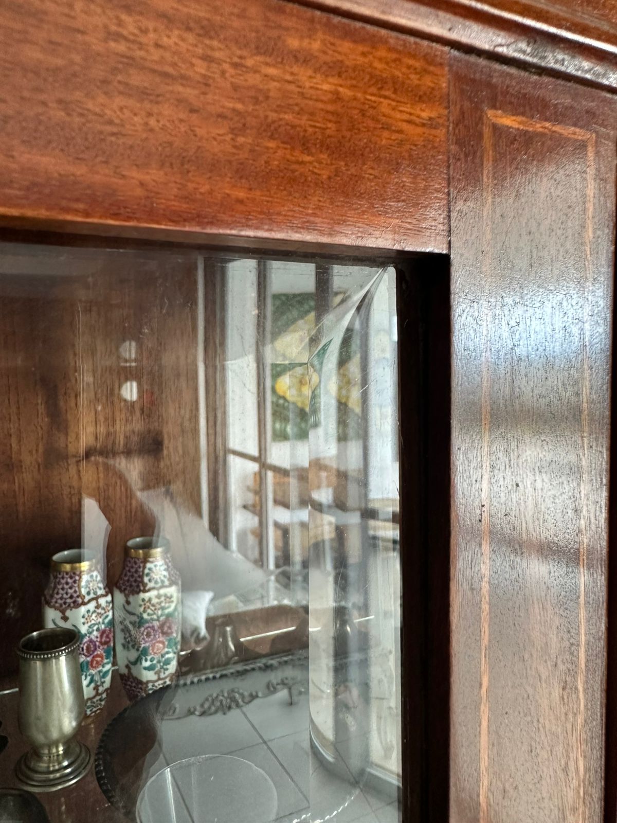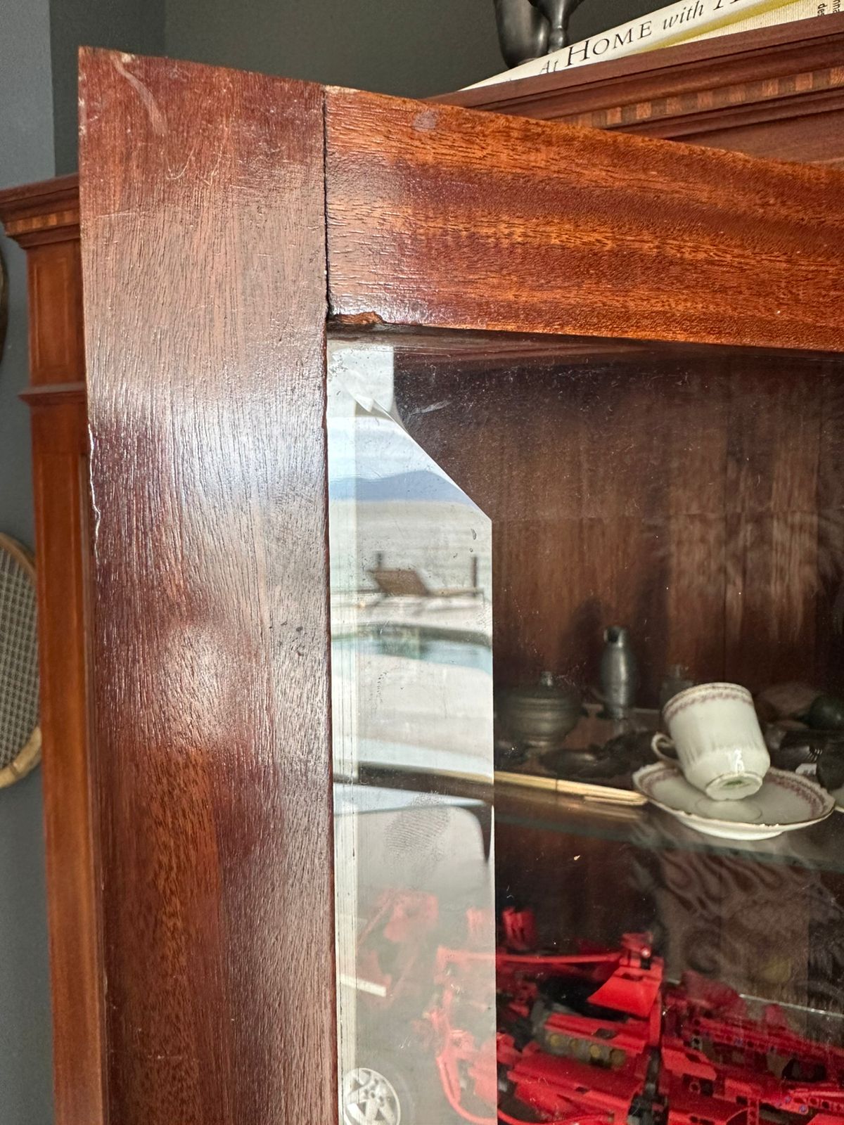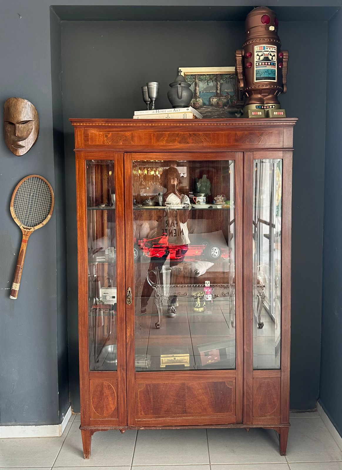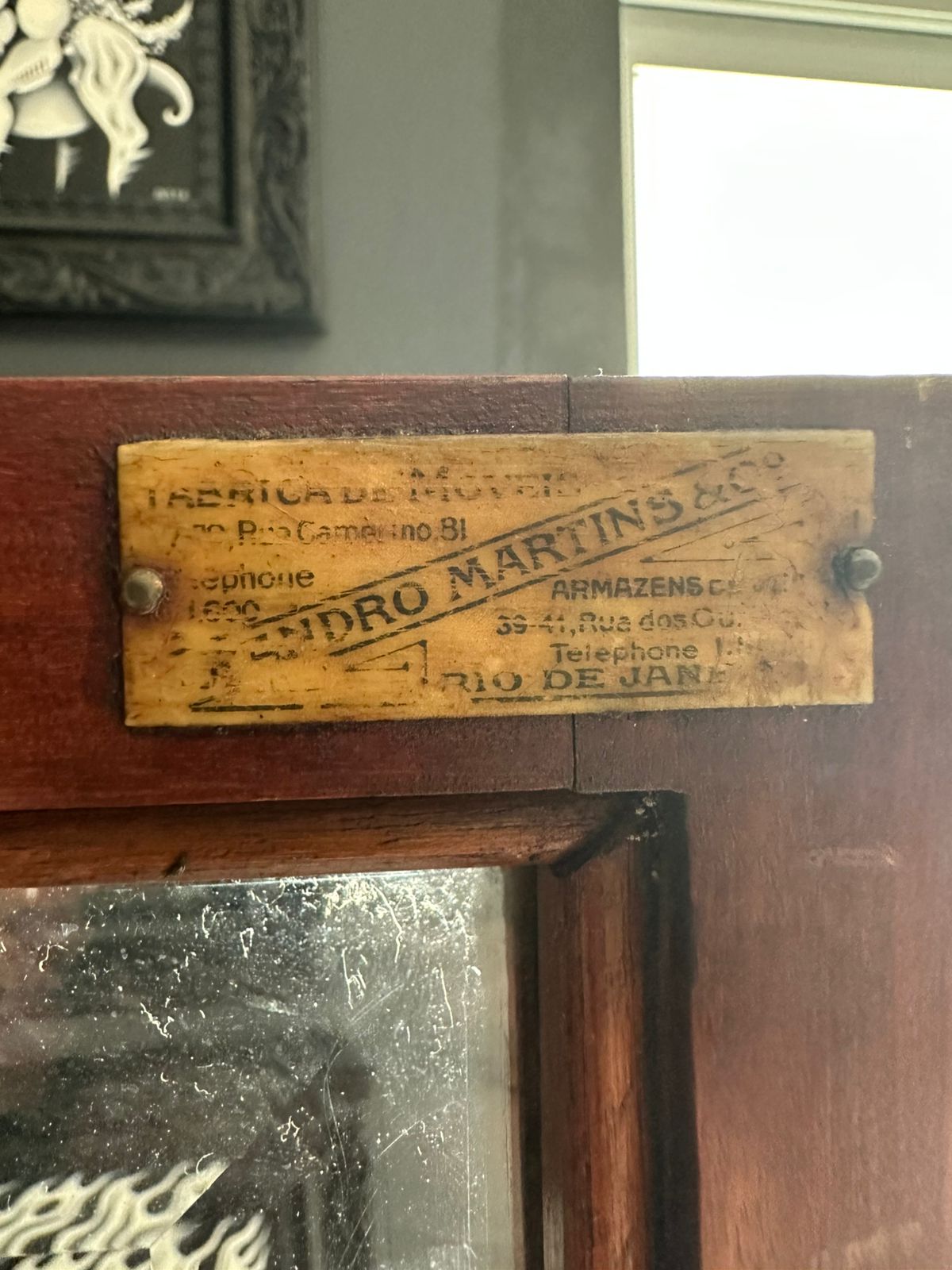 PEÇA DE ANTIQUÁRIO – CRISTALEIRA – CASA LEANDRO MARTINS – PEÇA BELÍSSIMA ! – PRATELEIRAS DE VIDRO – PORTAS COM VIDRO BISOTÊ – MADEIRA E LÂMINAS MARCHETADAS – PEÇA DE MUSEU NA SUA CASA ! — F067.07