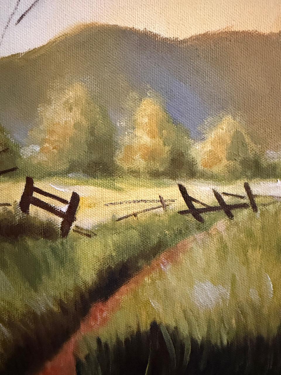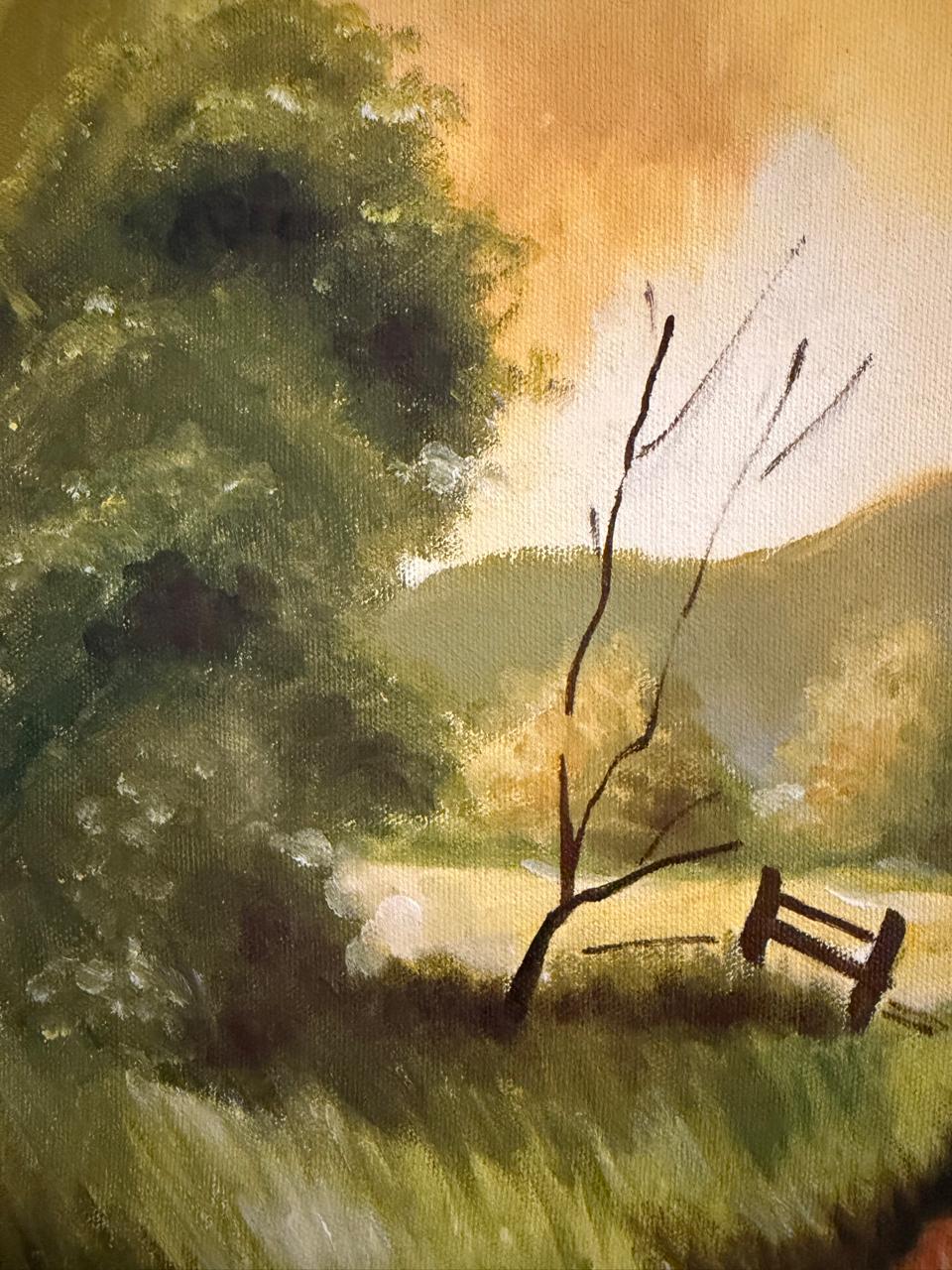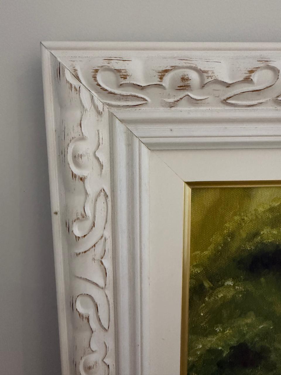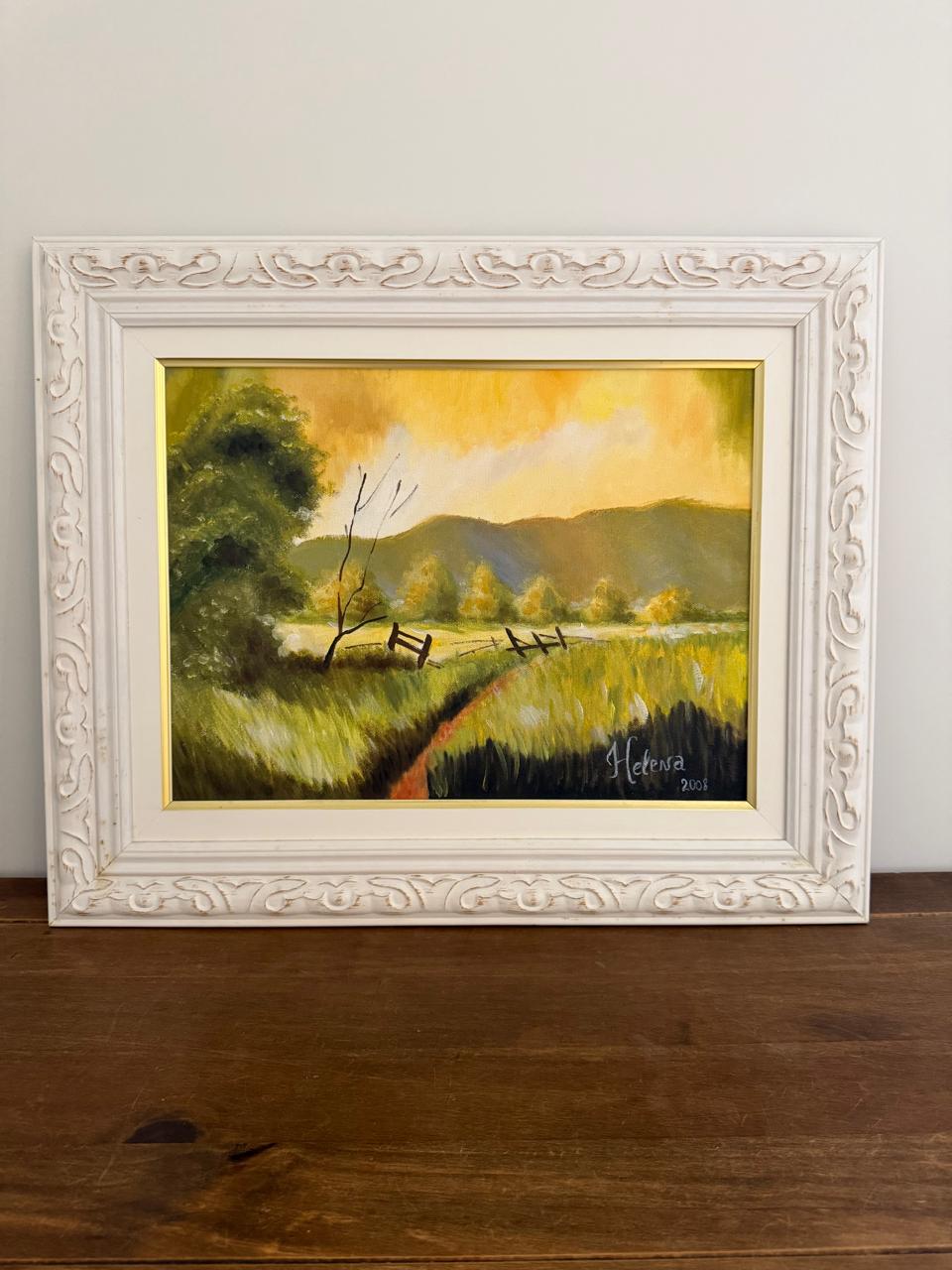 PINTURA ACRÍLICA EM EUCATEX – ARTISTA PLÁSTICA HELENA – OBRA CREPÚSCULO – MOLDURA COM PÁTINA BRANCA— B050.11